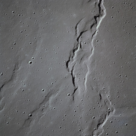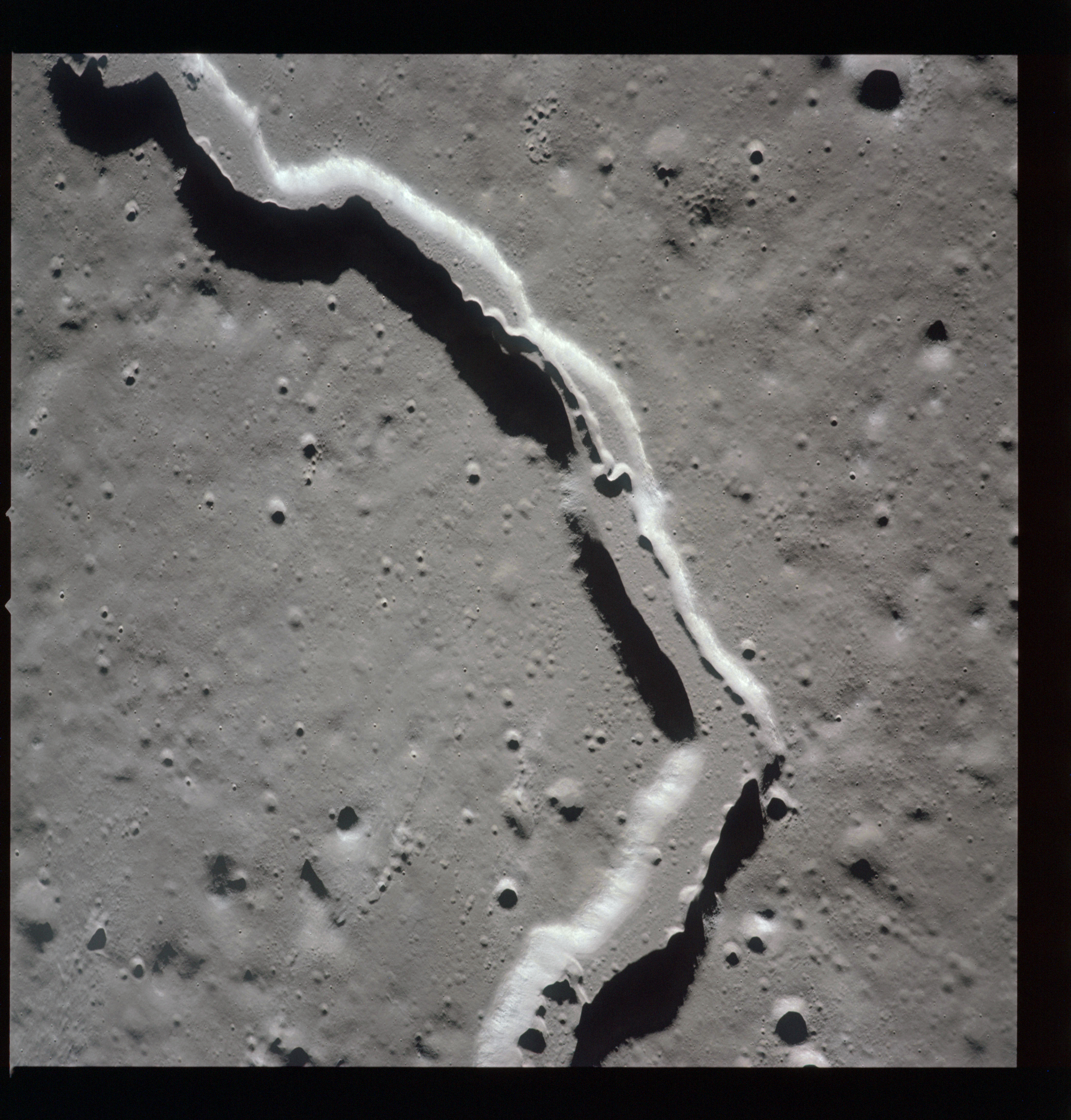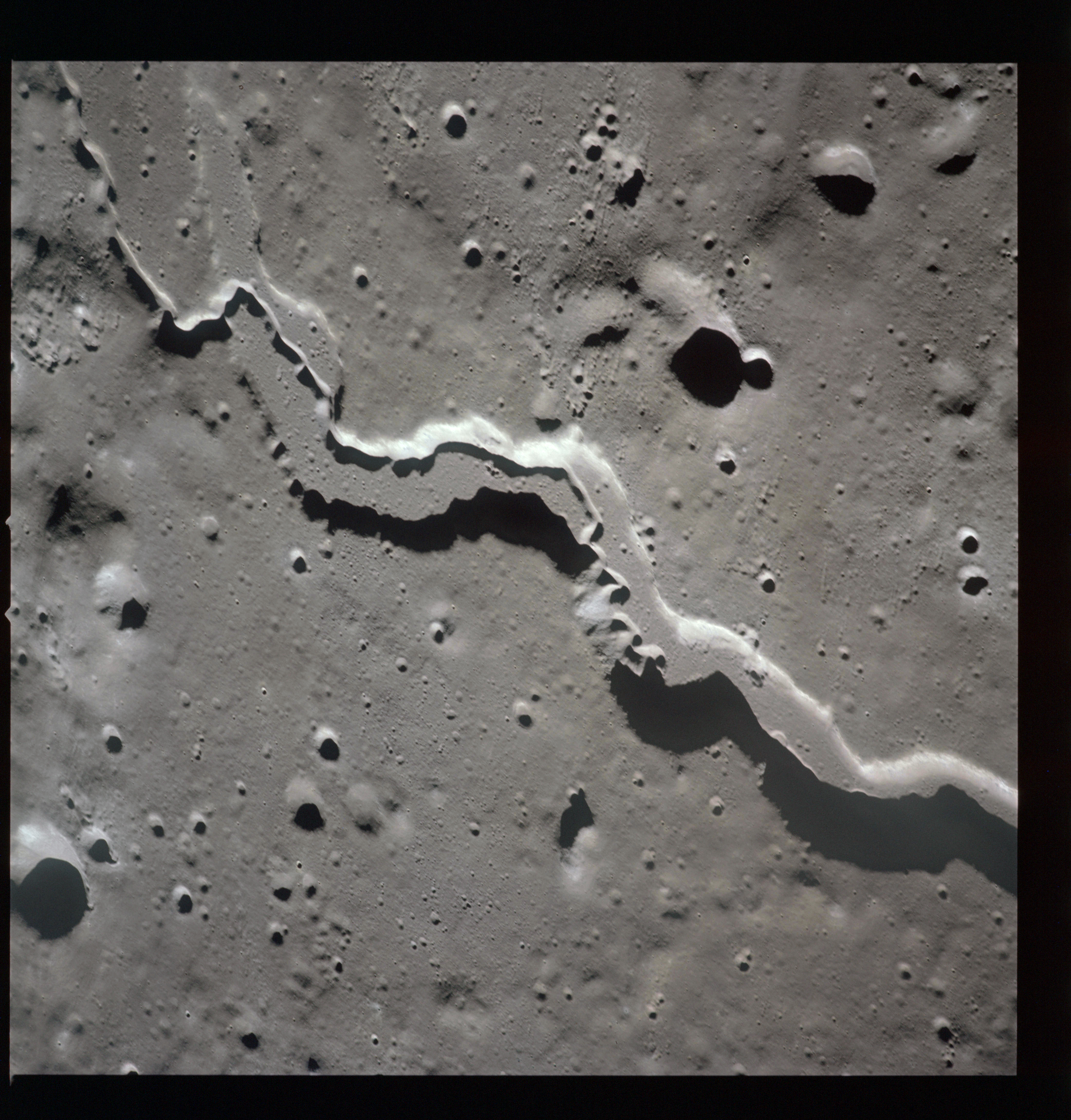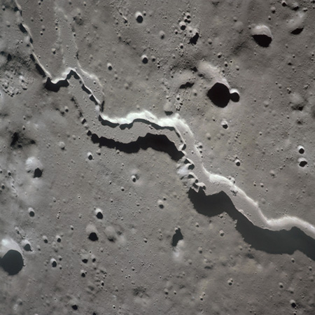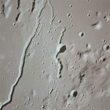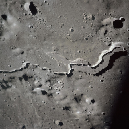The valley is visible from Earth with even a small telescope but it took spacecraft to reveal the smaller meandering rille within. When compared to the bulk of the rille, the Cobra Head is very heavily pitted with craters. These are secondary impacts from the ejecta thrown out by Aristarchus a few dozen kilometres to the left and much younger than the rille. While Schröter's Valley is about 3 aeons old, Aristarchus' age is "only" about ½ an aeon or less. The composite was produced from frames AS15-97-13256 to 13263. Paul Spudis is a geologist at the Lunar and Planetary Institute in Houston and we discussed the sinuous rilles.