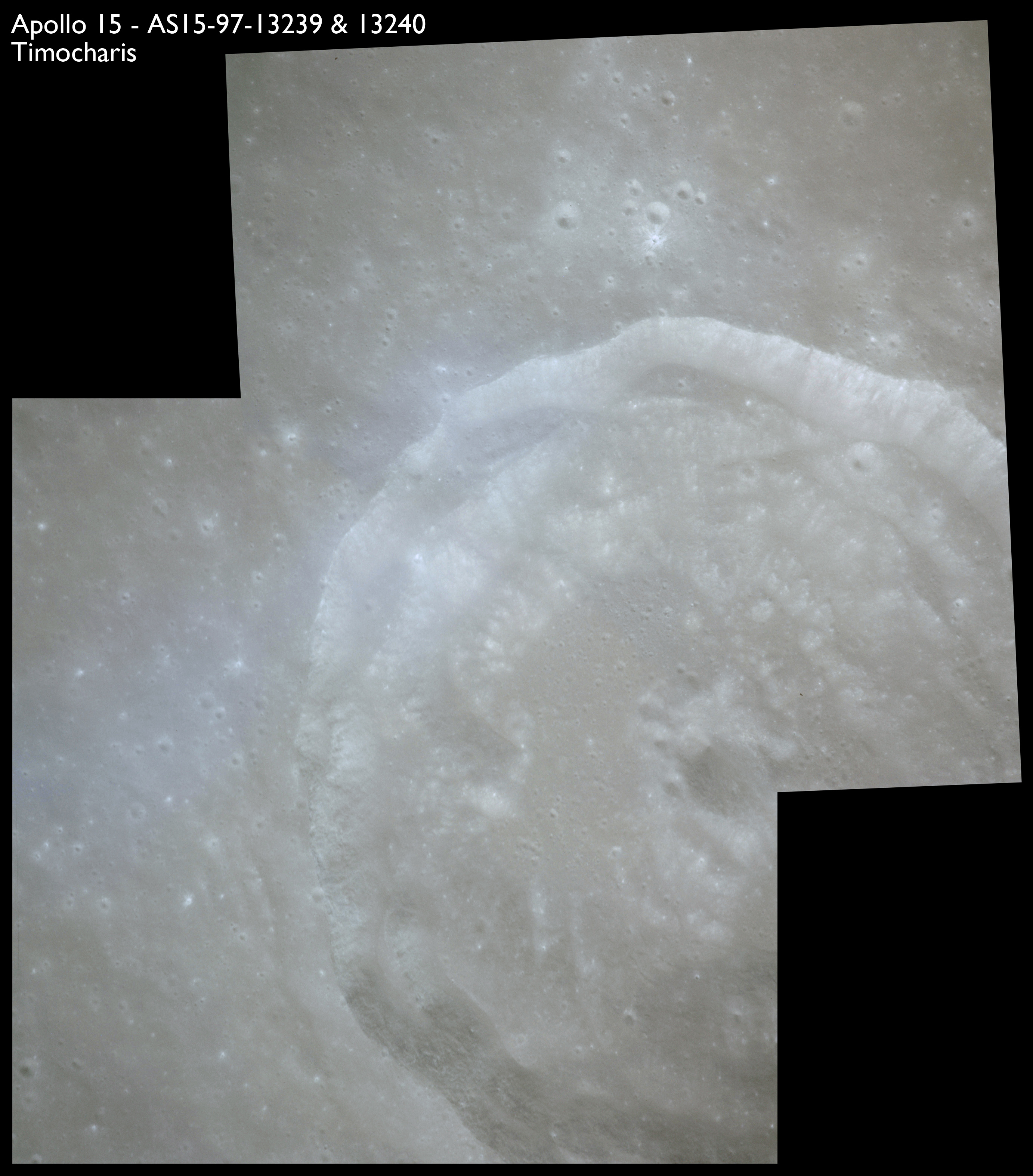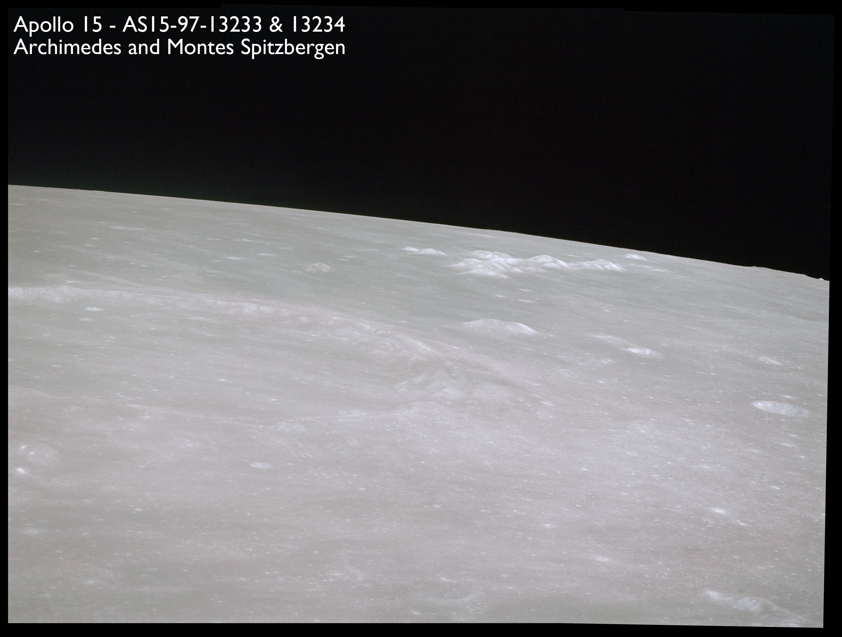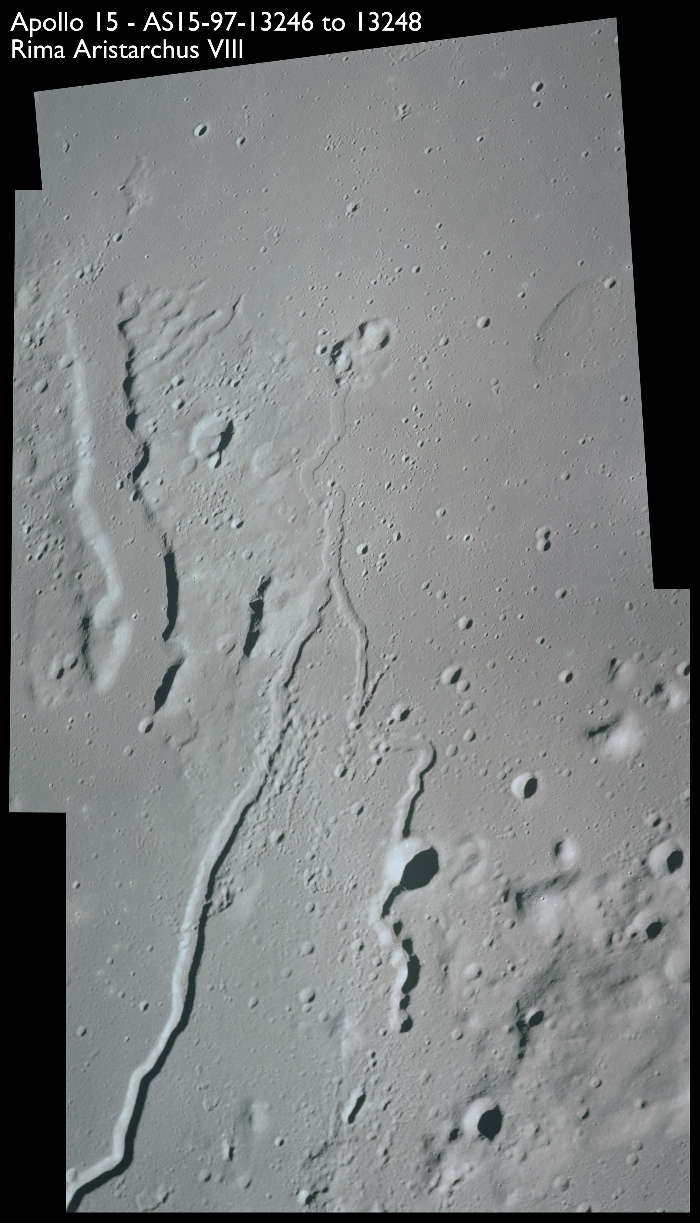 Linear features that are sunken are called "rima" and these images, AS15-97-13246 to 13248 show examples of this type, particularly Rima Archimedes VIII running from bottom-left in this composite. This author (Woods) believes the large cleft to the left is the inundated remains of a much older and wider rille which may have been somewhat similar to Vallis Schröteri which the crew will photograph soon. Part of Montes Agricola is seen running across the next pair of photos, AS15-97-13249 and 13250. The northern edge of the Aristarchus plateau runs along the bottom of 13249.