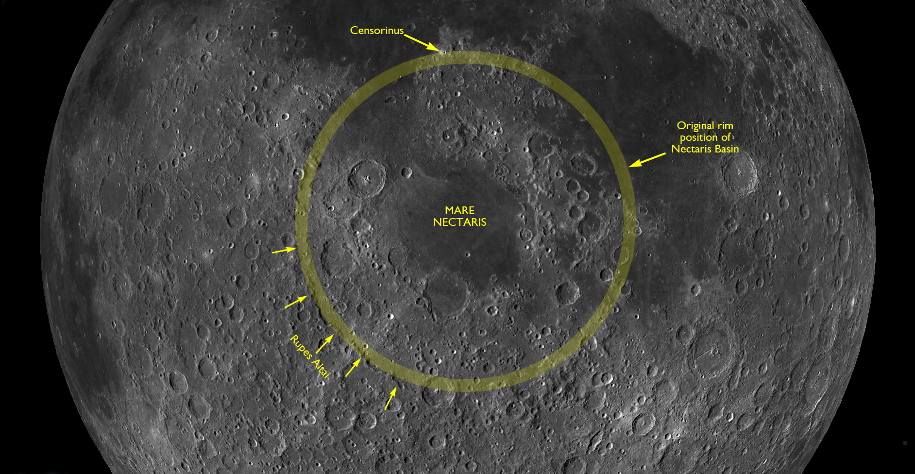 A composite of these two frames shows the 9.6-km Naumann at the bottom and the complex of wrinkle ridges that cross Oceanus Procellarum.