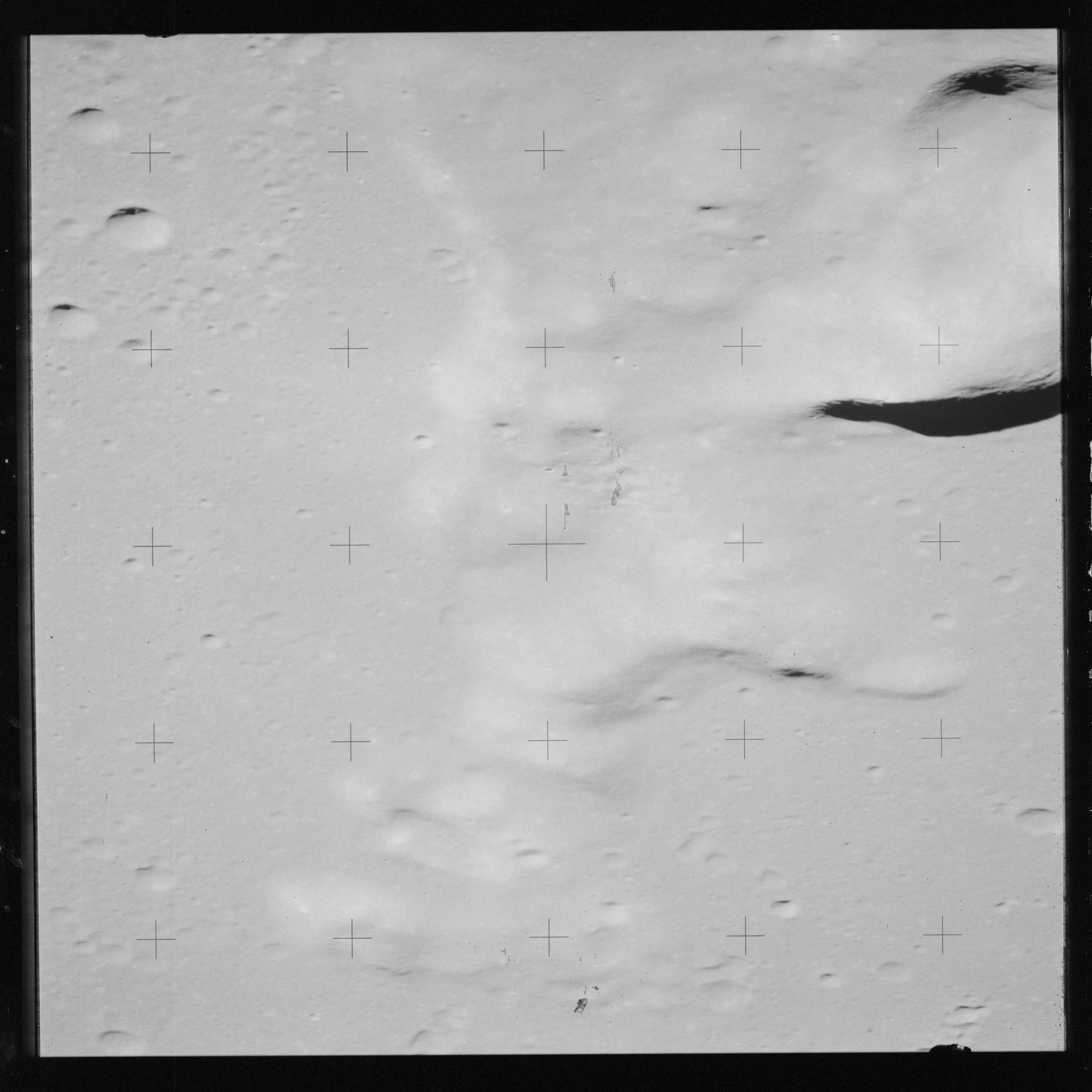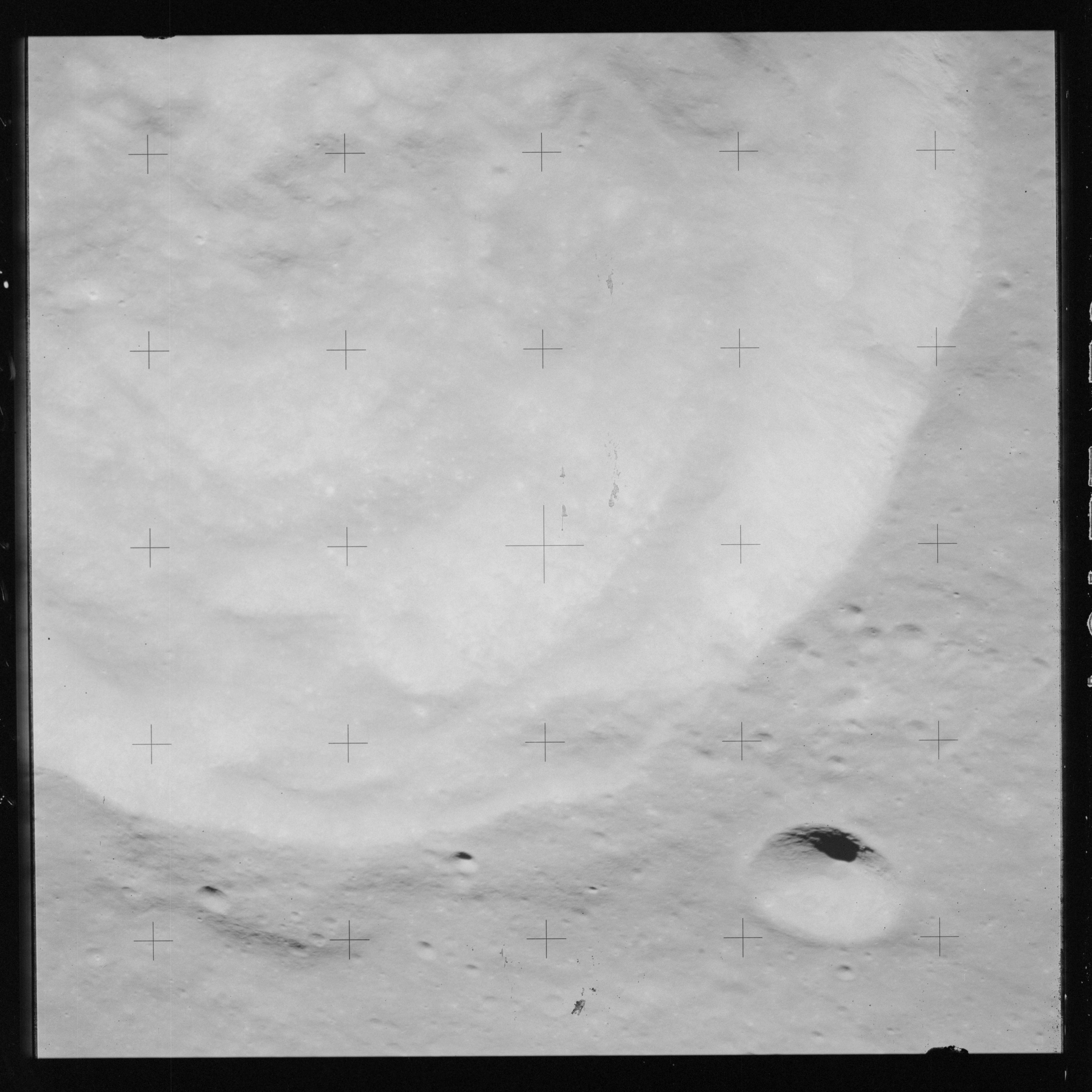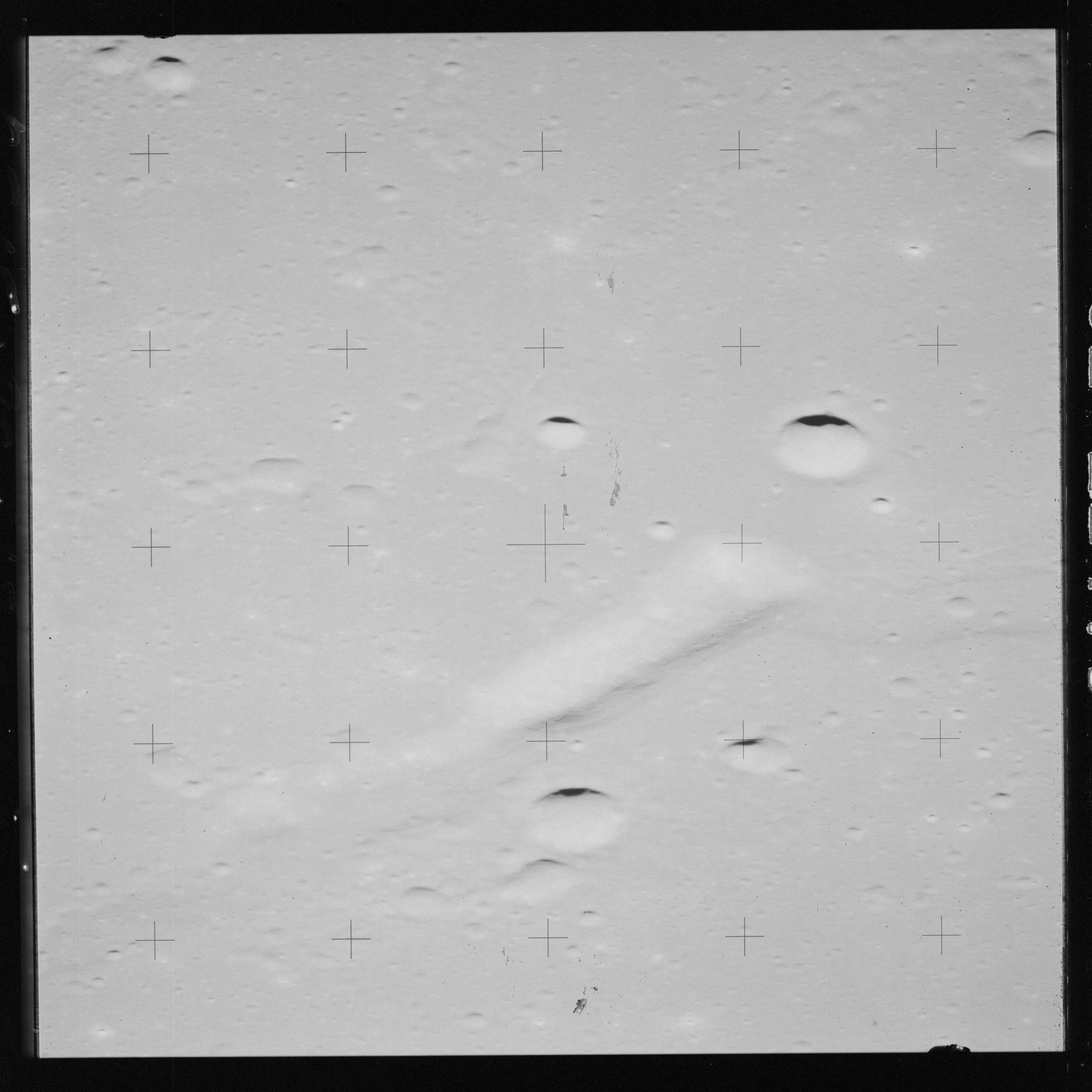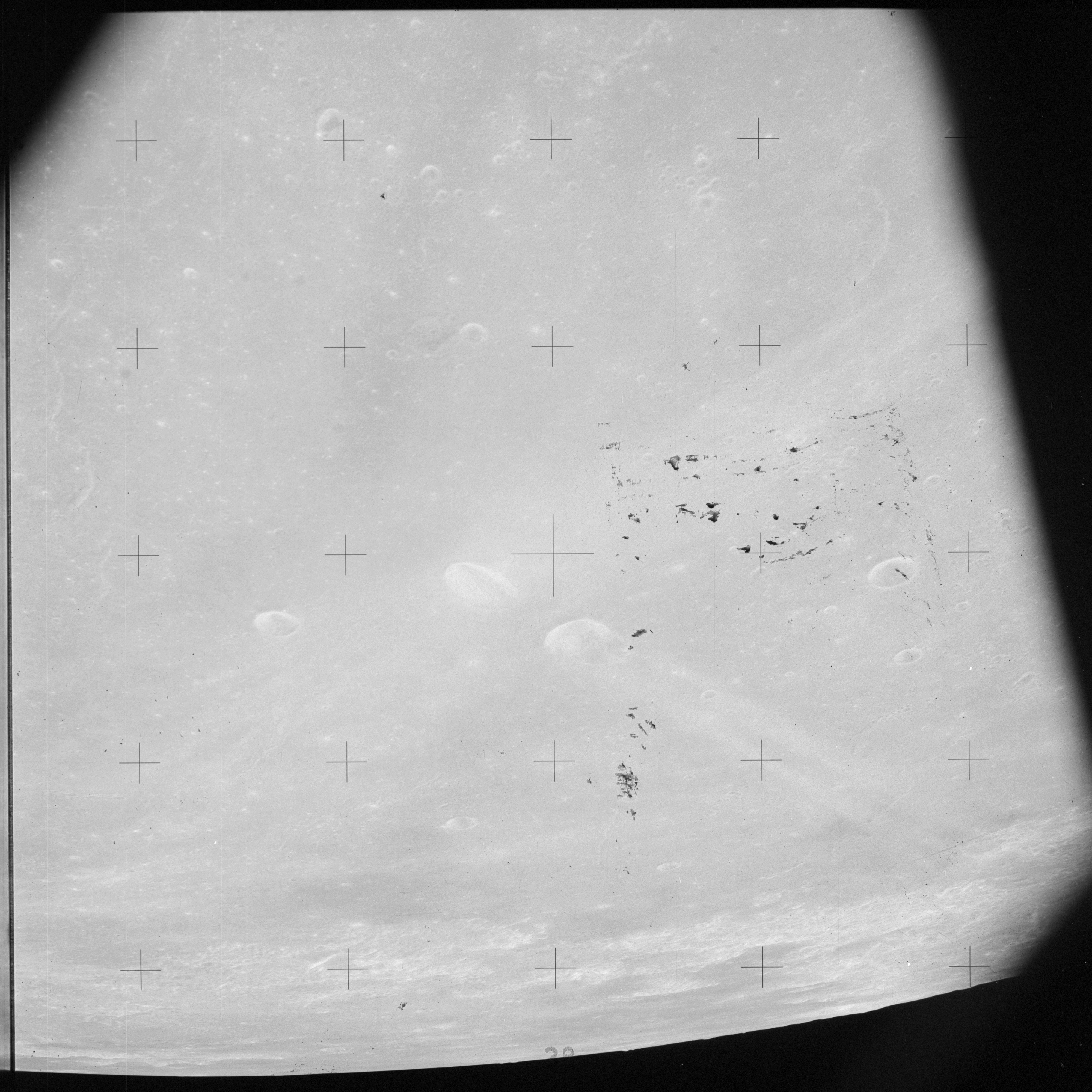 Taken slightly later on black and white magazine PP and using the wide-angle 60-mm lens are AS15-90-12317 and 12318. These also look northeast over the Mare with the Messier crater pair in the distance. The dirt on the camera's Réseau plate continues to mar its images.