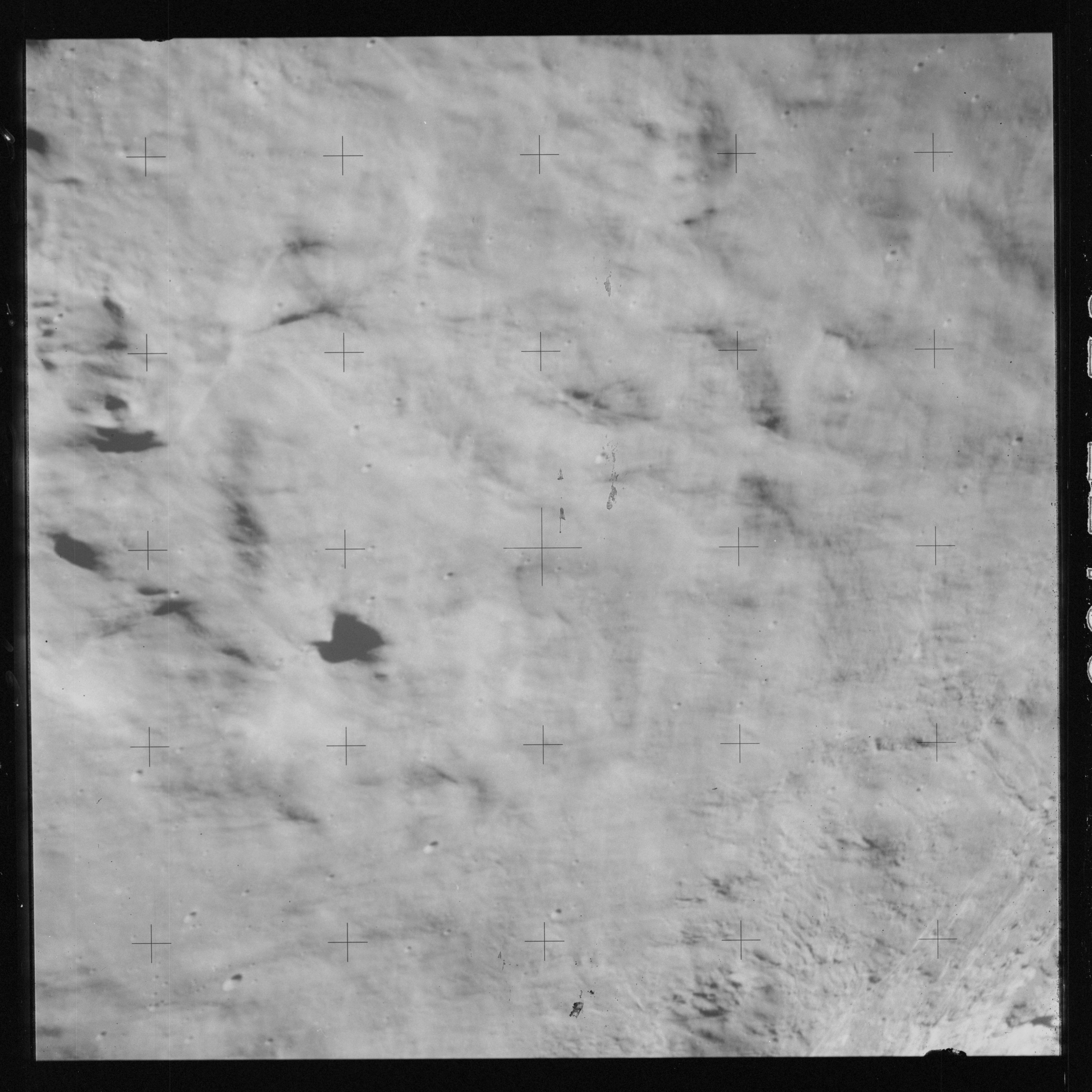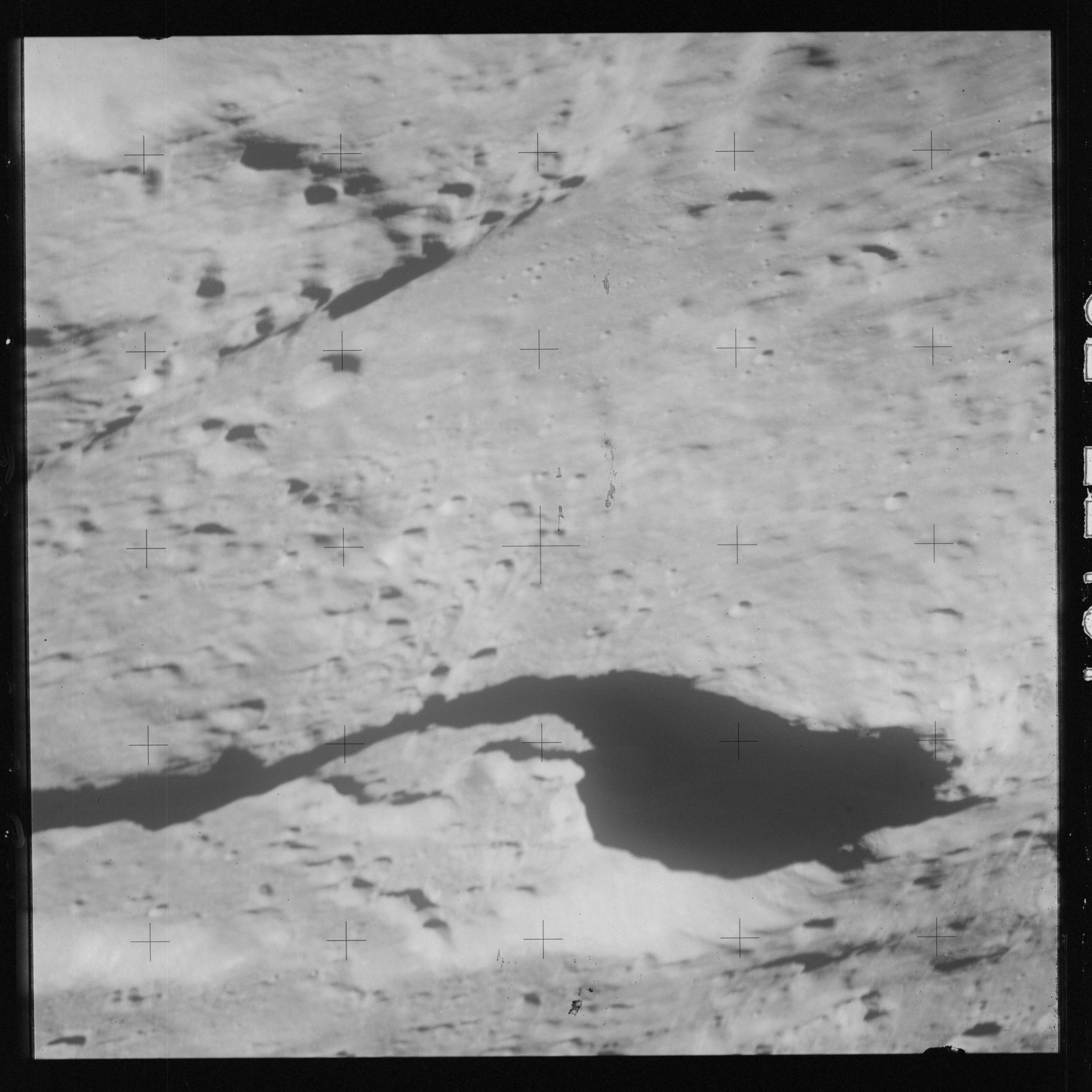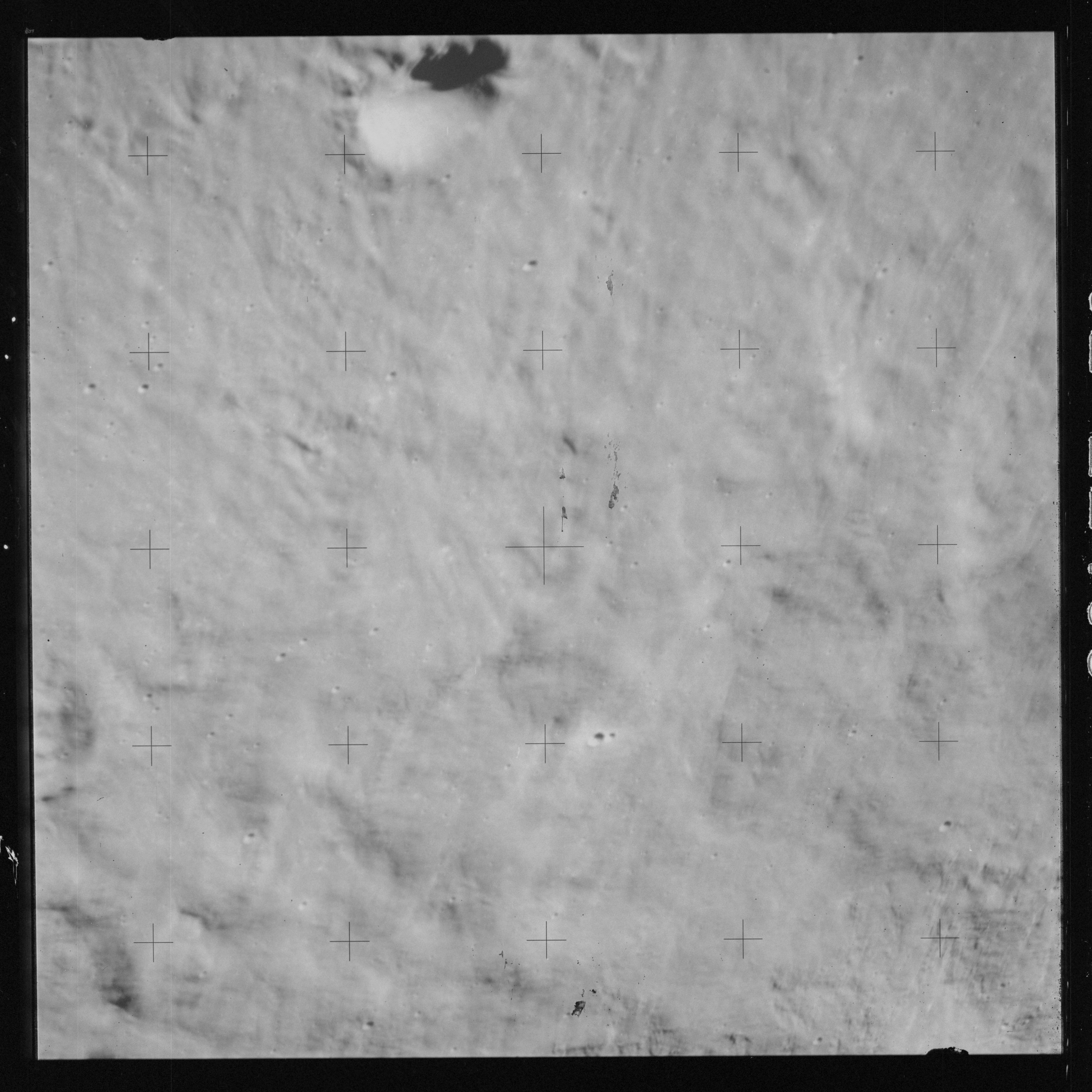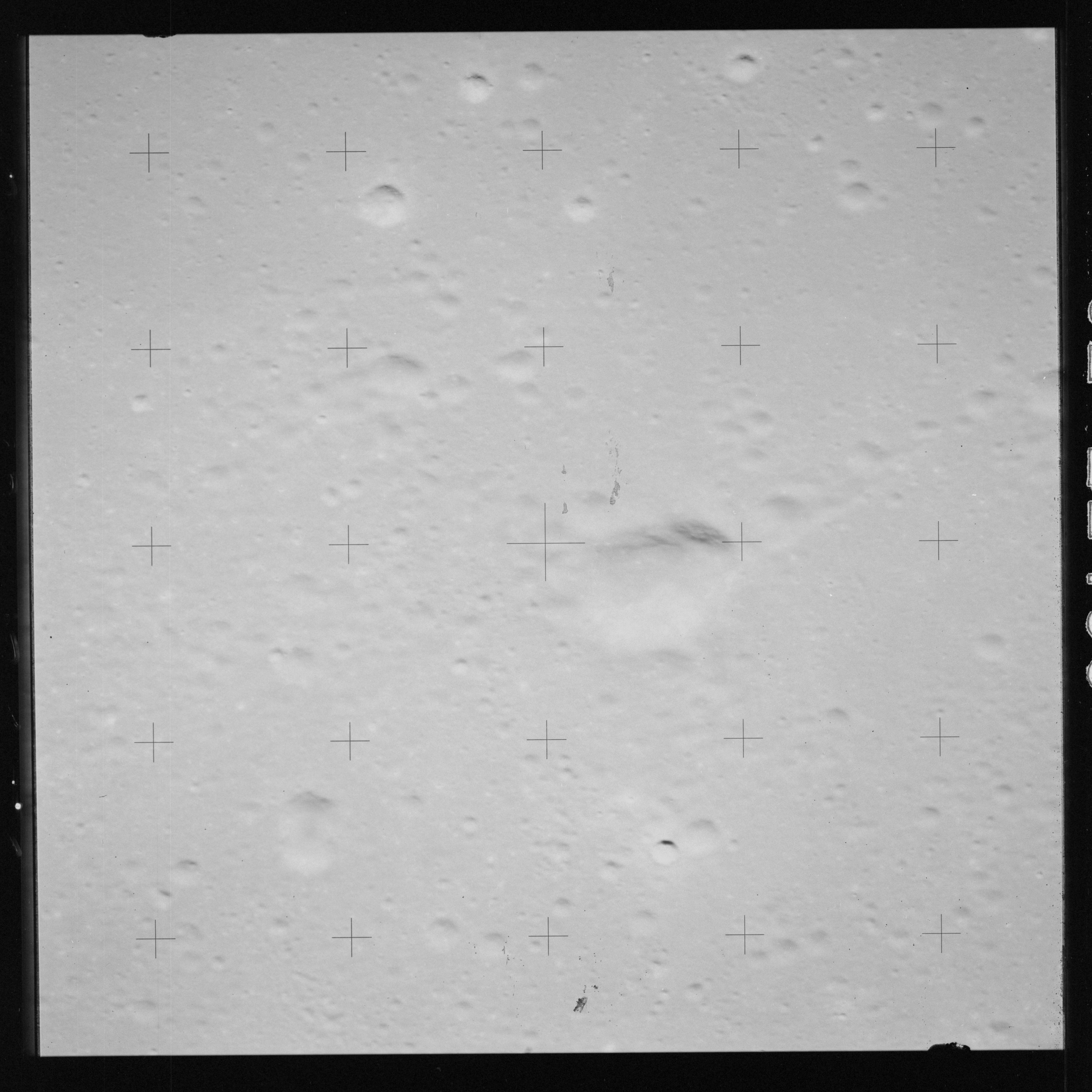 Taken slightly later on black and white magazine PP and using the wide-angle 60-mm lens are AS15-90-12317 and 12318. These also look northeast over the Mare with the Messier crater pair in the distance. The dirt on the camera's Réseau plate continues to mar its images.