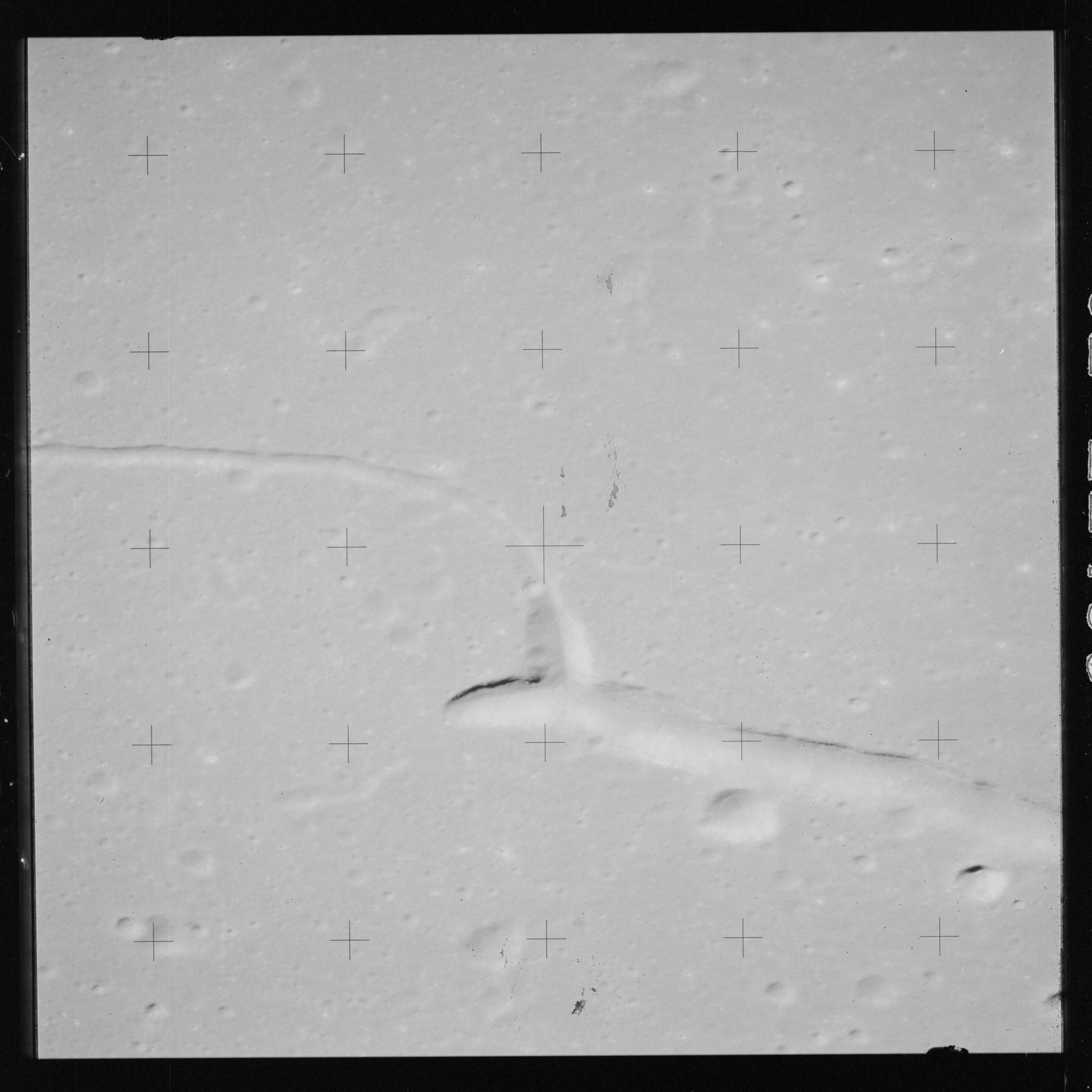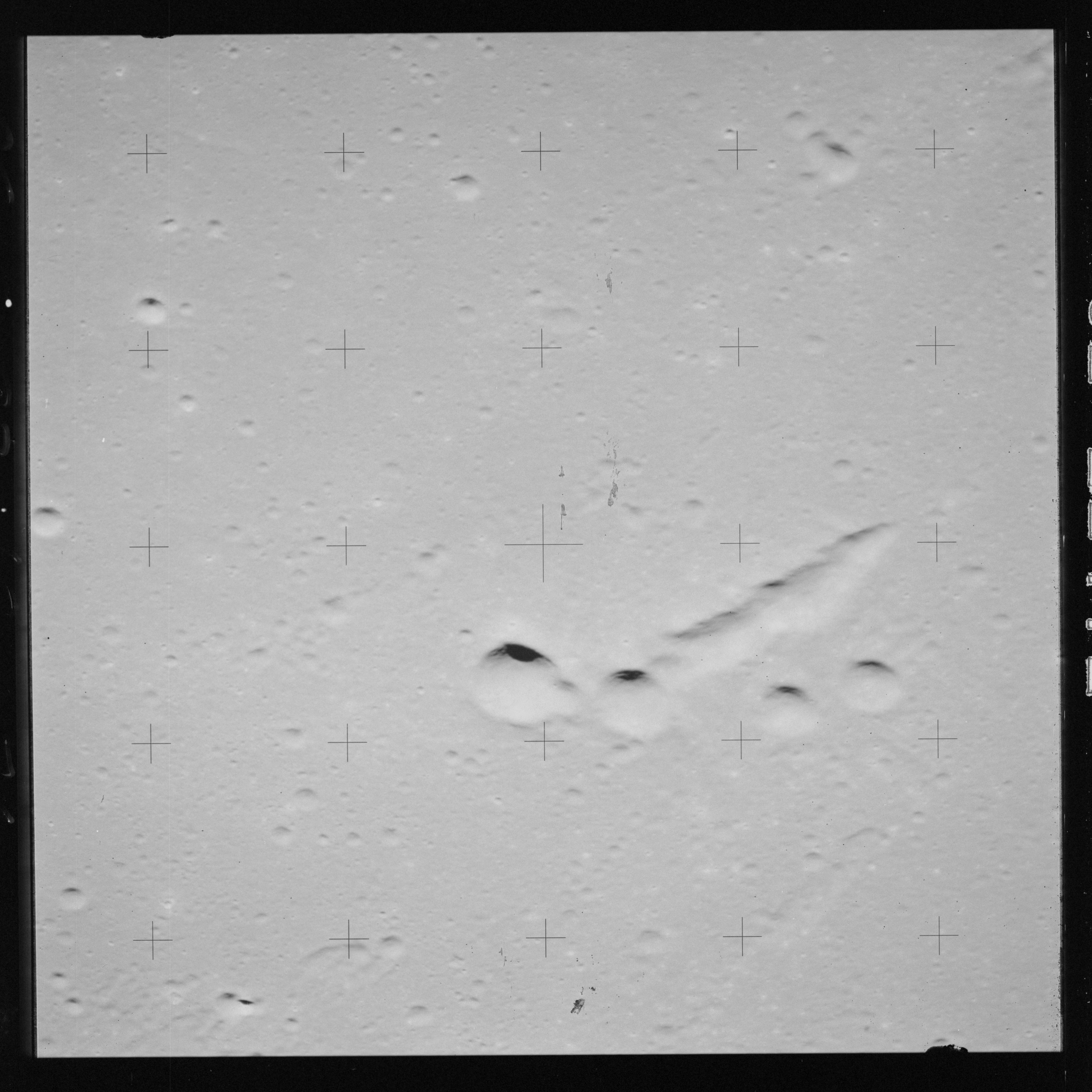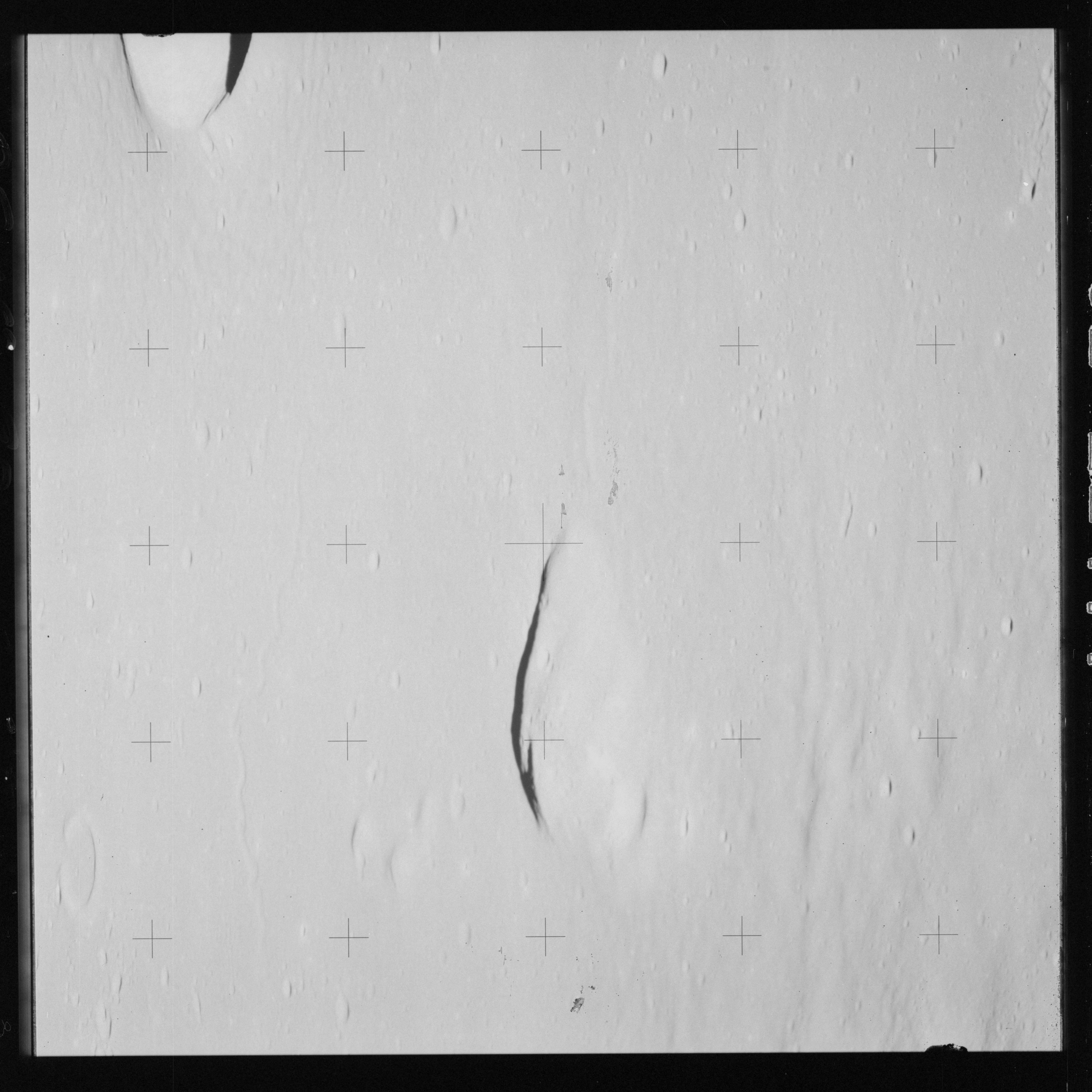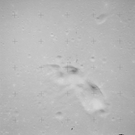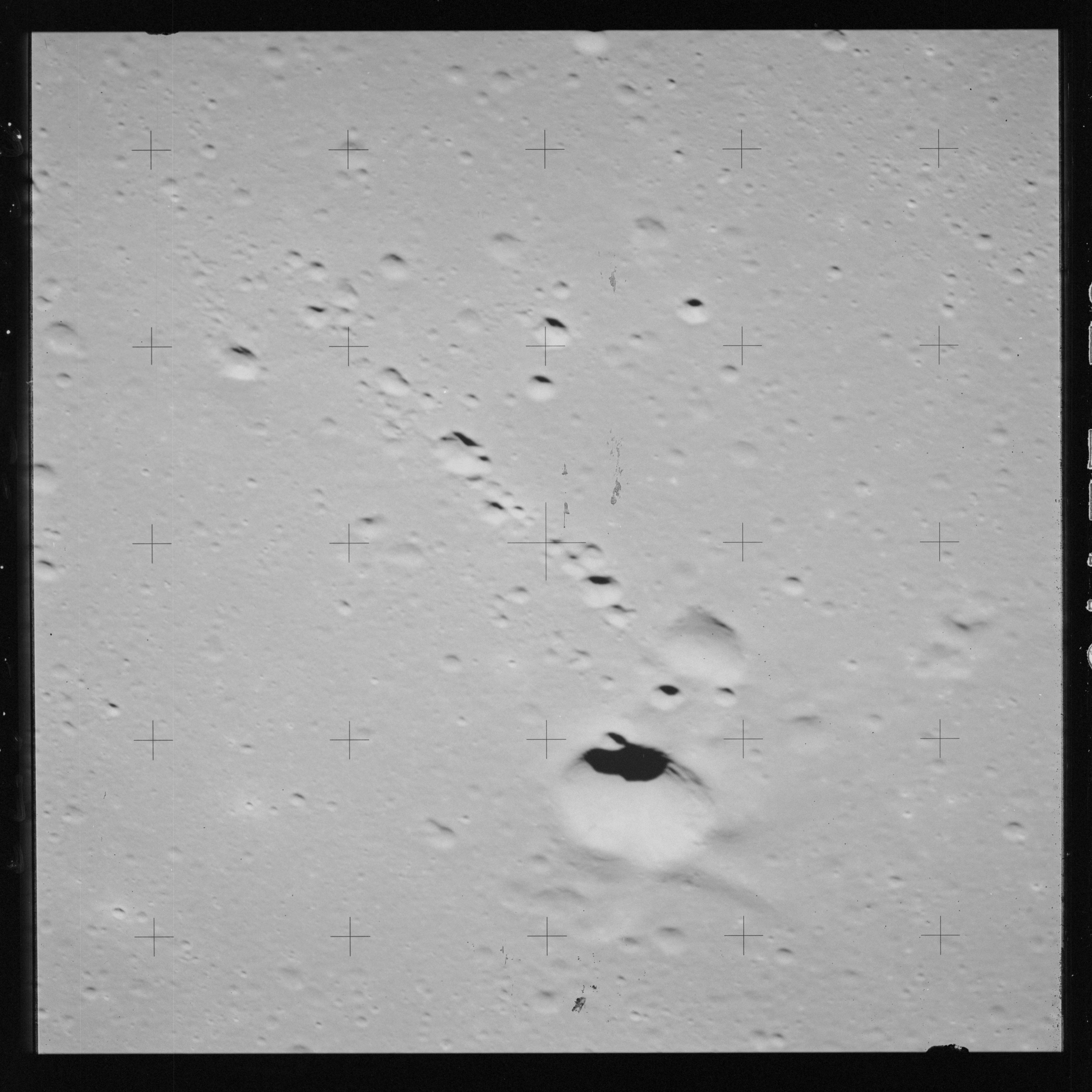 Taken slightly later on black and white magazine PP and using the wide-angle 60-mm lens are AS15-90-12317 and 12318. These also look northeast over the Mare with the Messier crater pair in the distance. The dirt on the camera's Réseau plate continues to mar its images.