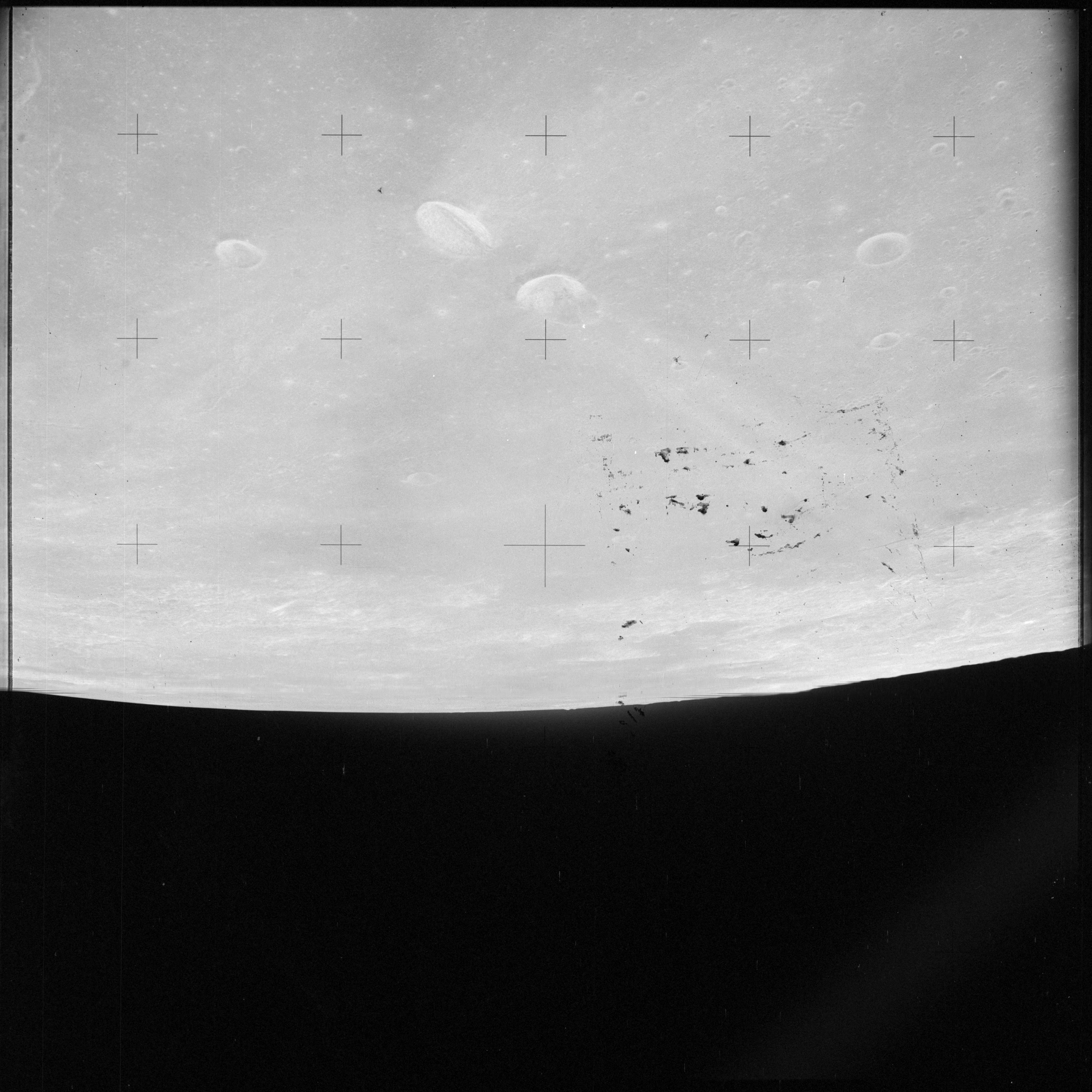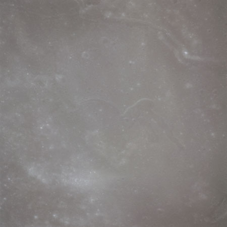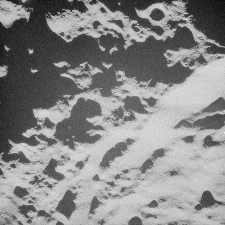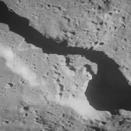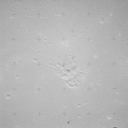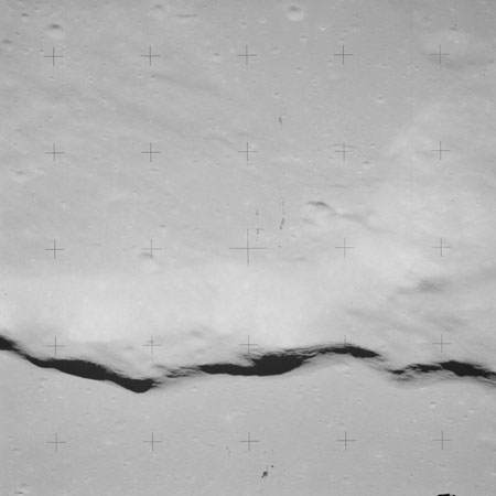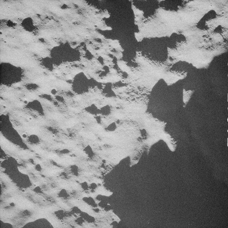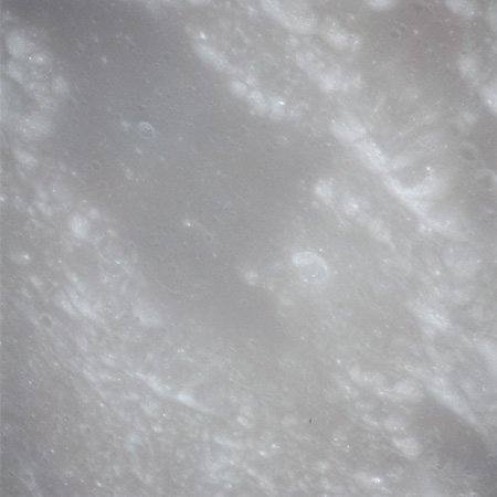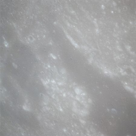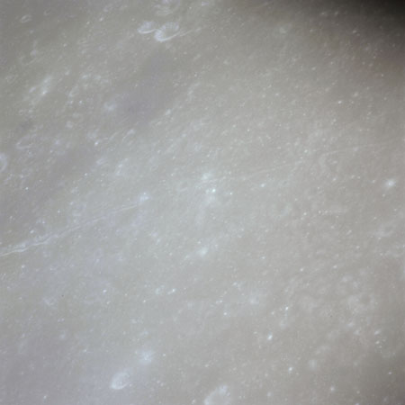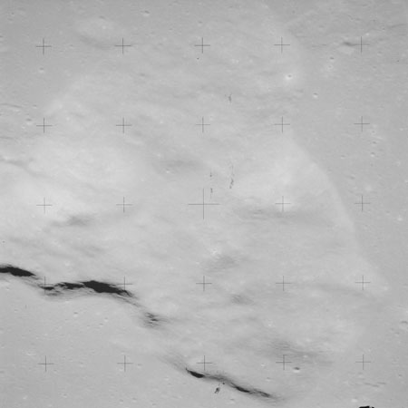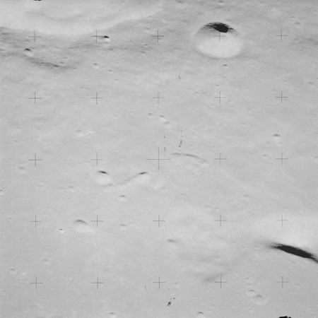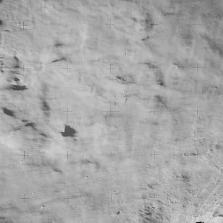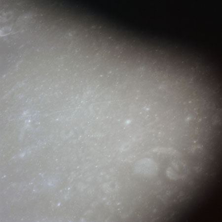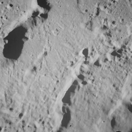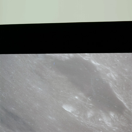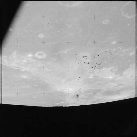 When the terminator does arrive, the Mapping Camera is started, its PAD T-start time being 214:20:03. In this pass it will take 143 frames between the sunset and sunrise terminators, about one frame every 25 seconds. These are AS15-M-2351 to 2493 and they will be looking directly downwards. Beginning with AS15-M-2354, every tenth image from this sequence will be presented here.