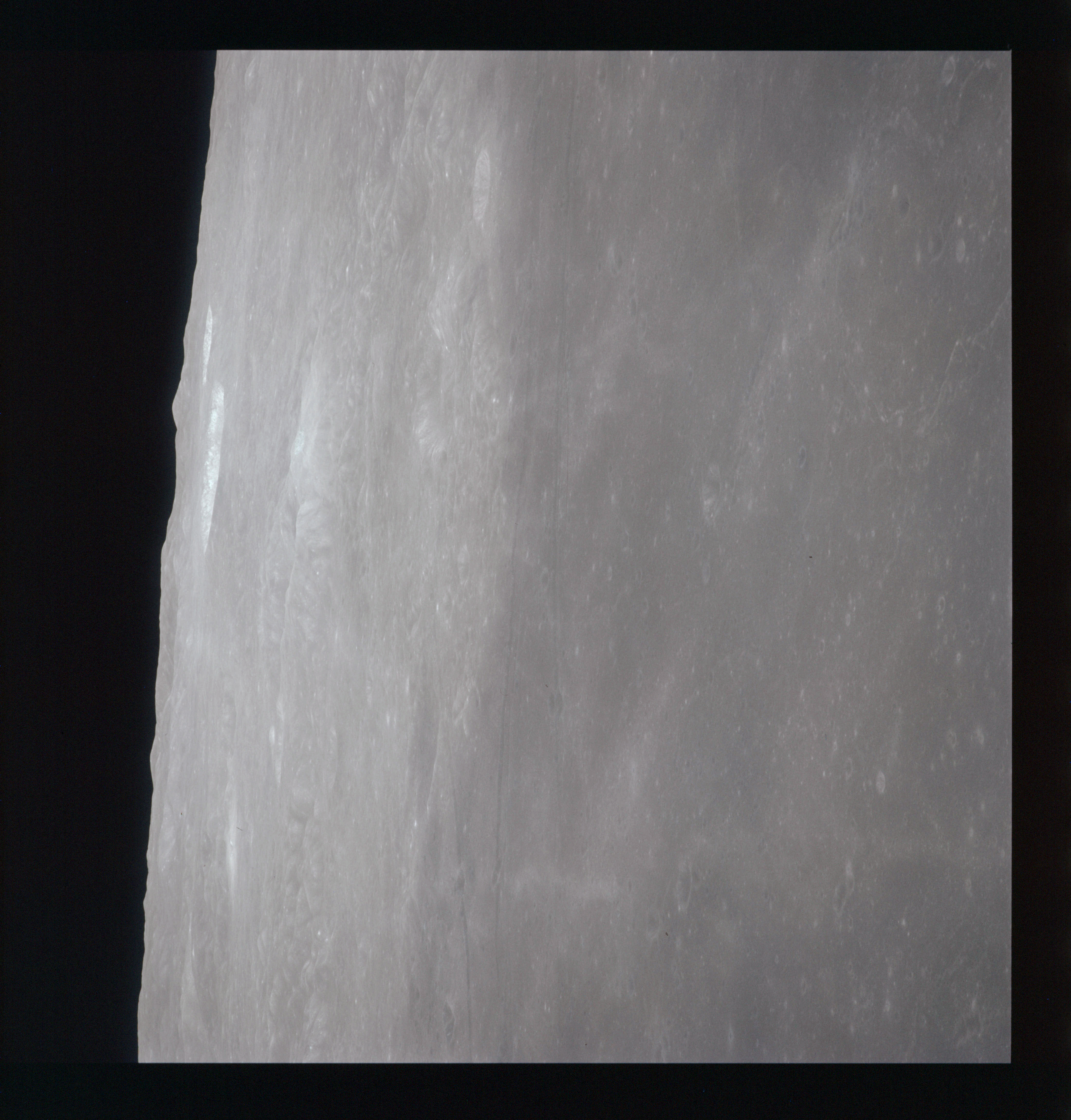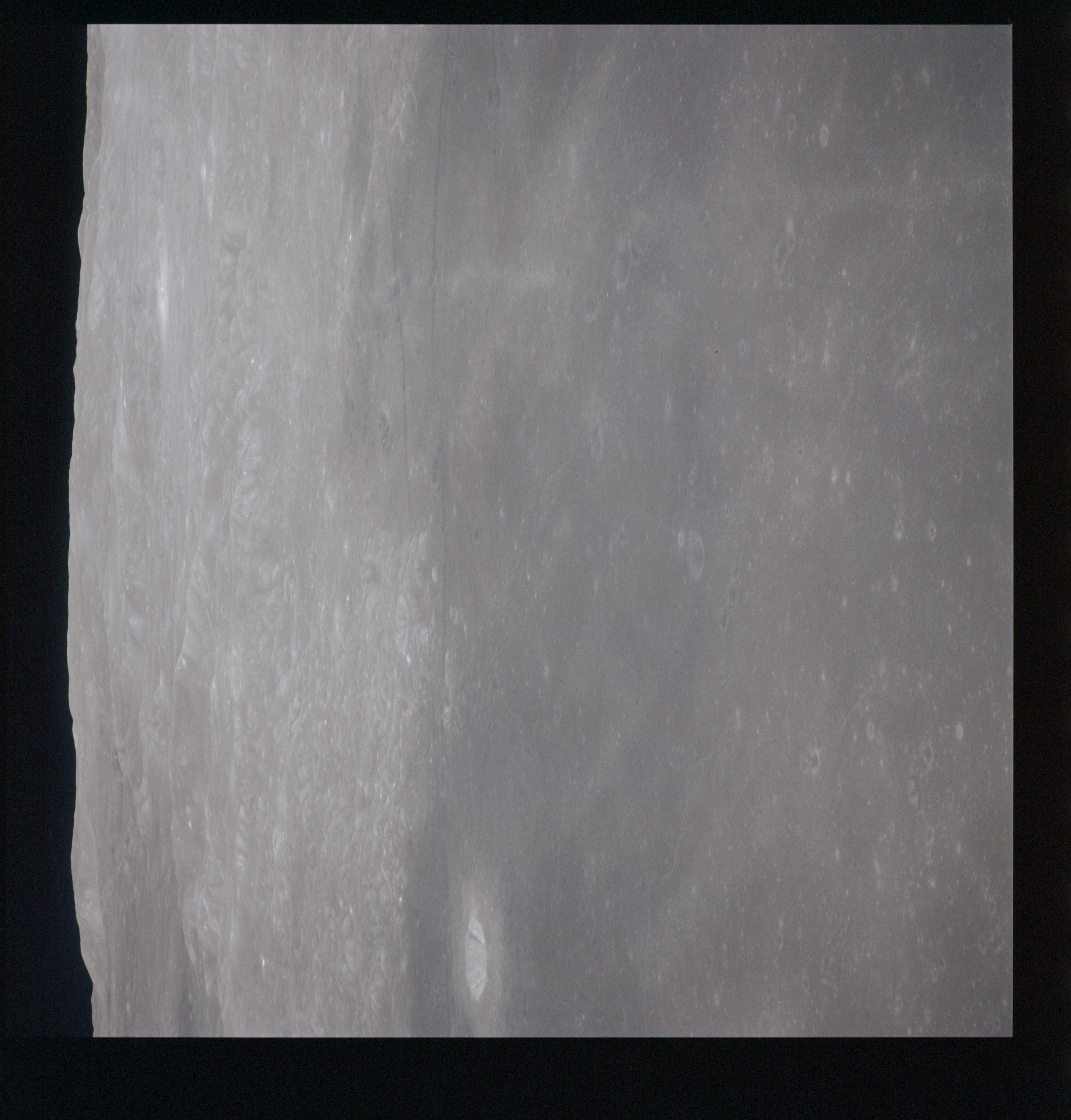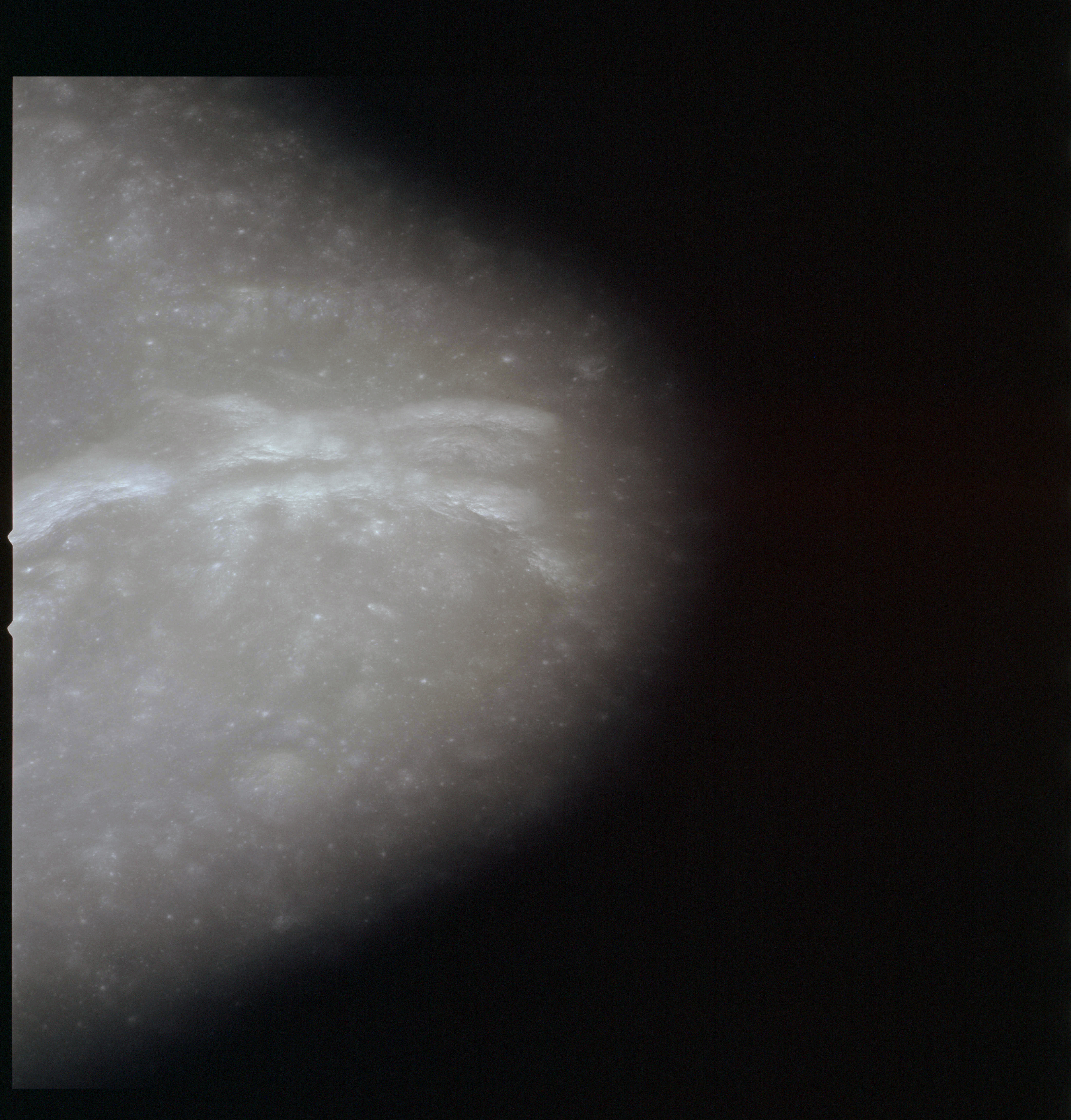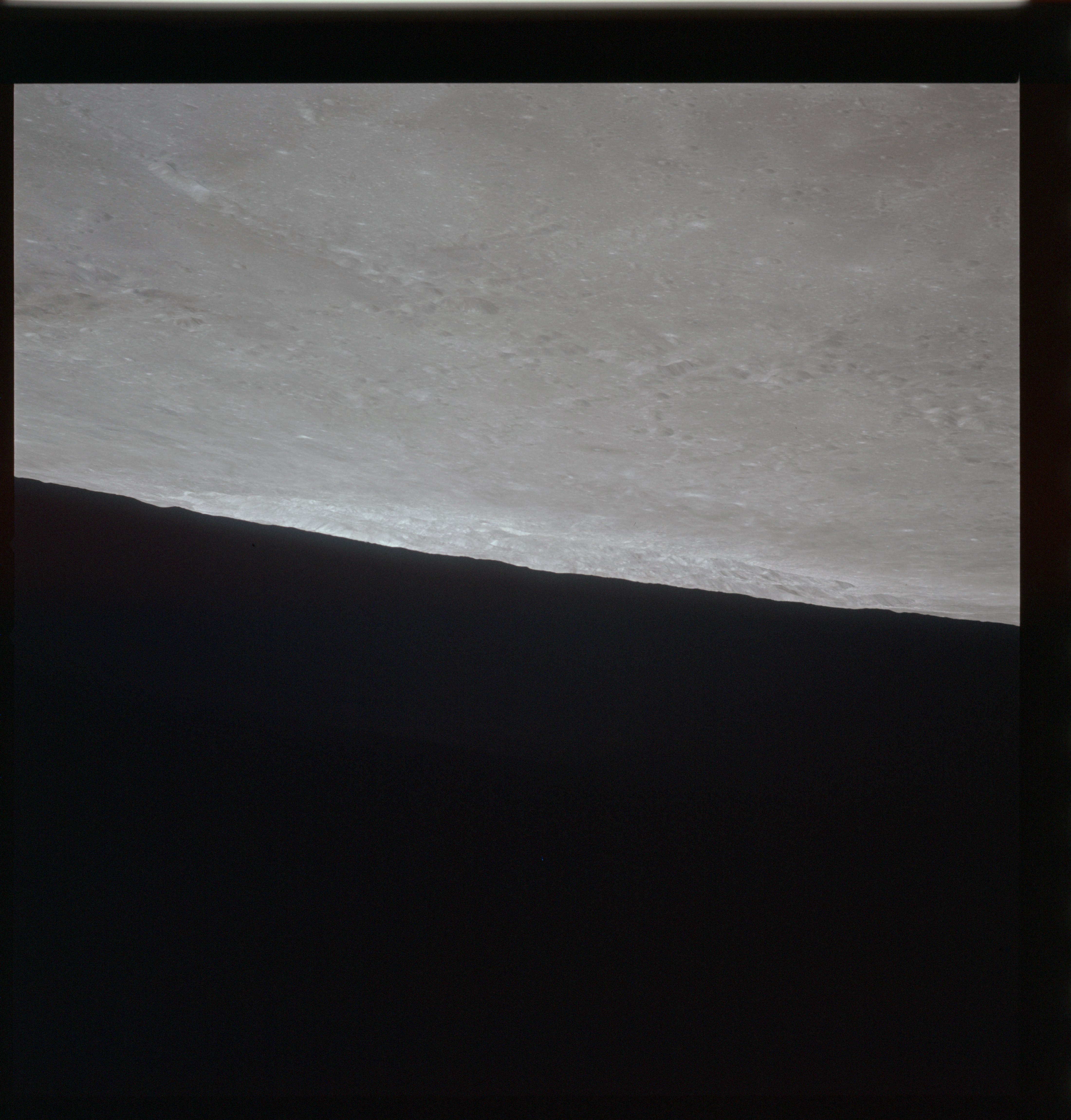 When the terminator does arrive, the Mapping Camera is started, its PAD T-start time being 214:20:03. In this pass it will take 143 frames between the sunset and sunrise terminators, about one frame every 25 seconds. These are AS15-M-2351 to 2493 and they will be looking directly downwards. Beginning with AS15-M-2354, every tenth image from this sequence will be presented here.
