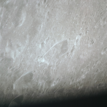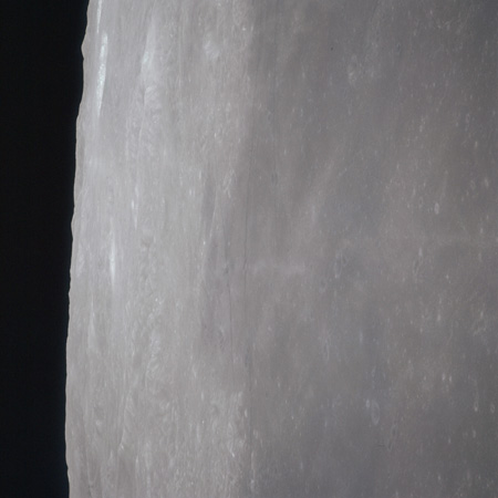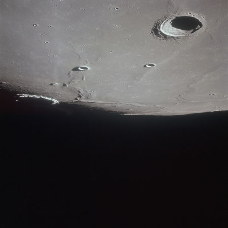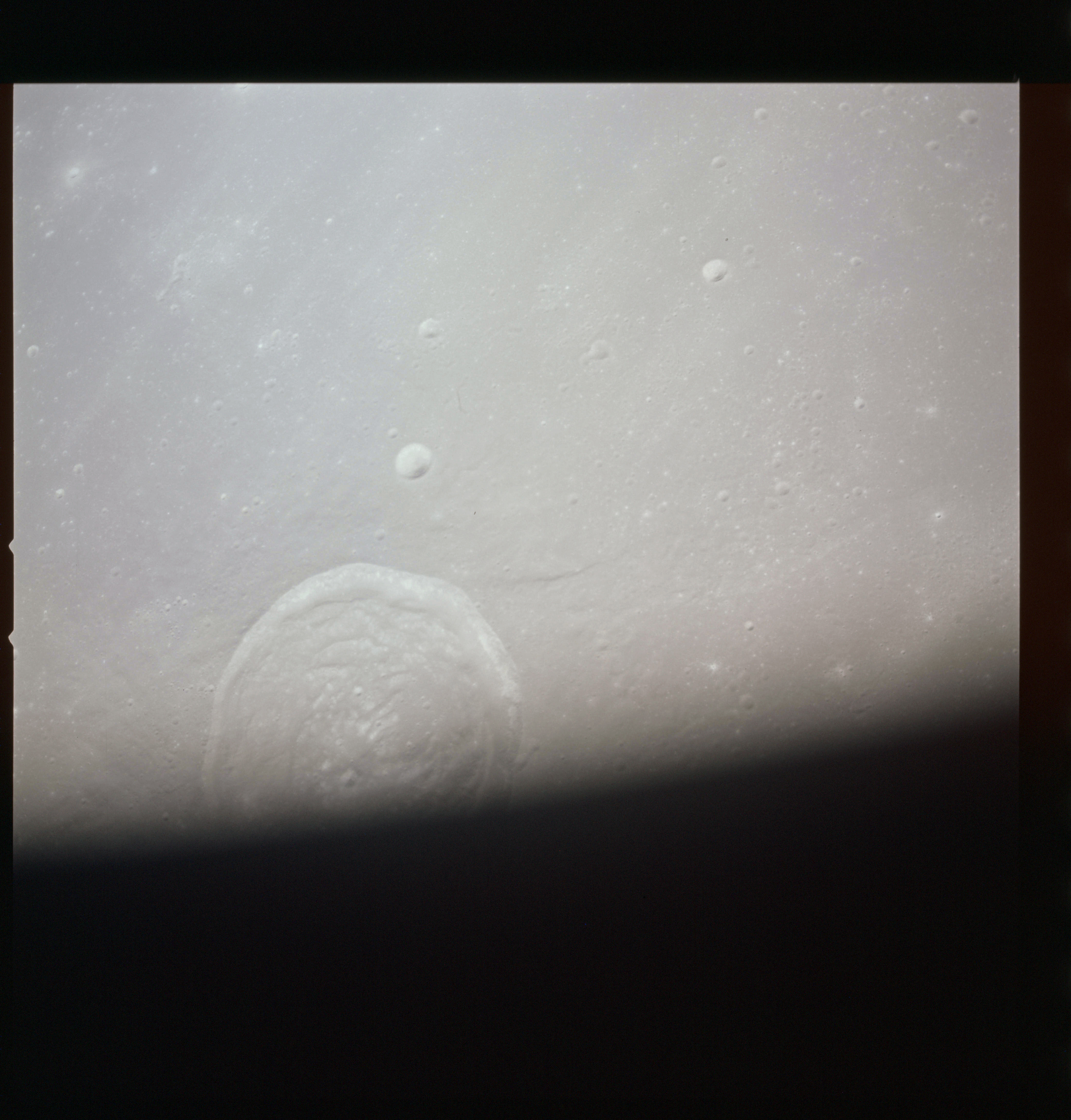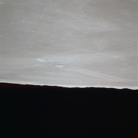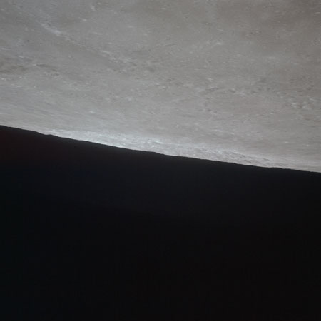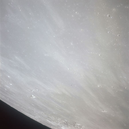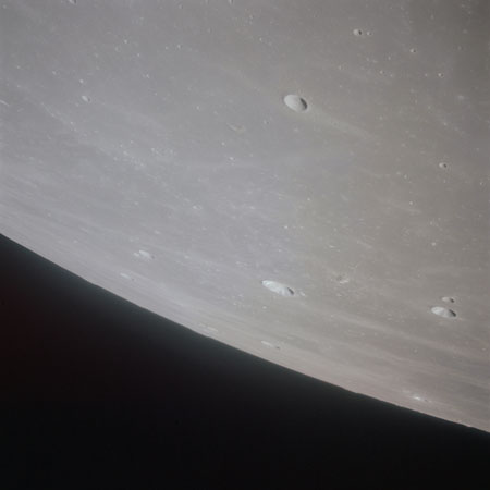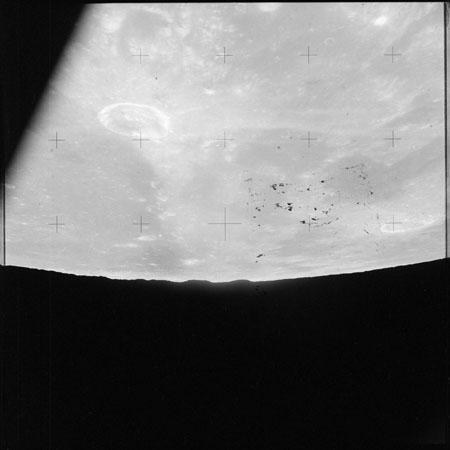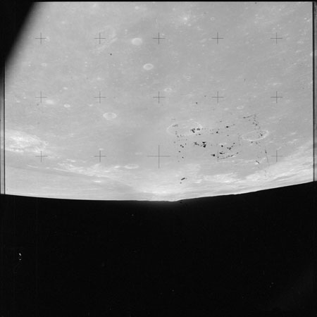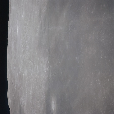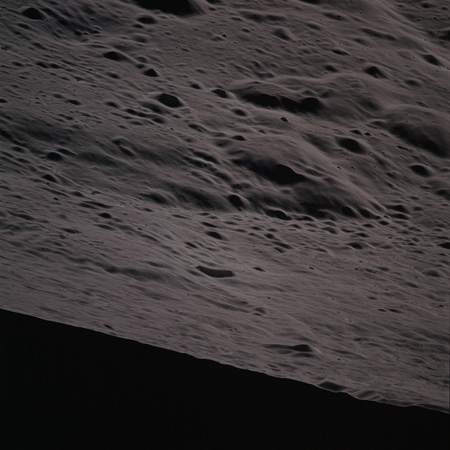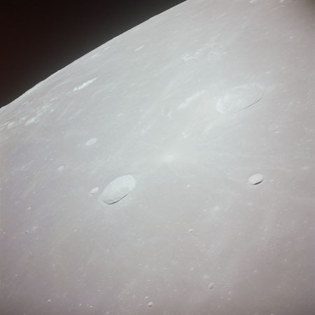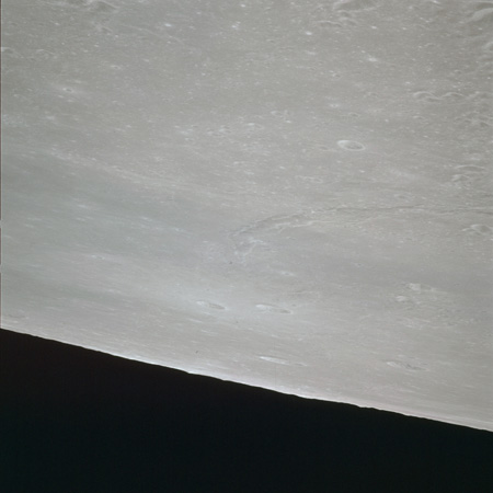 As Endeavour comes around the near side, Al is busy with a Hasselblad fitted with the 250mm lens. He takes a photograph on magazine O of Curie, a 139-km, highly degraded crater, followed by eight Earthrise images.