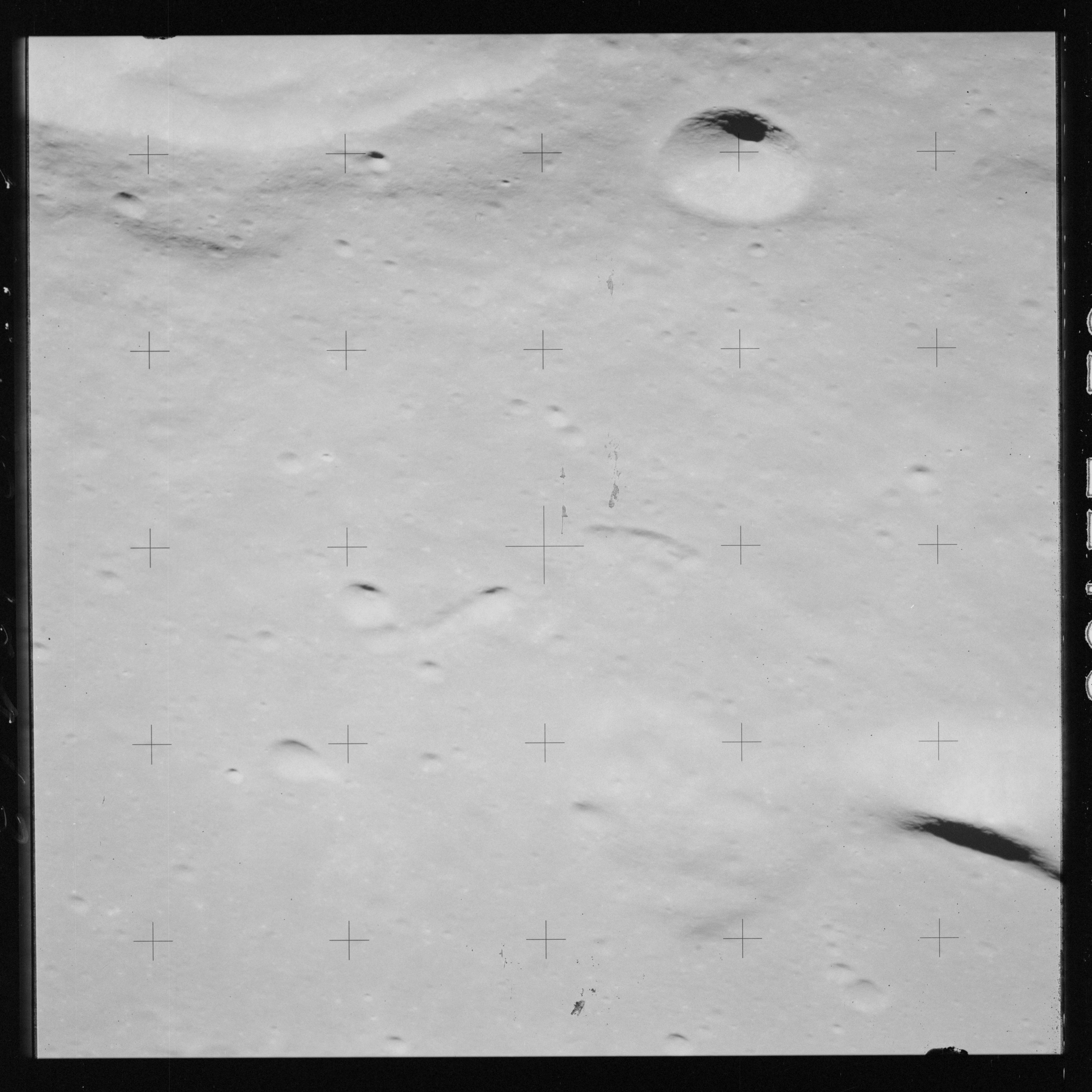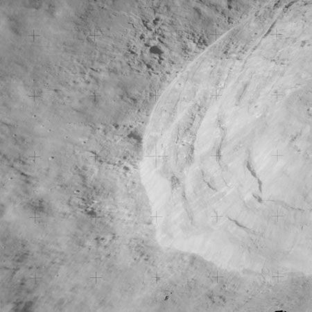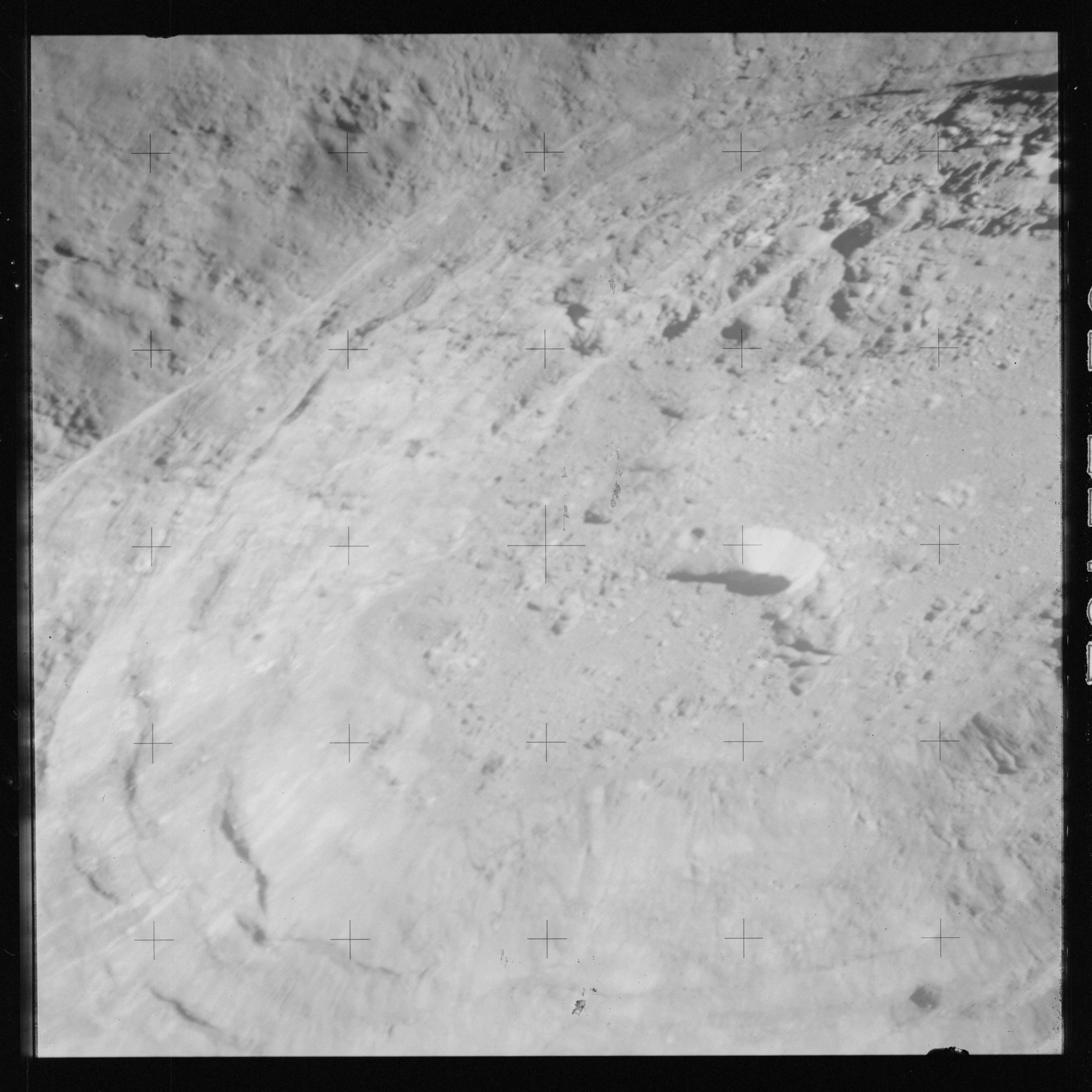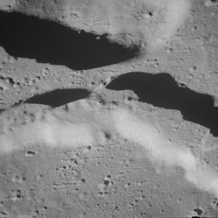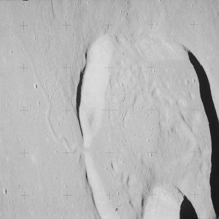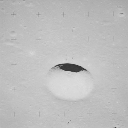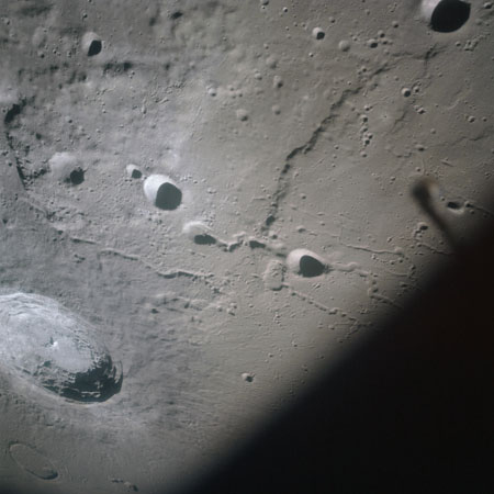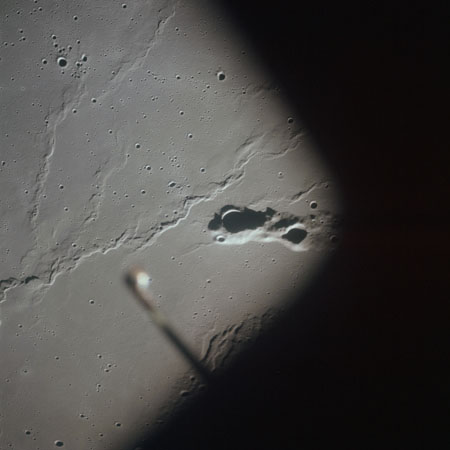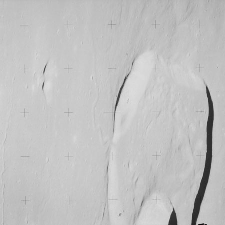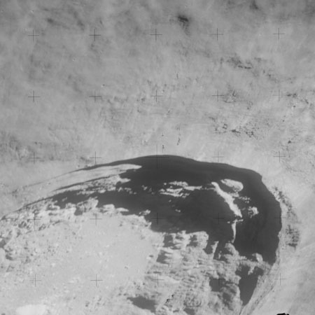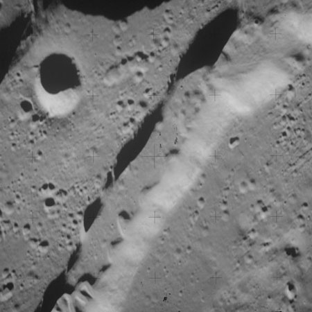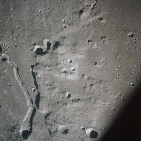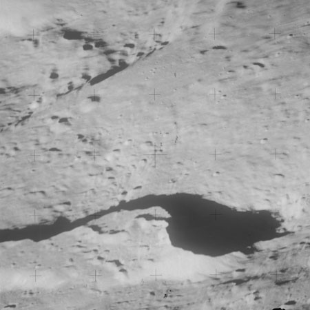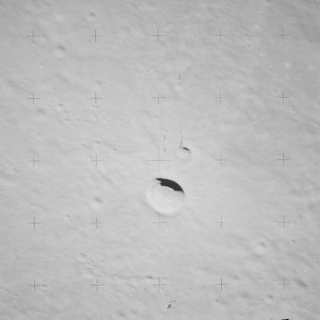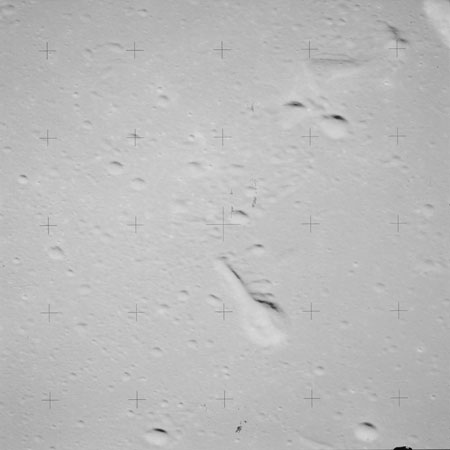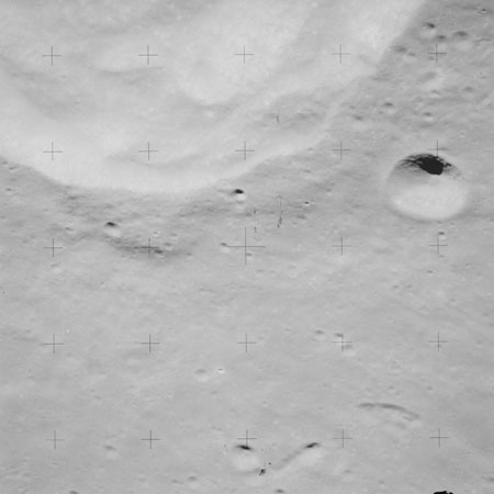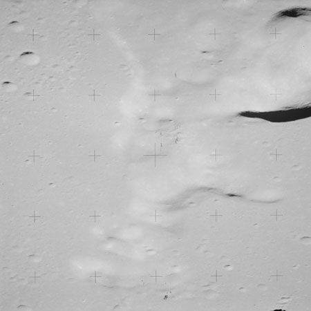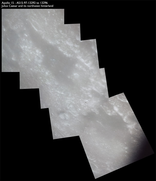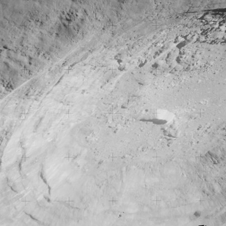 At around the same time, nine images are taken of Scaliger and the landscape near the rim of this 84-km crater in the extremely low-angle lighting near the terminator. These photographs use magazine R which is loaded with film type 2485, very high speed black and white film with a speed rating of 6000 (ASA or ISO). The images are AS15-98-13365 to 13373.