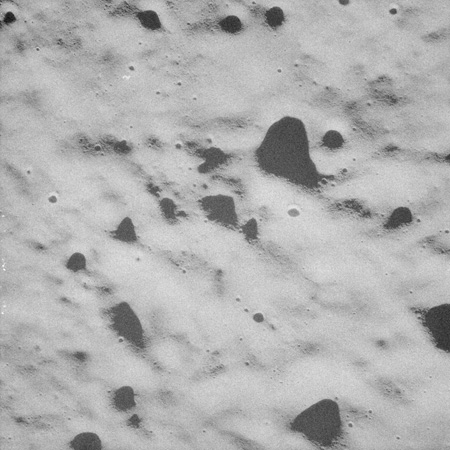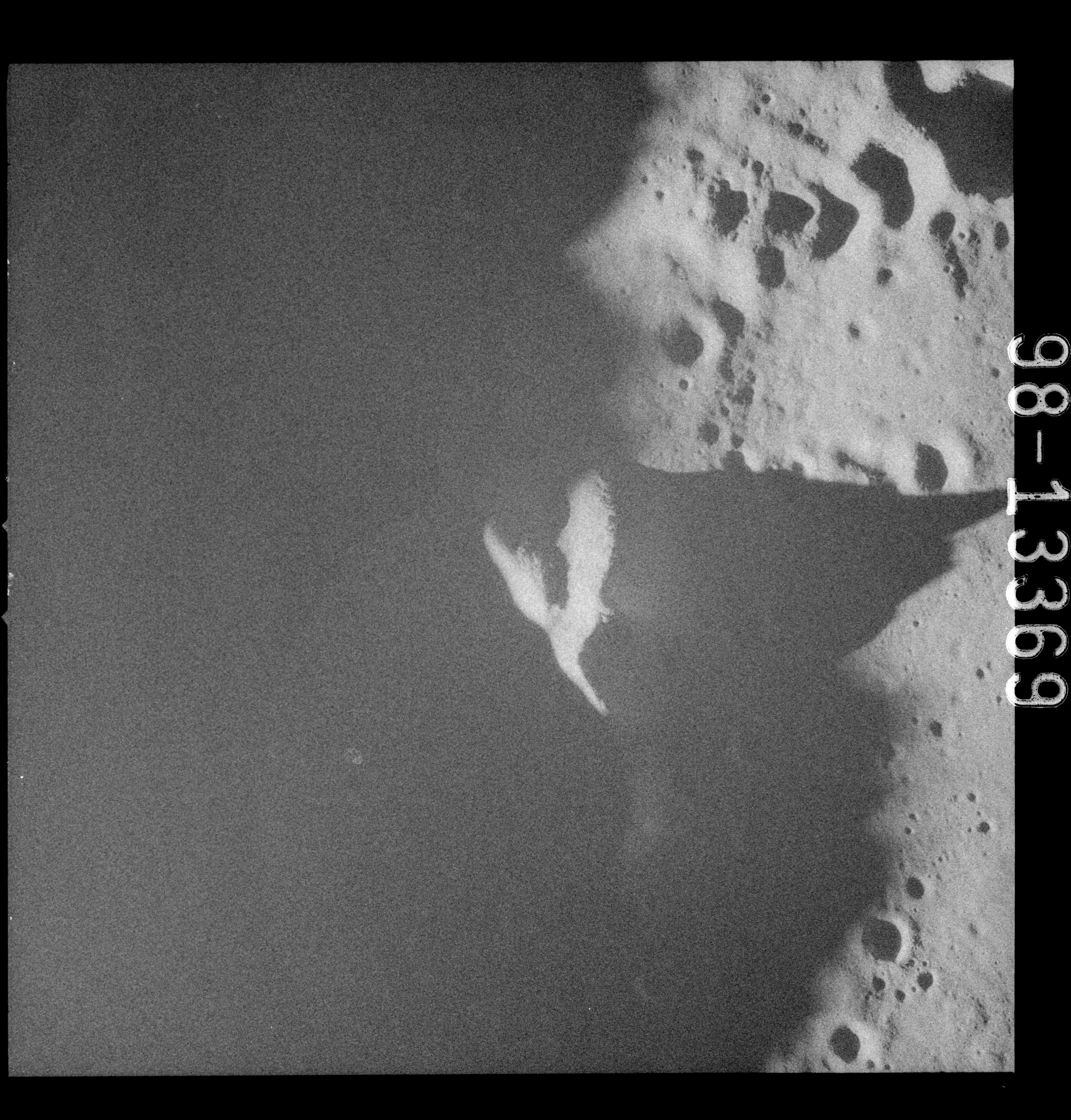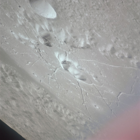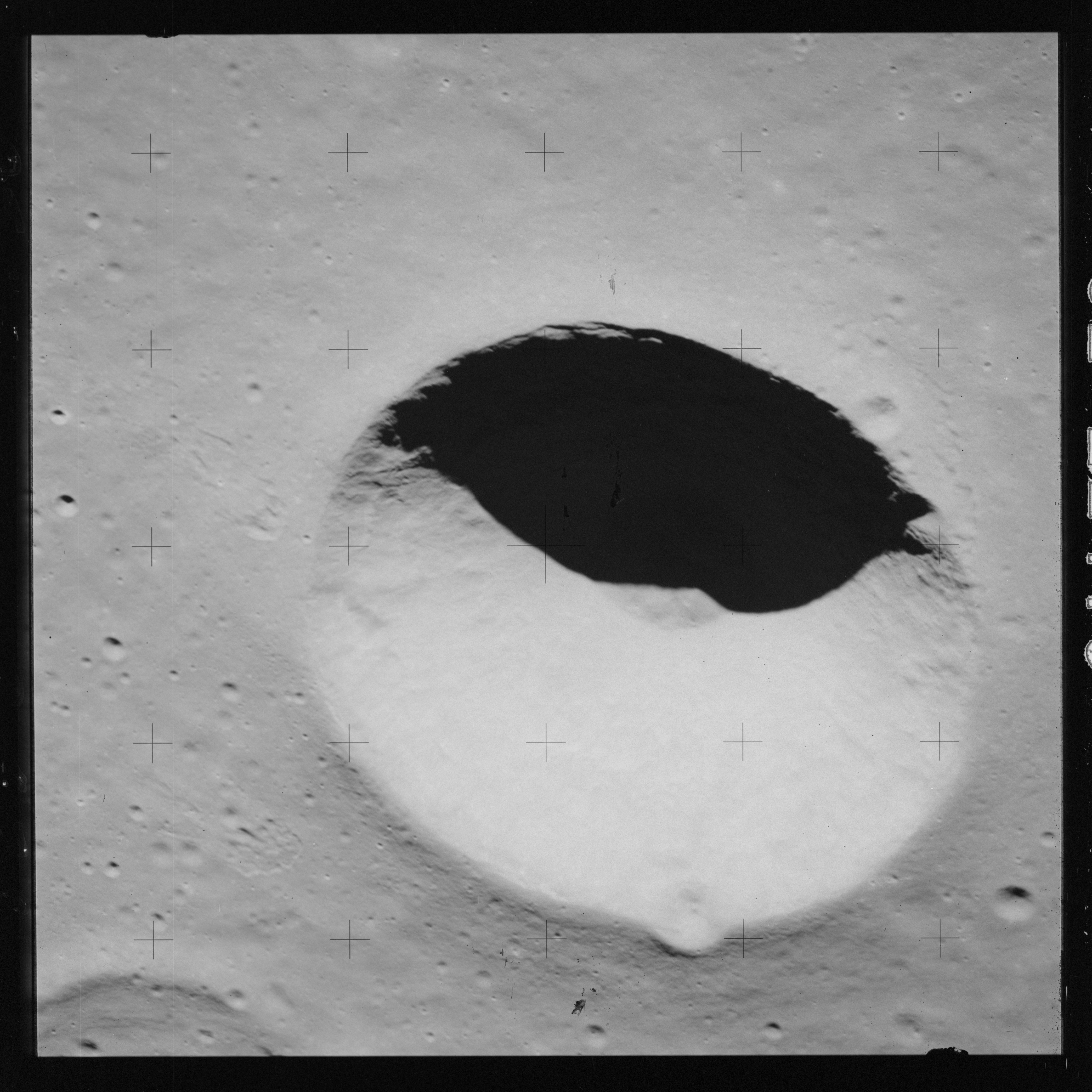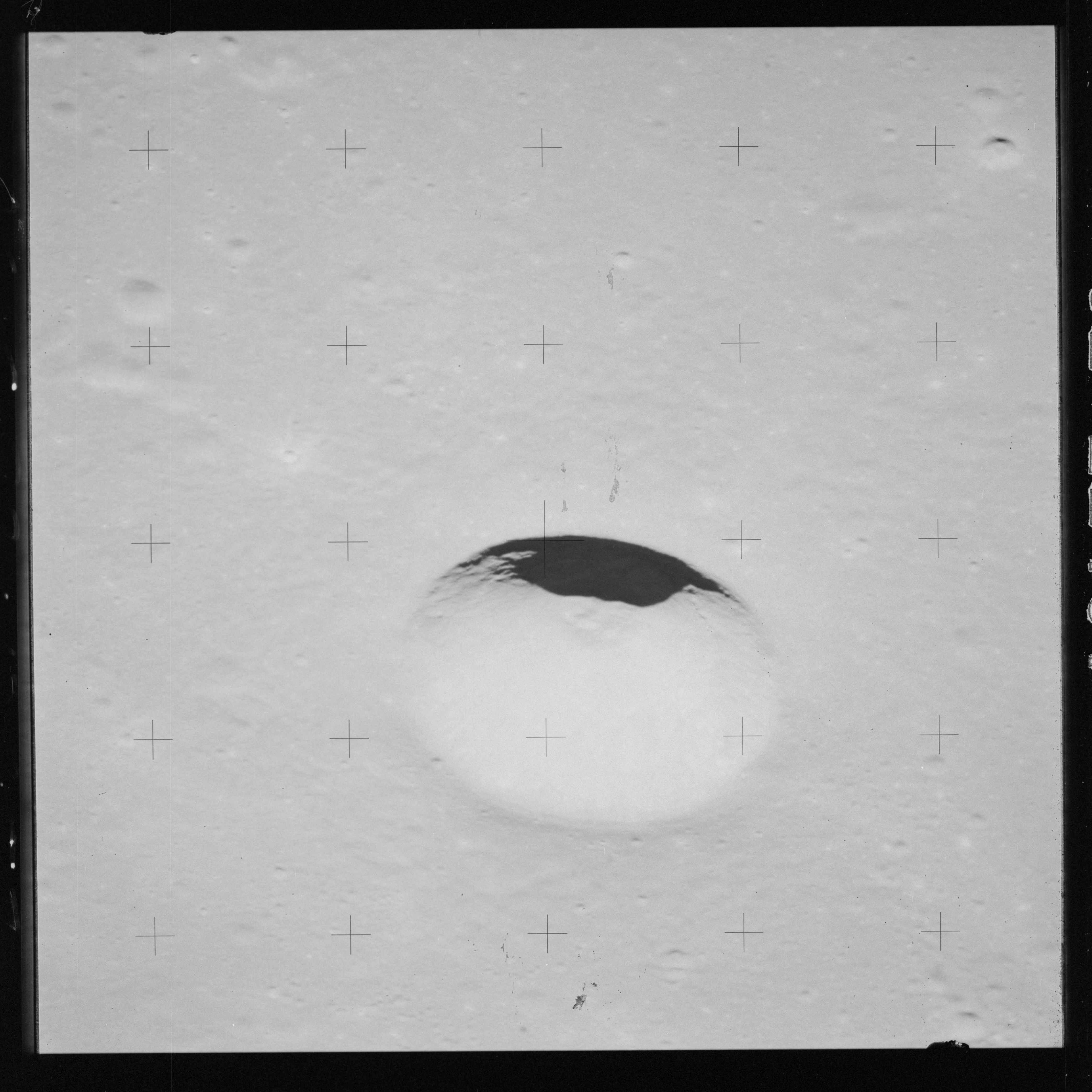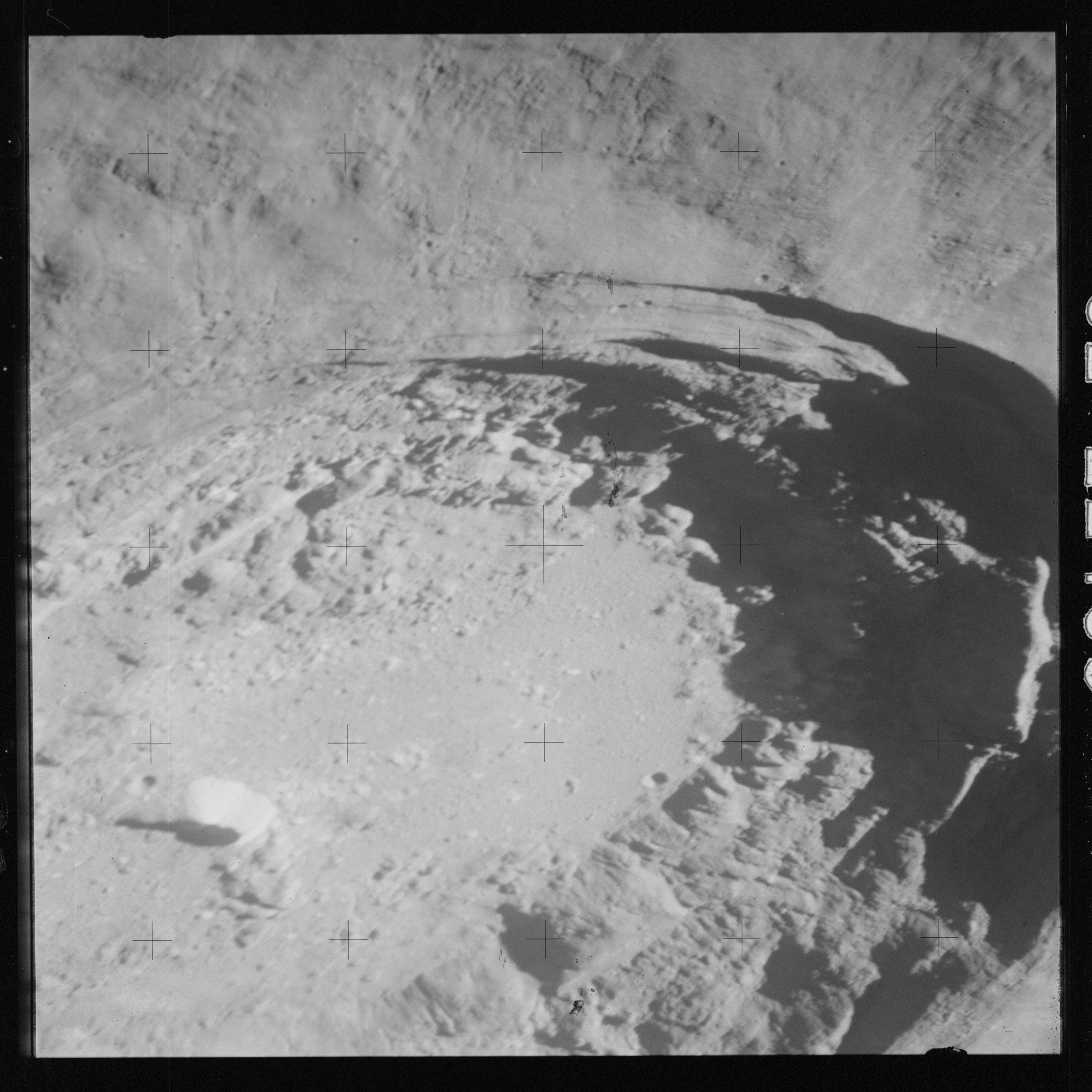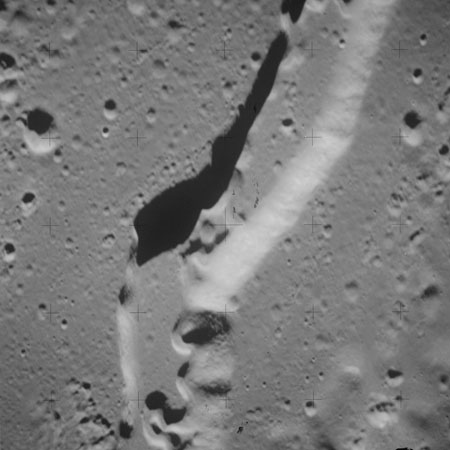 At around the same time, nine images are taken of Scaliger and the landscape near the rim of this 84-km crater in the extremely low-angle lighting near the terminator. These photographs use magazine R which is loaded with film type 2485, very high speed black and white film with a speed rating of 6000 (ASA or ISO). The images are AS15-98-13365 to 13373.