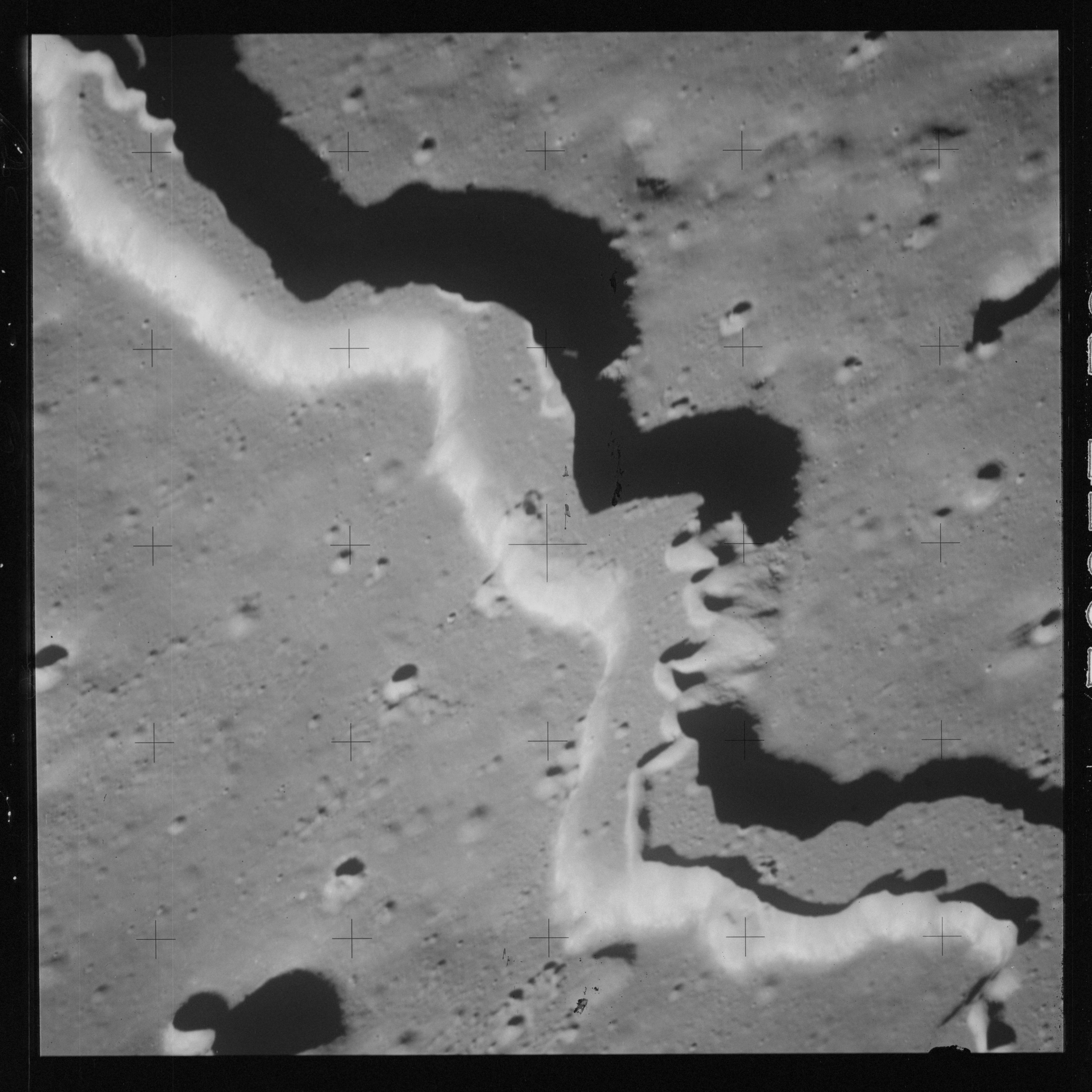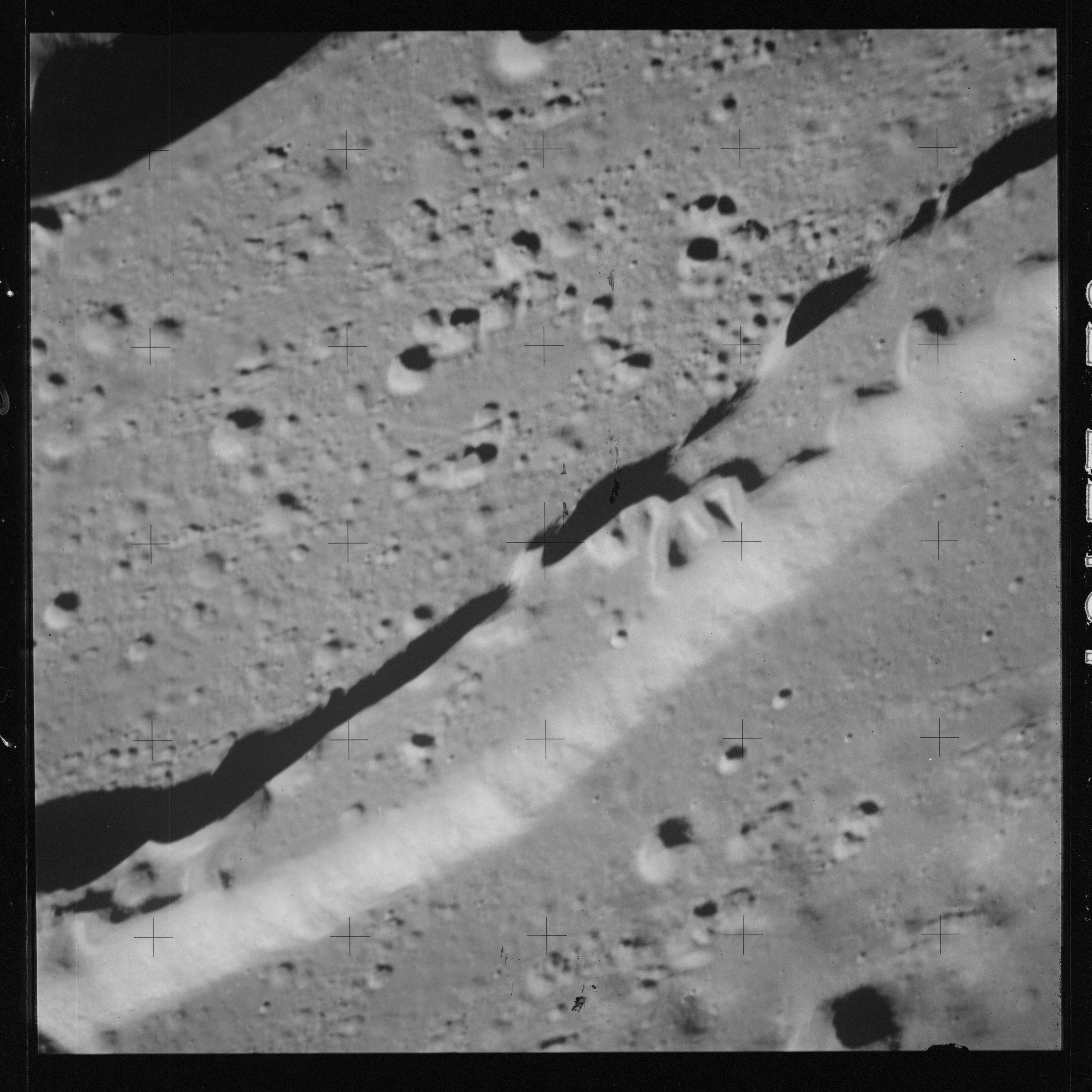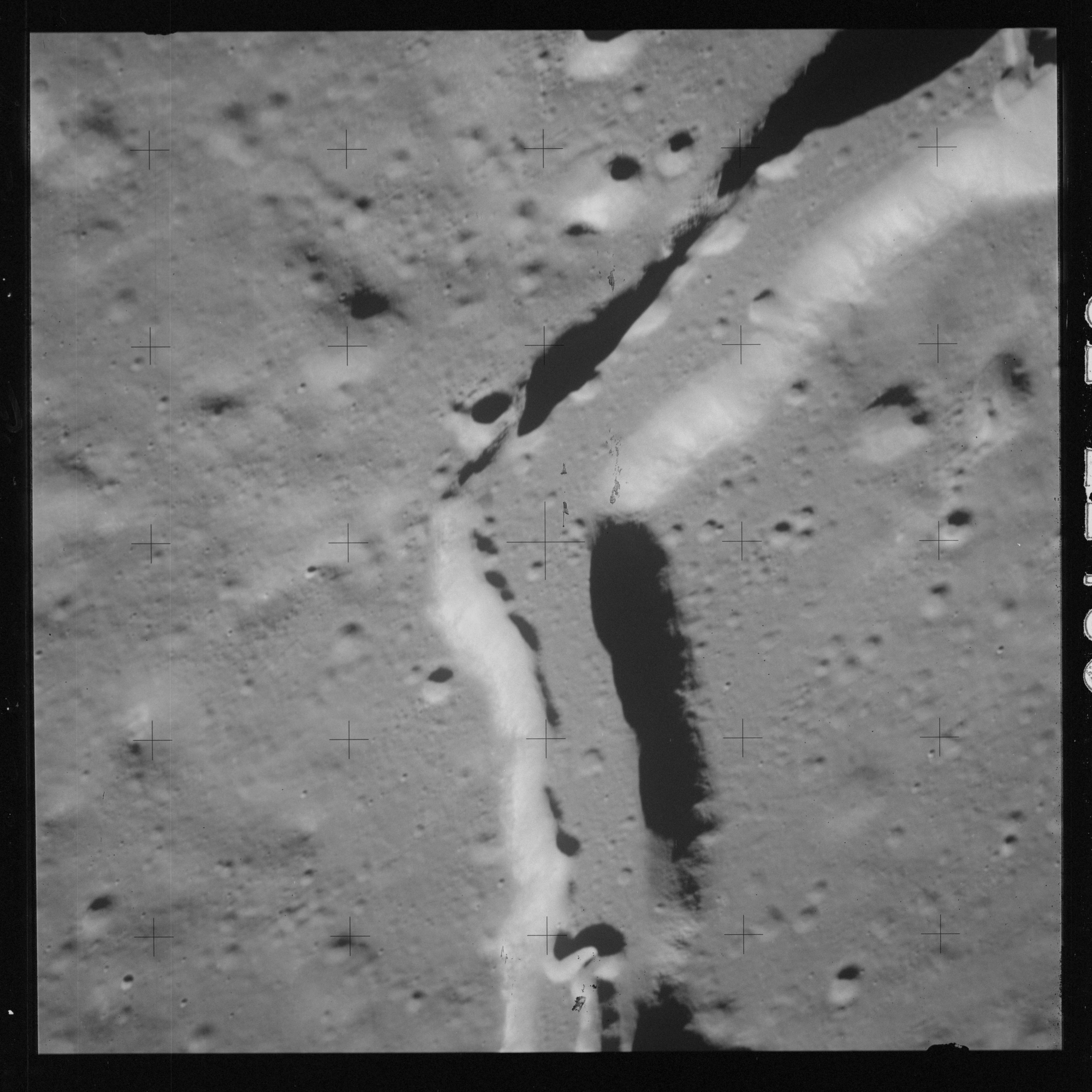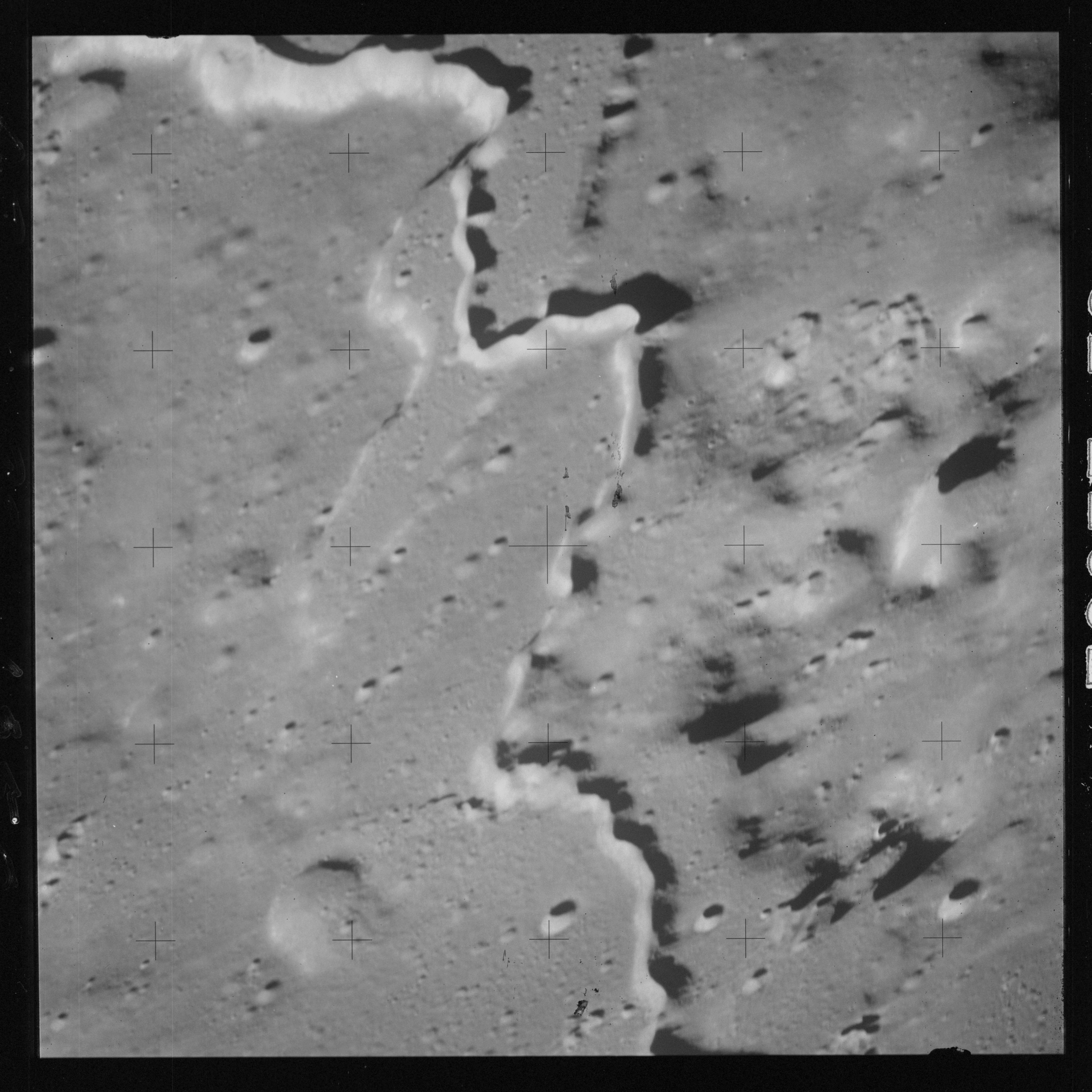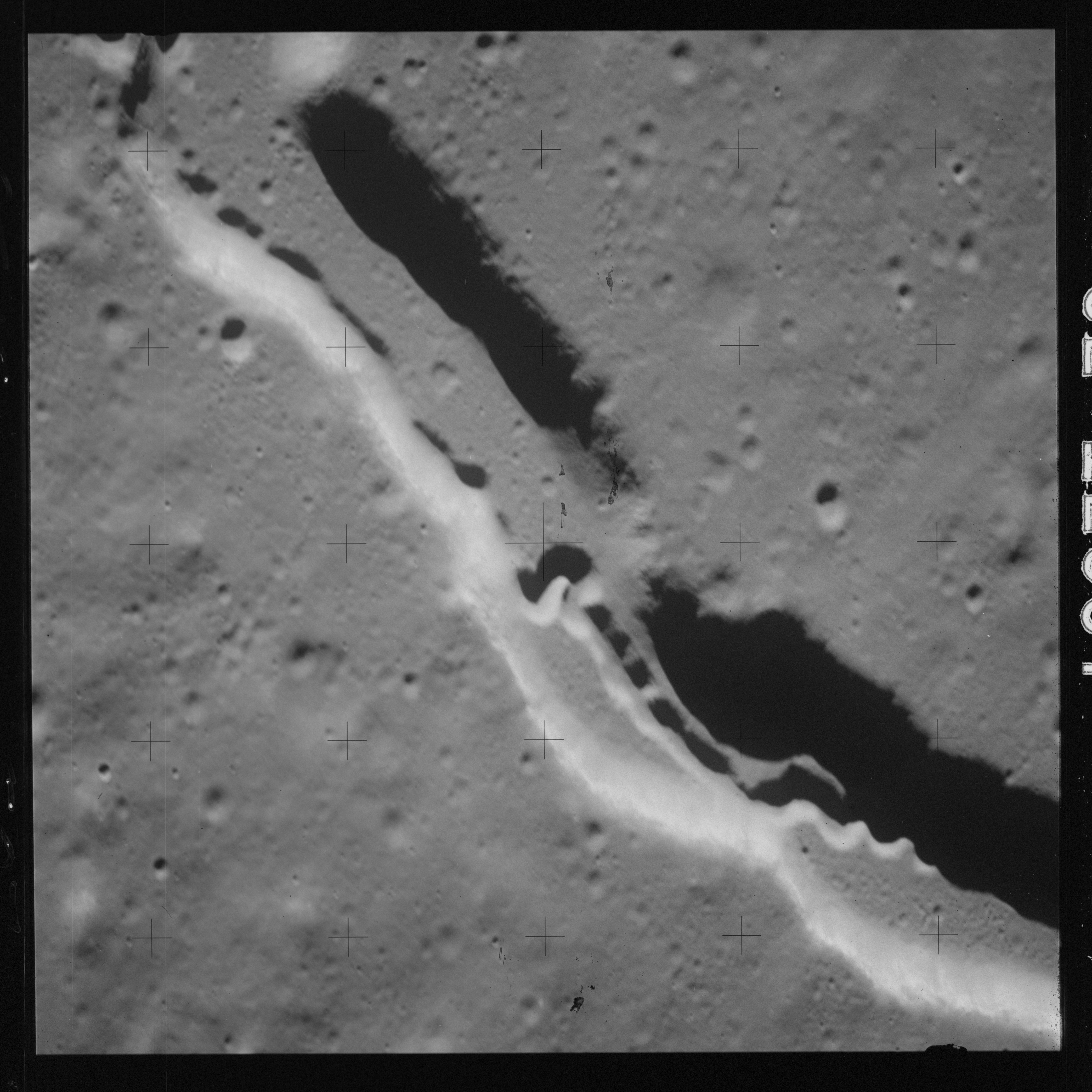 The 500-mm lens is being used with magazine OO to capture the detail of Vallis Schröteri along its length in two series of consecutive black and white images. The first series comprises AS15-92-12495 to 12502.