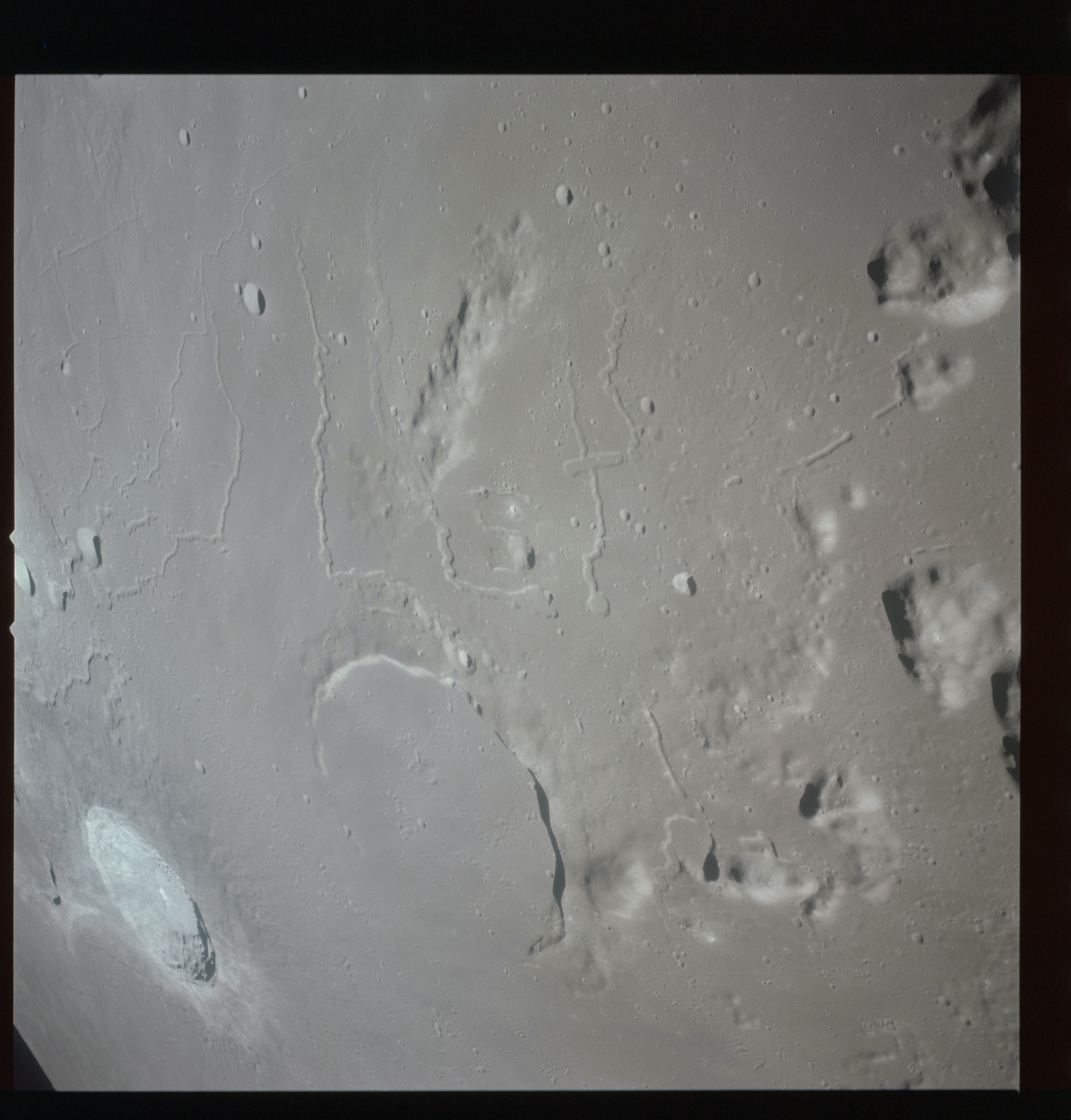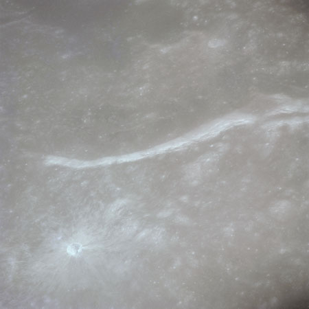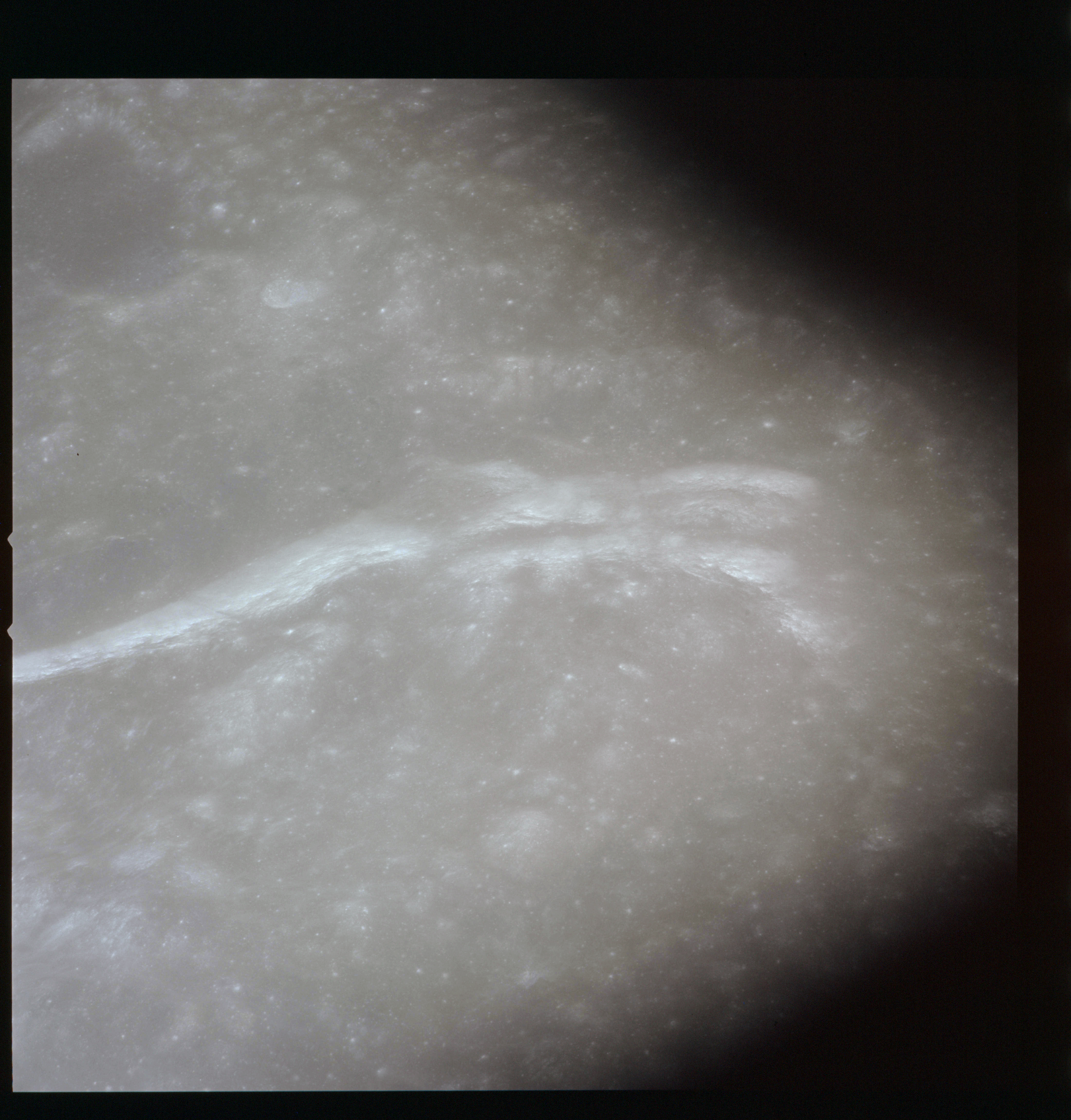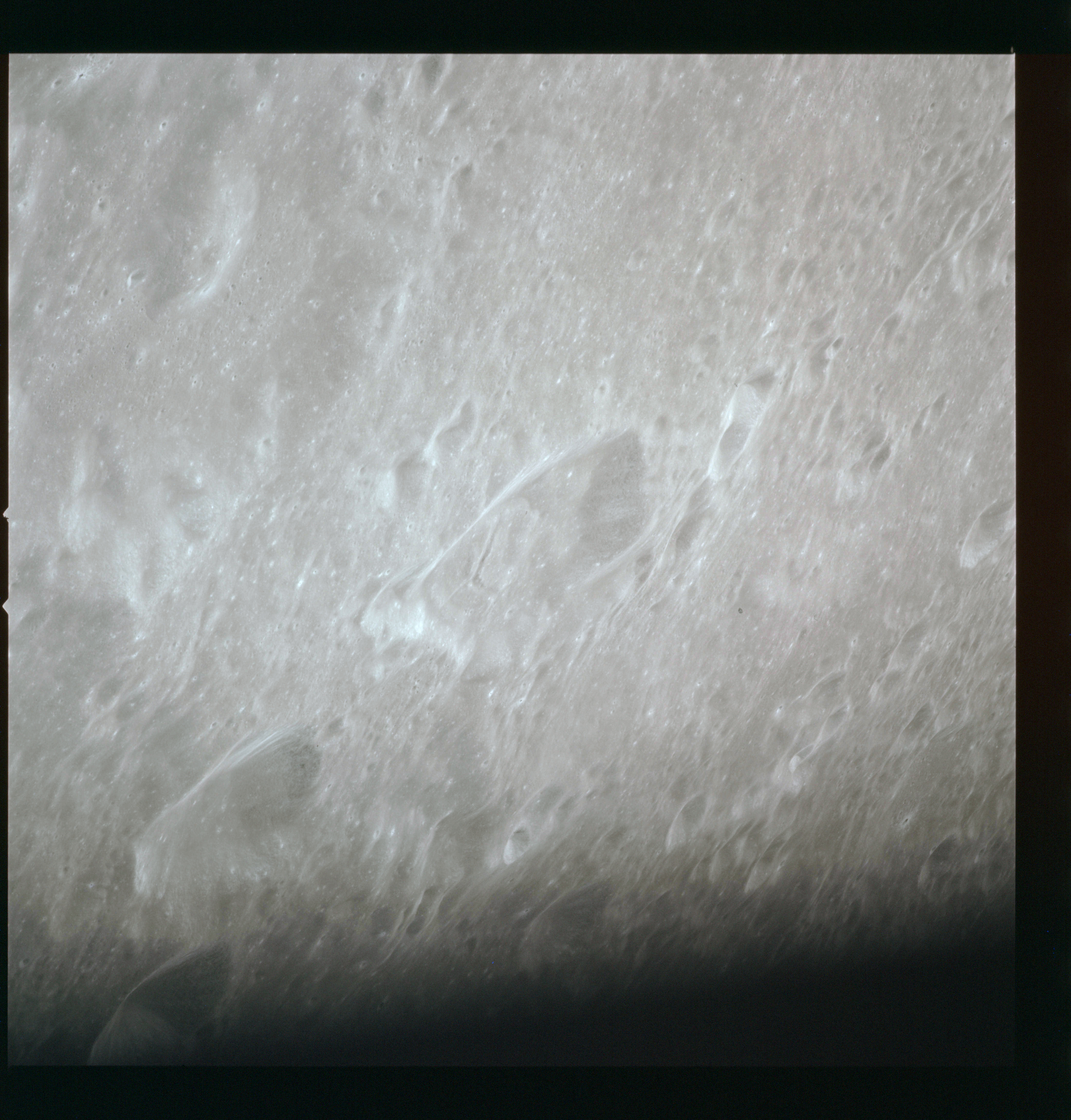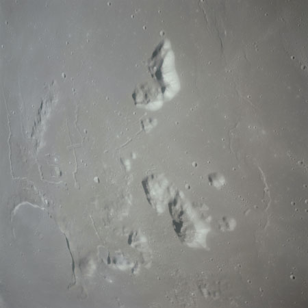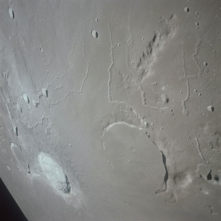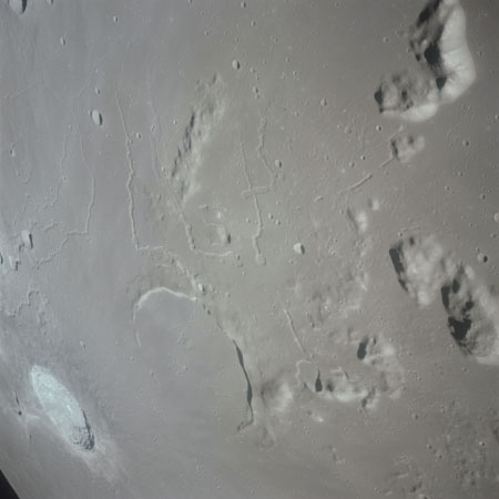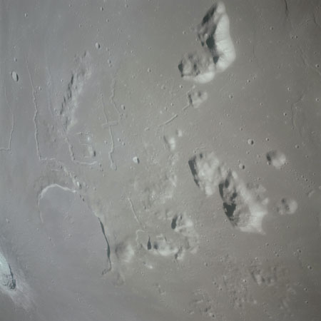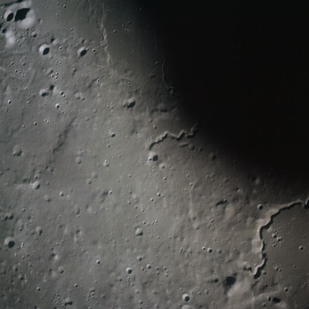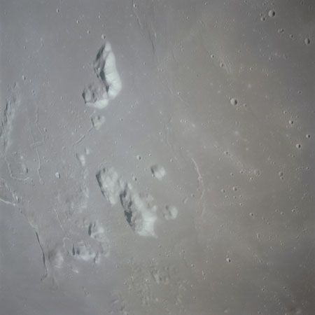 The final batch of handheld photography before reaching the terminator is on magazine P with the 80-mm lens. AS15-93-12632 shows the southern tip of the Montes Agricola range with Dorsa Burnet running alongside.