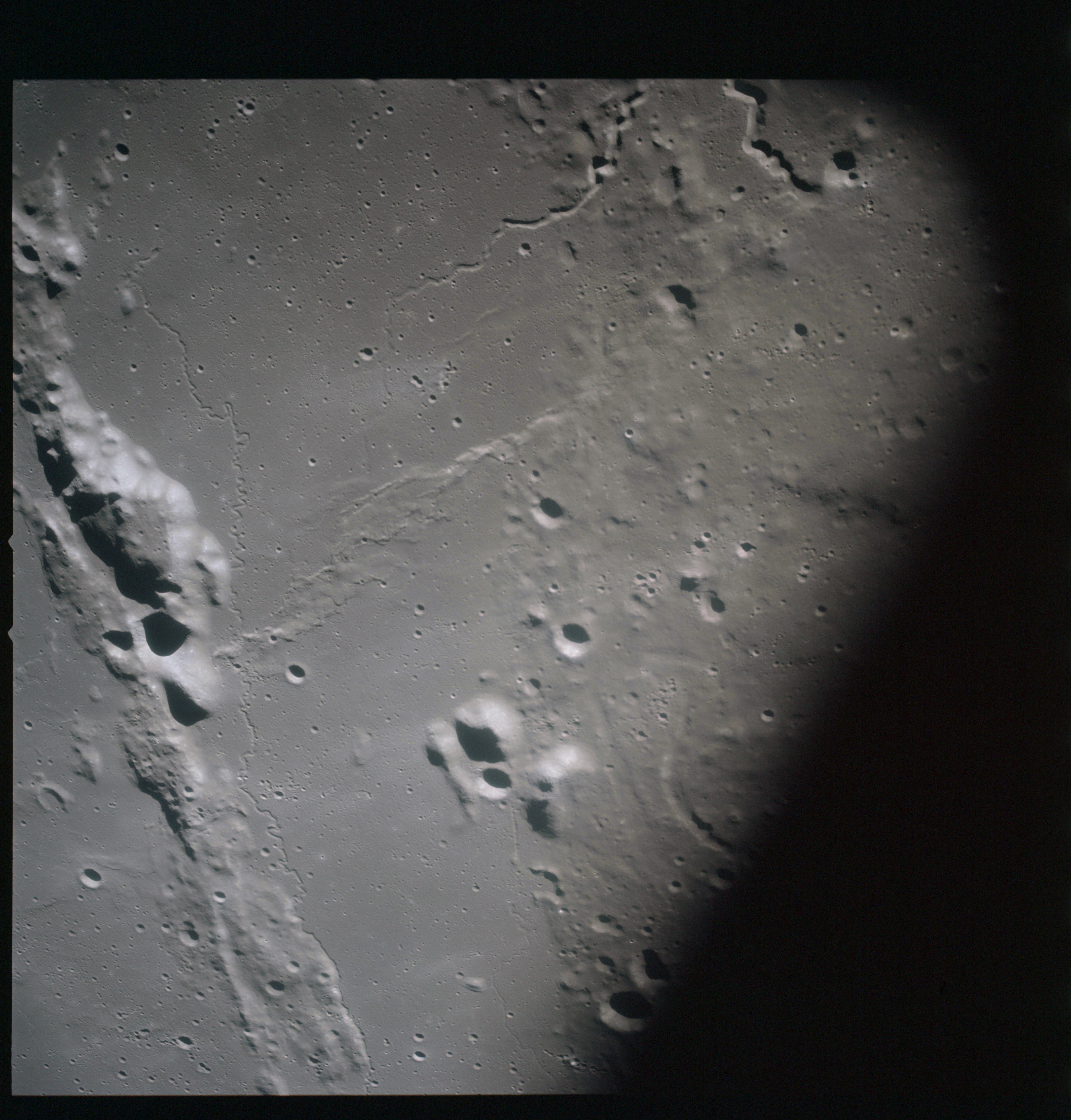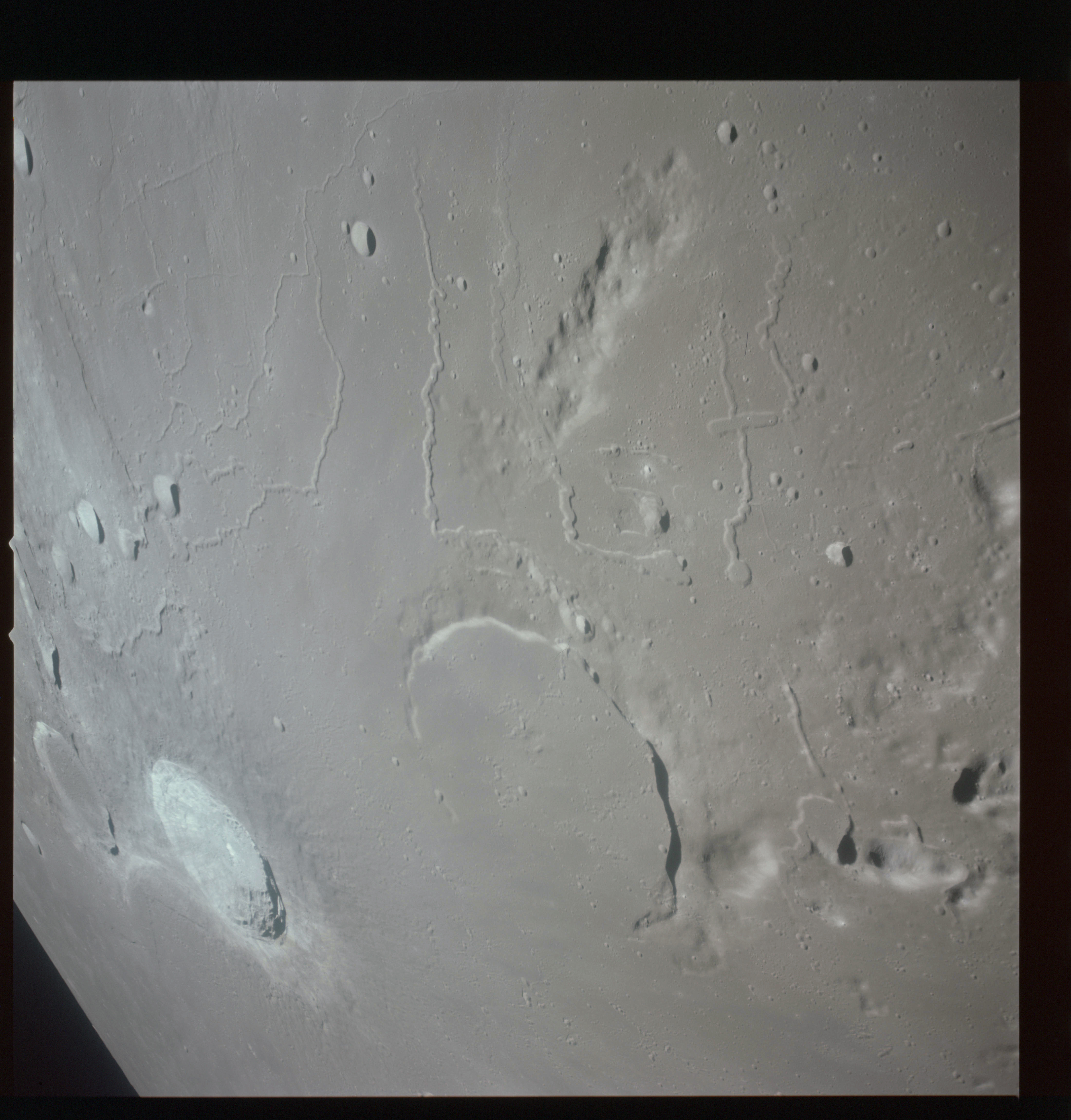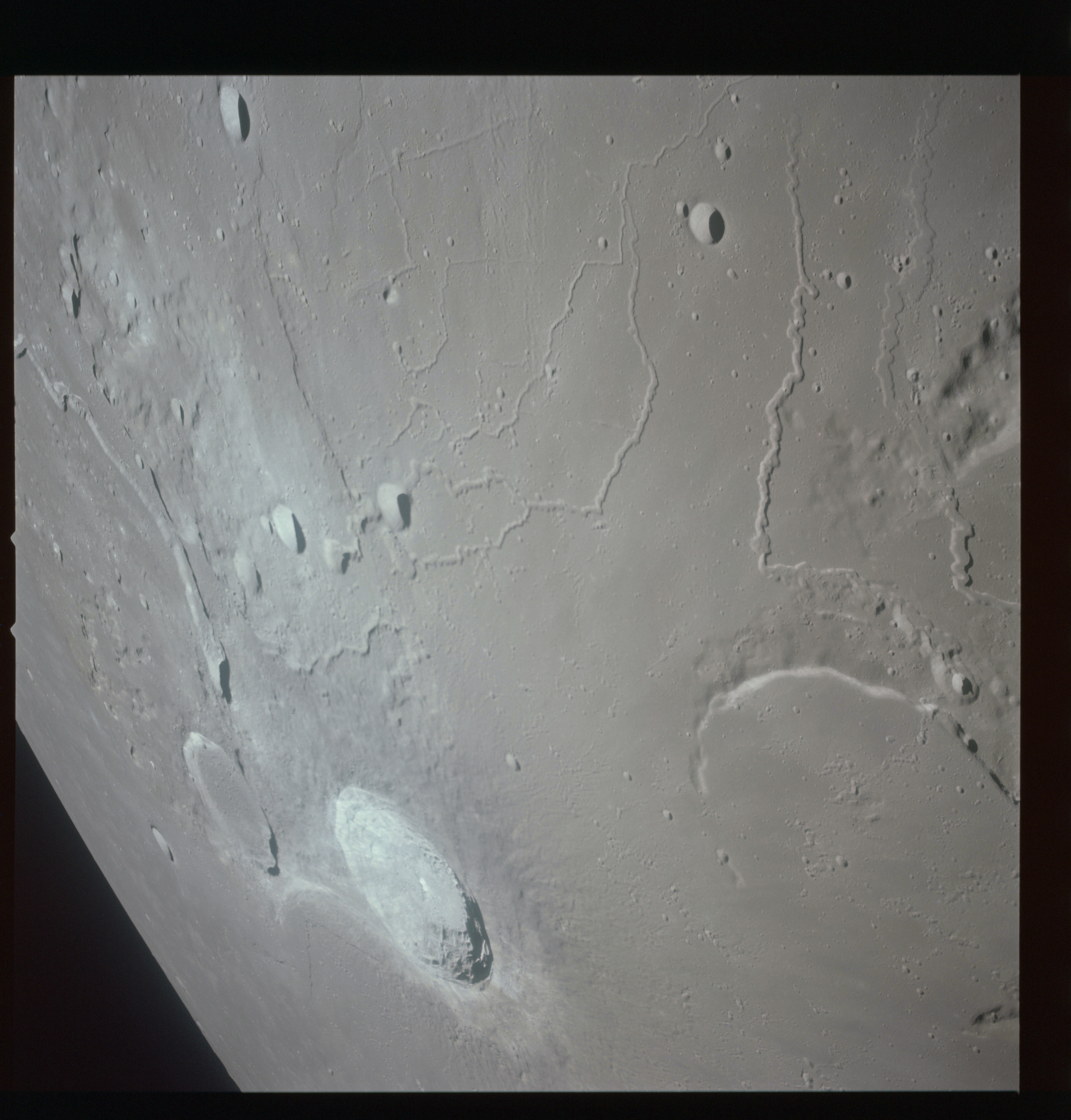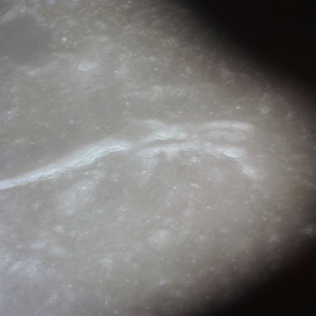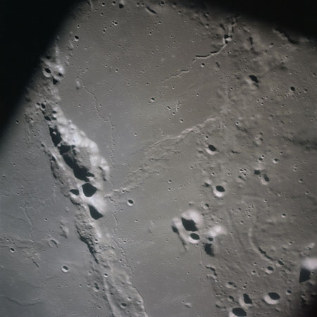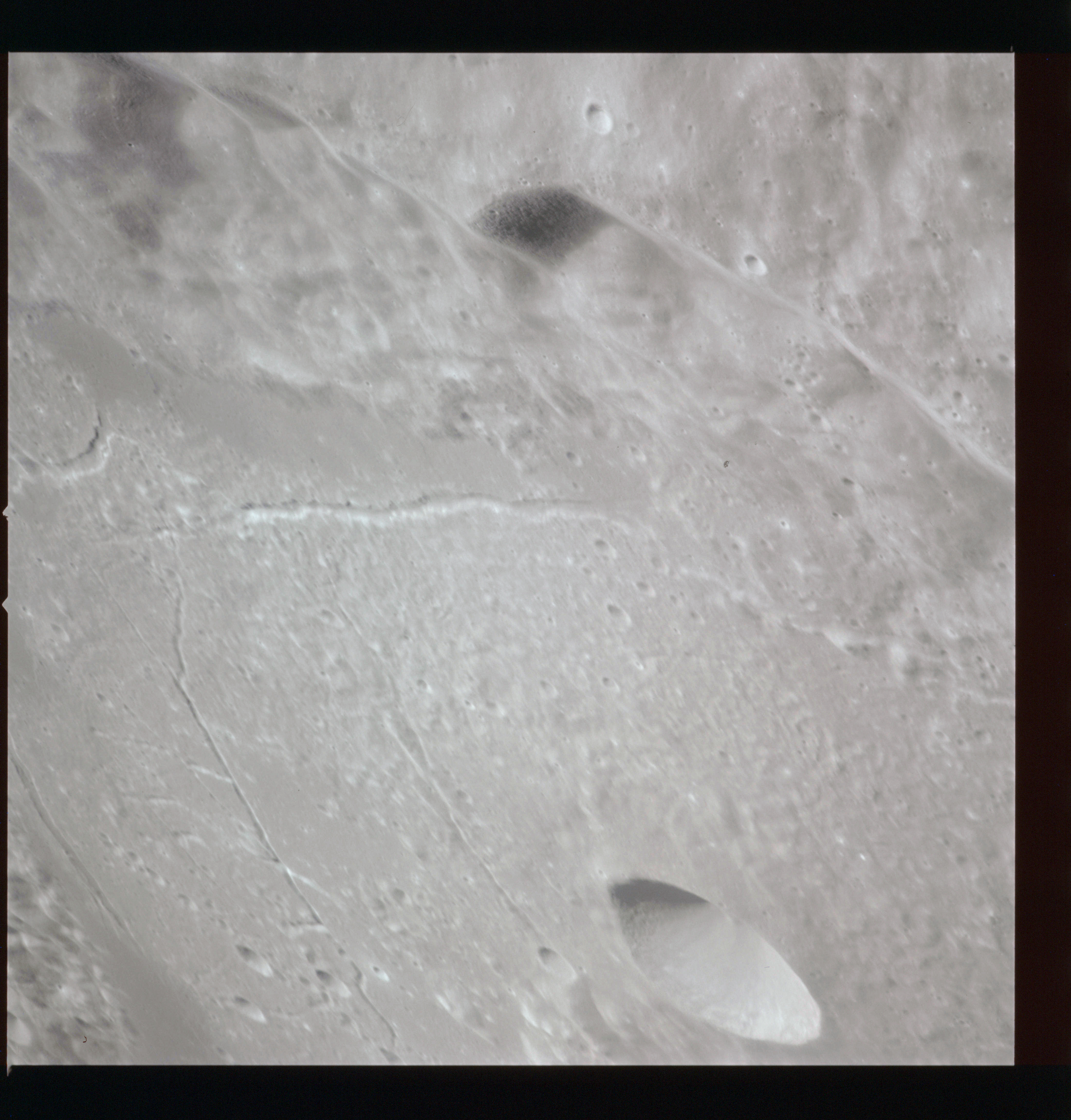 The final batch of handheld photography before reaching the terminator is on magazine P with the 80-mm lens. AS15-93-12632 shows the southern tip of the Montes Agricola range with Dorsa Burnet running alongside.