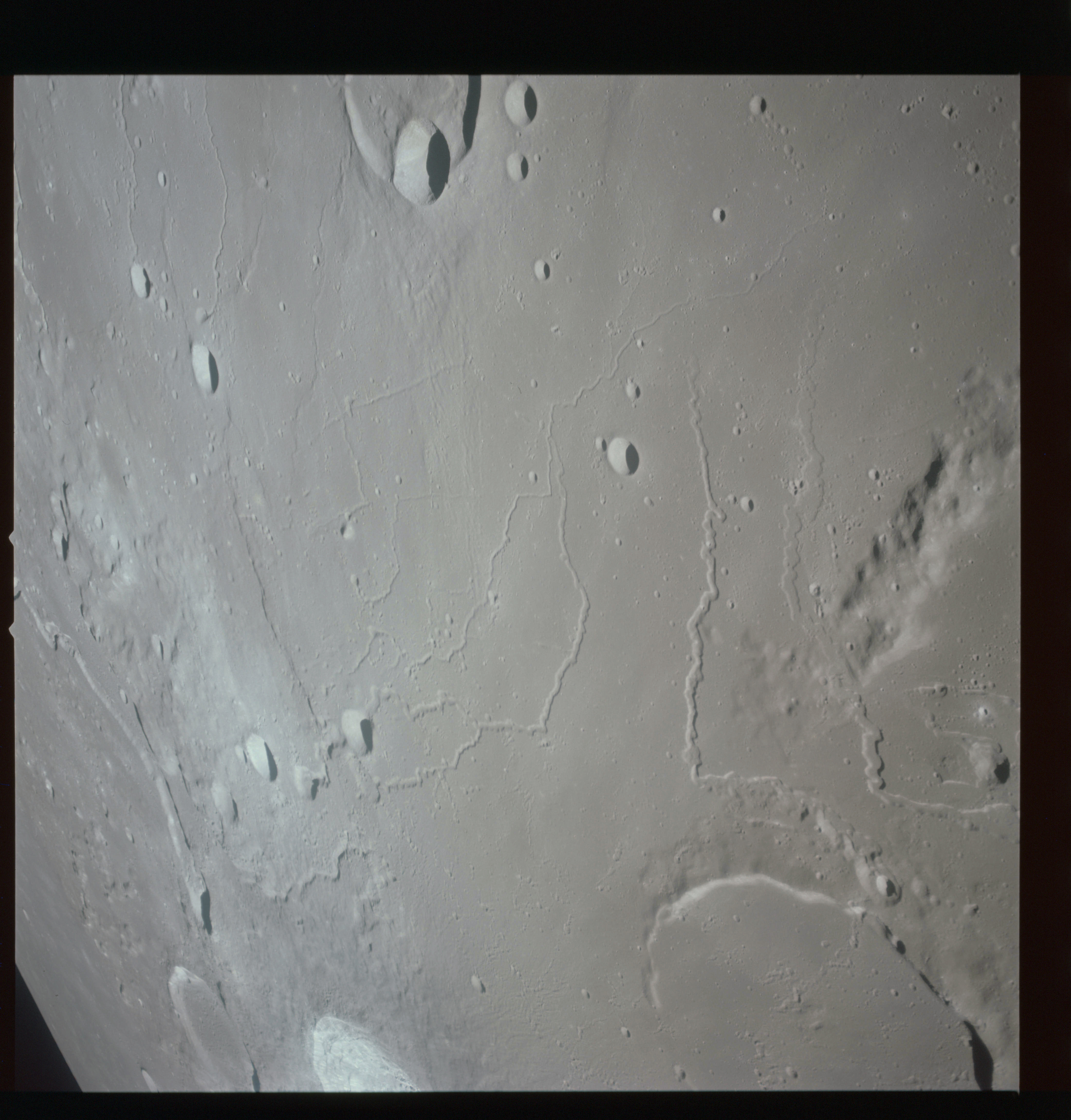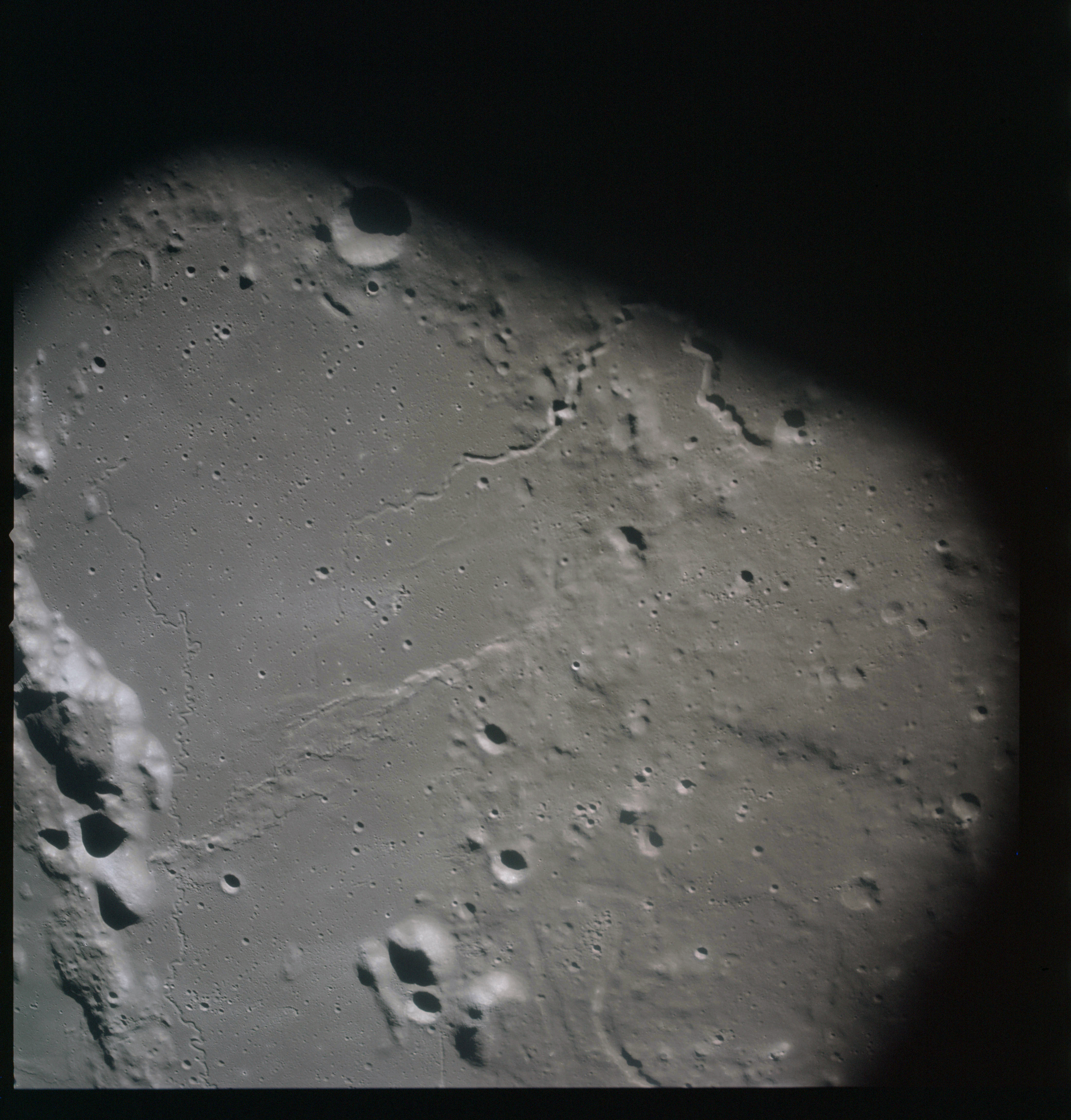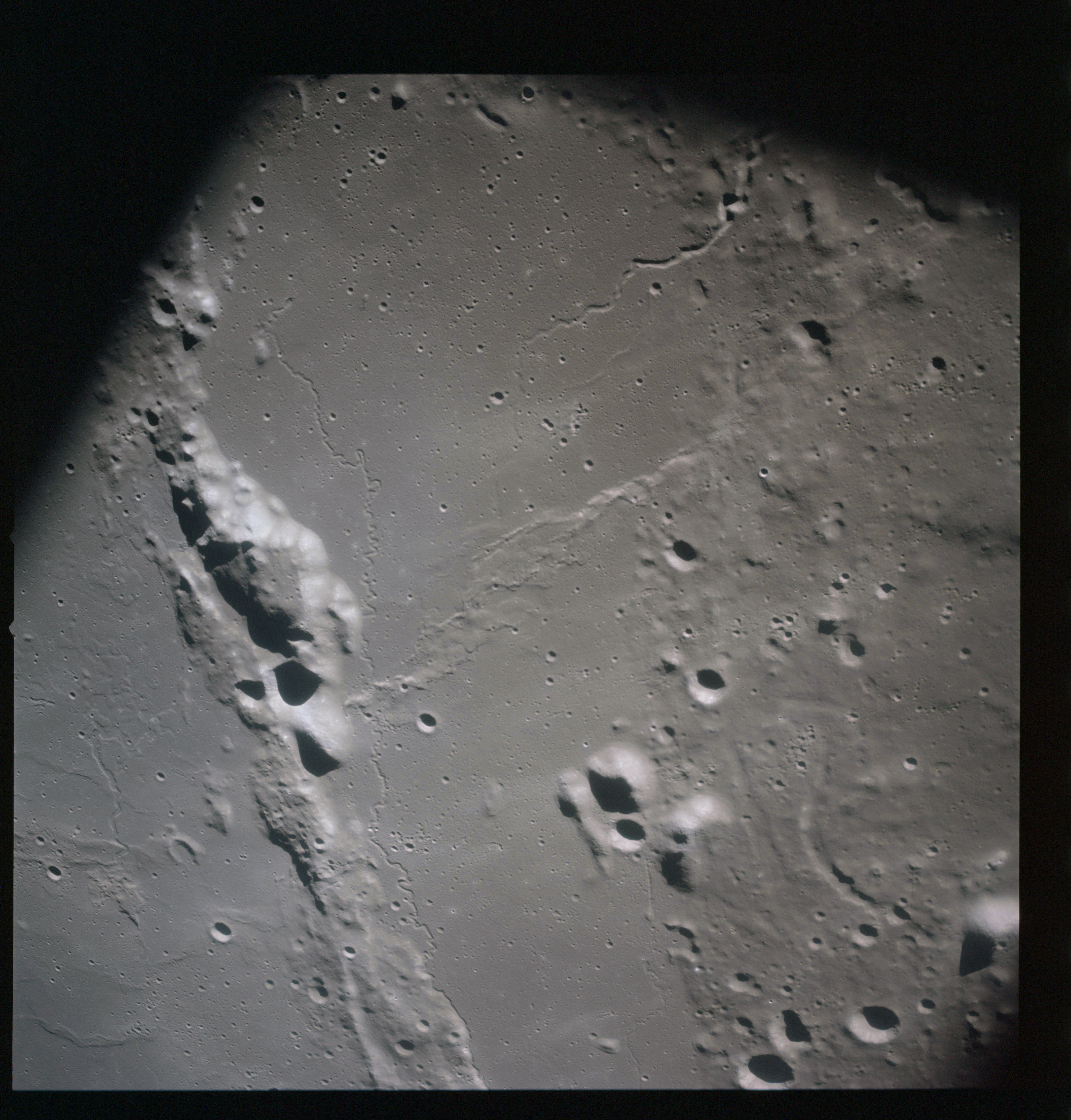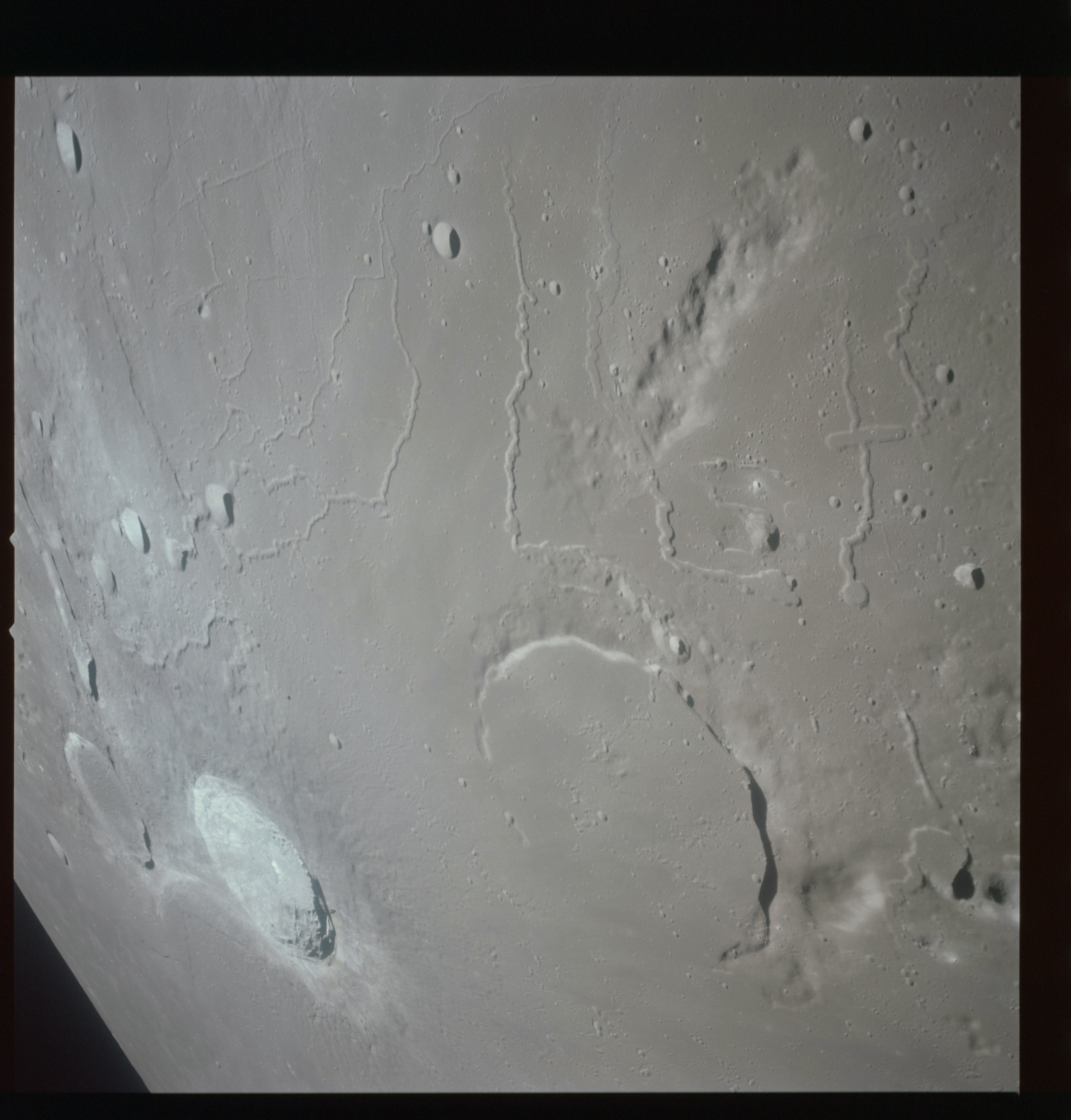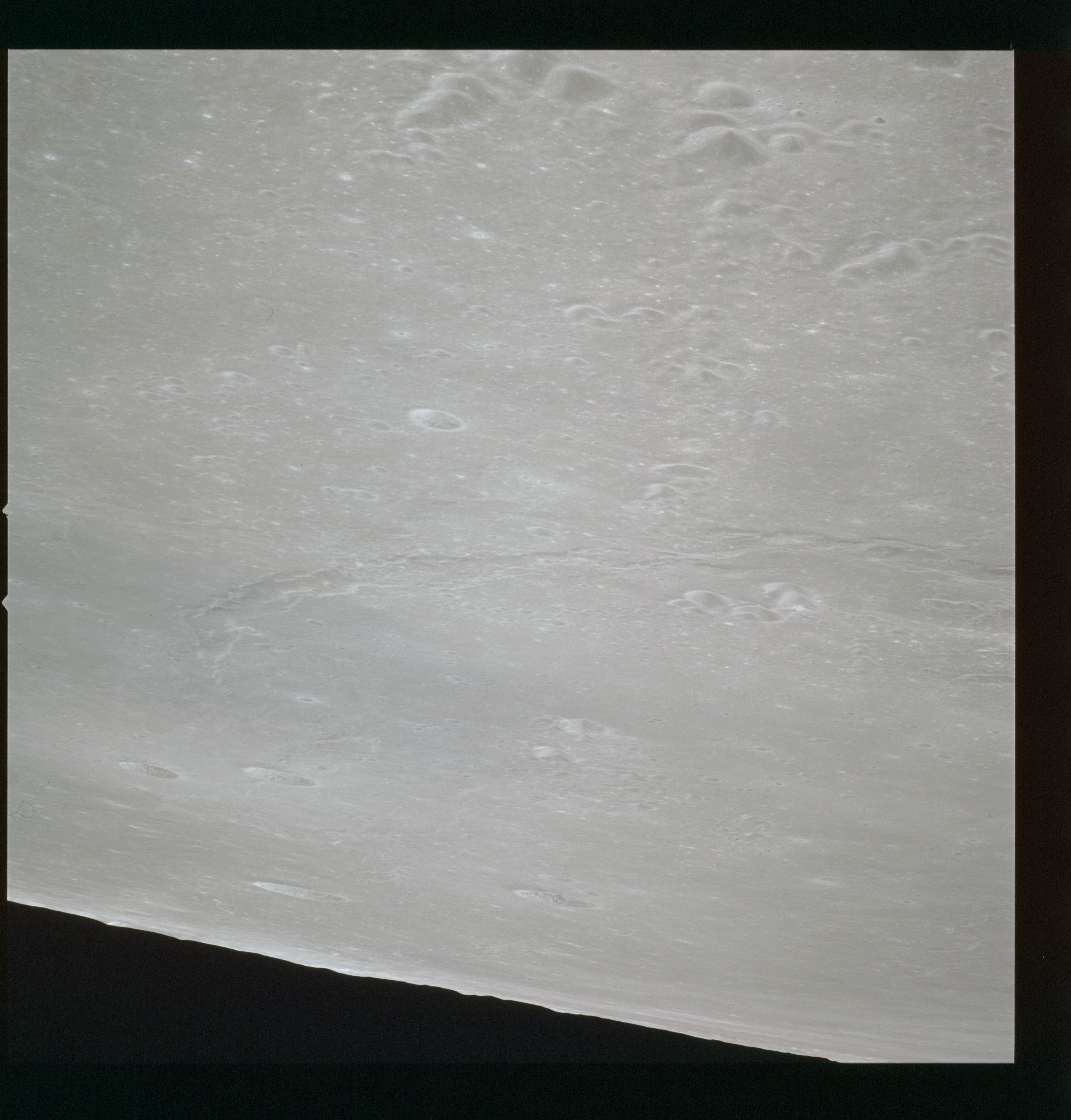 The final batch of handheld photography before reaching the terminator is on magazine P with the 80-mm lens. AS15-93-12632 shows the southern tip of the Montes Agricola range with Dorsa Burnet running alongside.