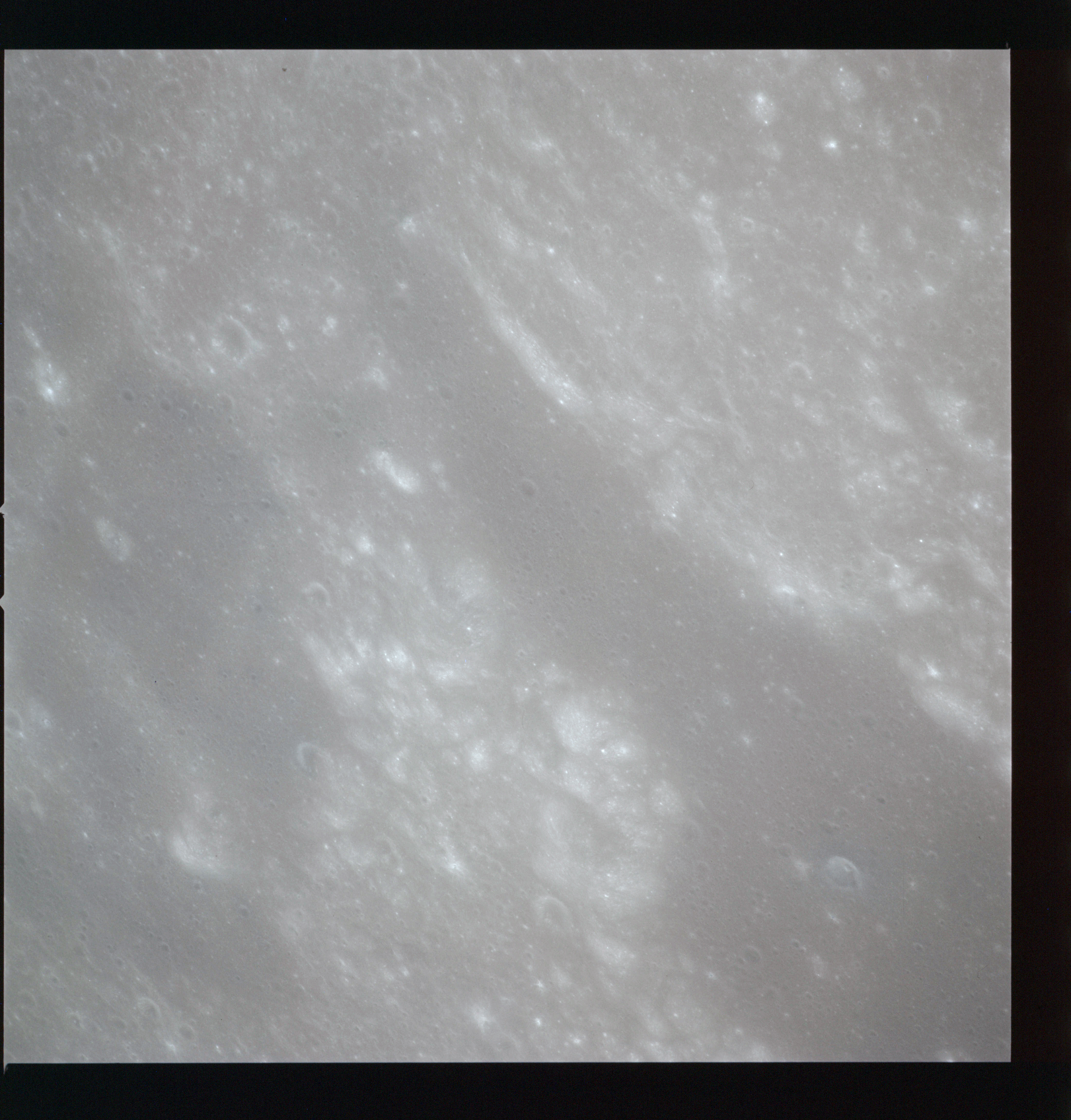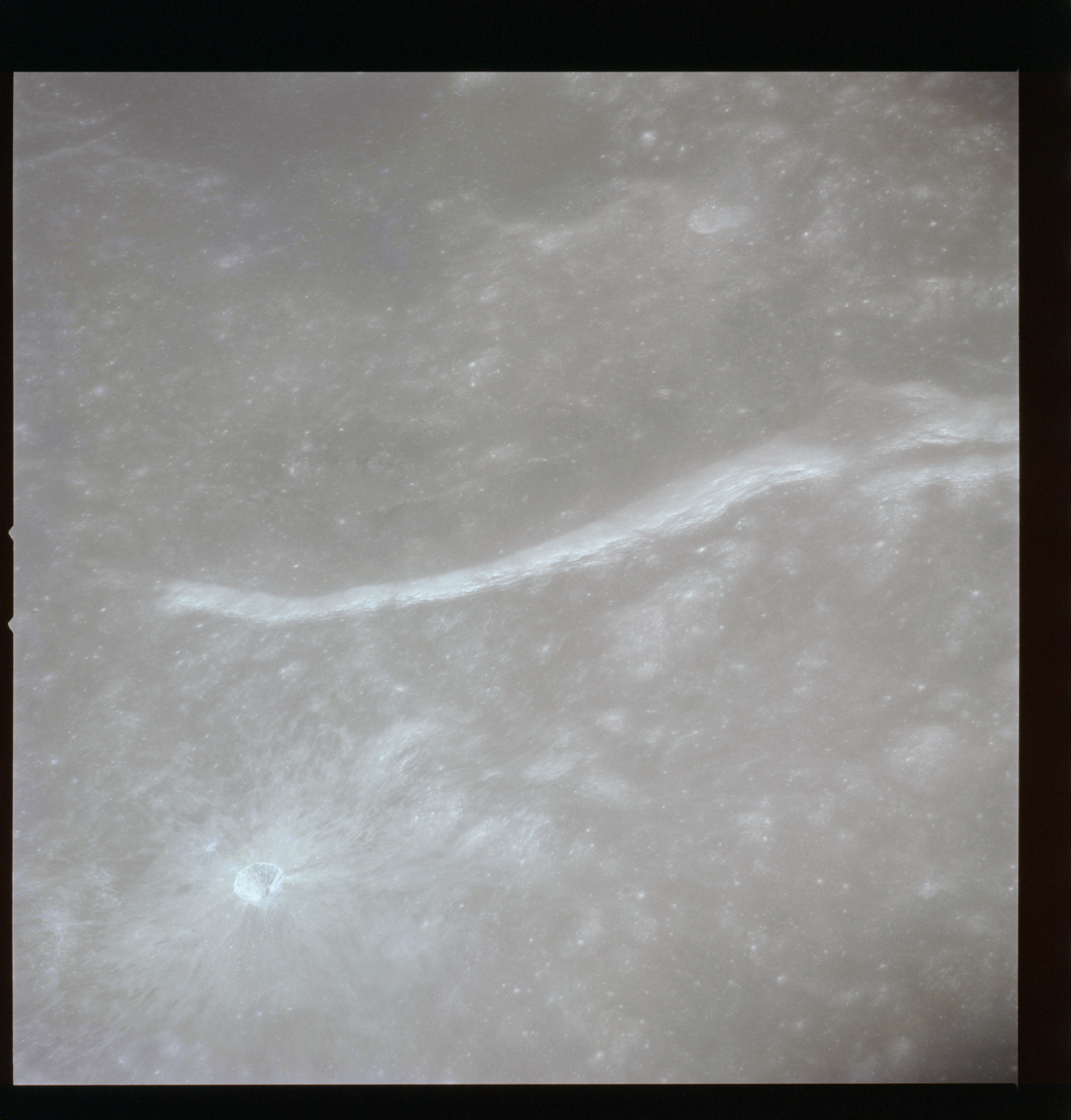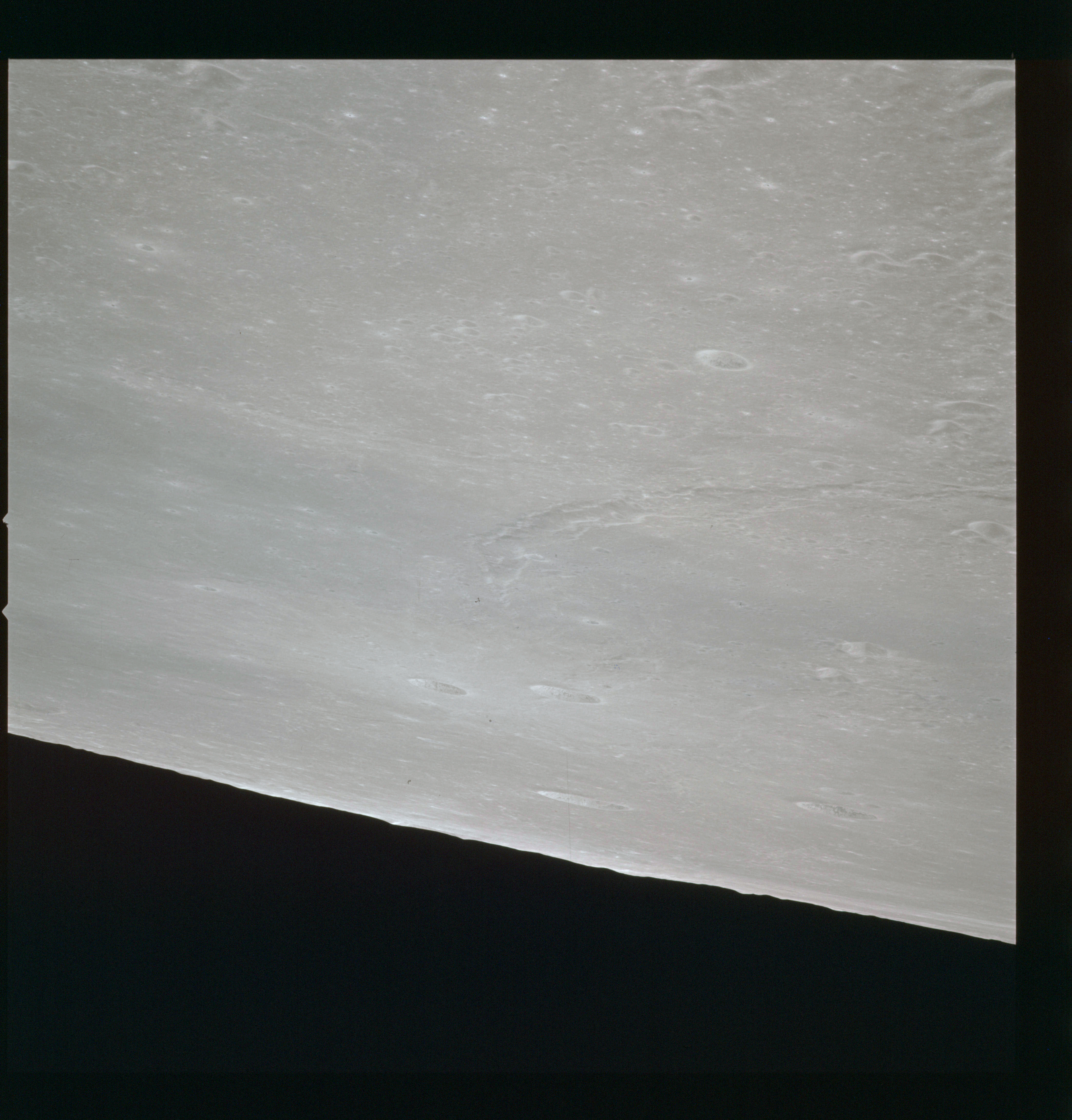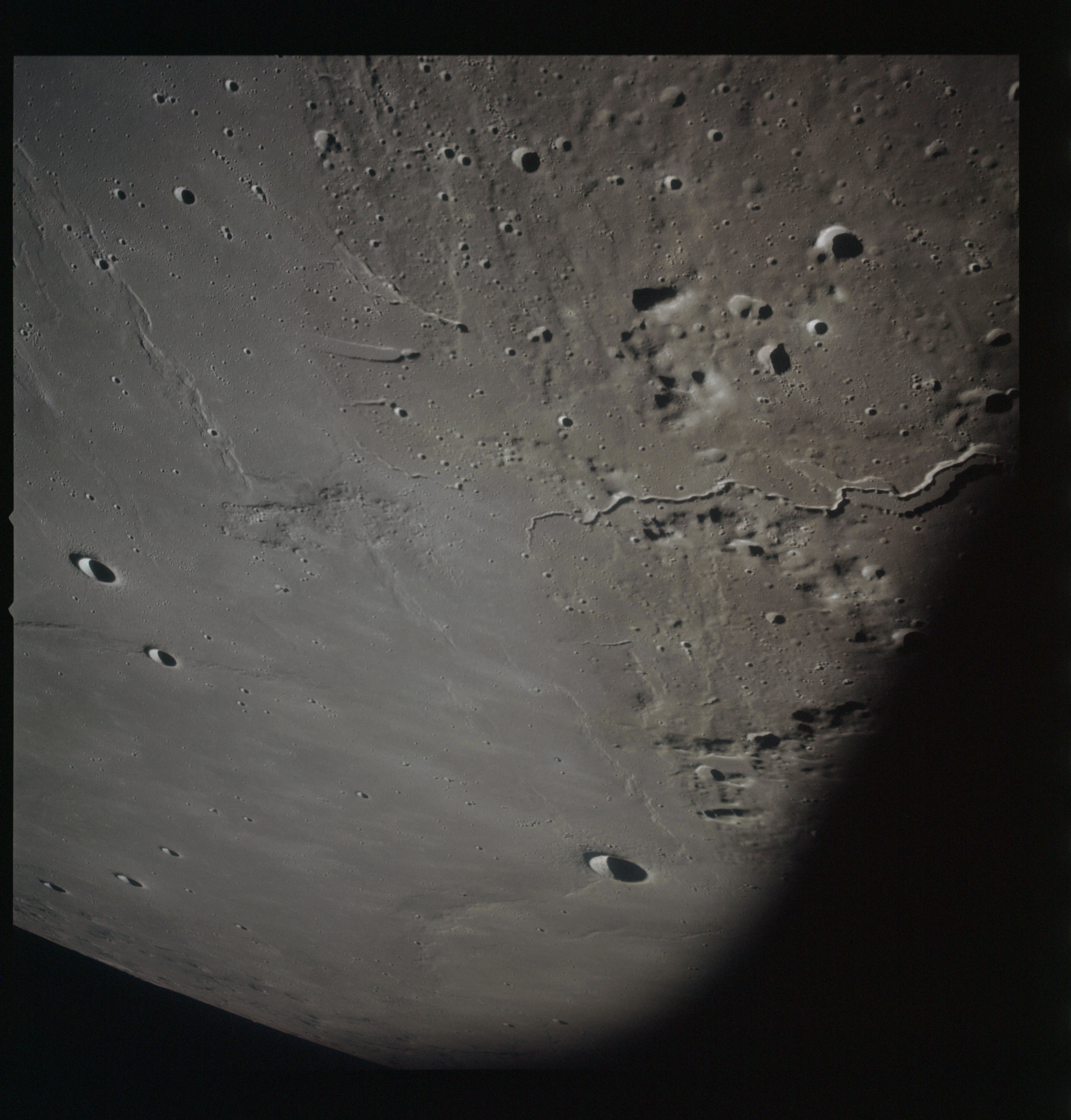 The final batch of handheld photography before reaching the terminator is on magazine P with the 80-mm lens. AS15-93-12632 shows the southern tip of the Montes Agricola range with Dorsa Burnet running alongside.