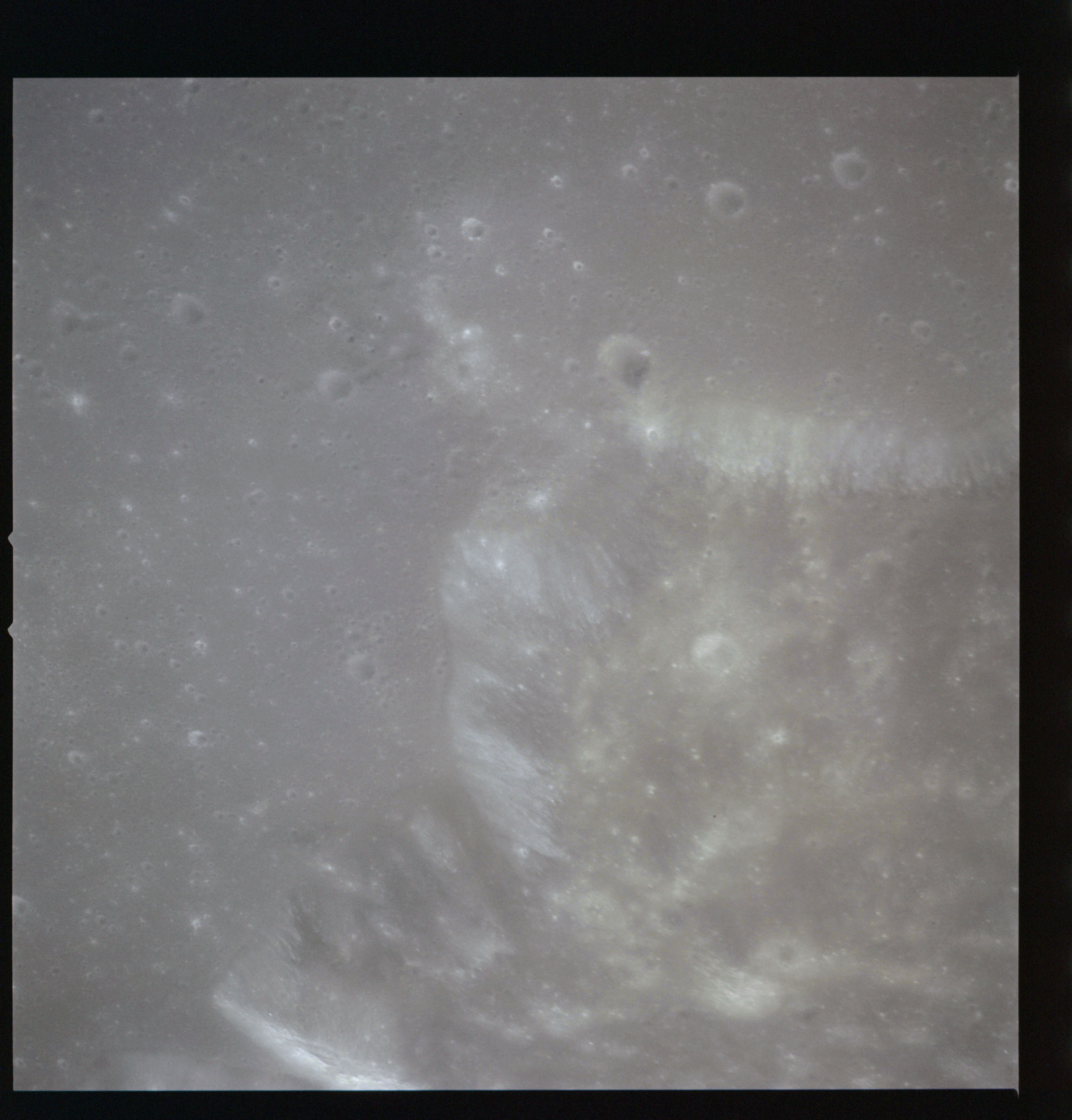 Having been taken on colour film, AS15-93-12630 displays one of the few places on the Moon where colour differences in the soil are apparent. By raising the saturation of the image, the brown tone is even easier to see but it is quite clear in the unenhanced original. The blast marks from Aristarchus' ejecta are also apparent across the mare surface.