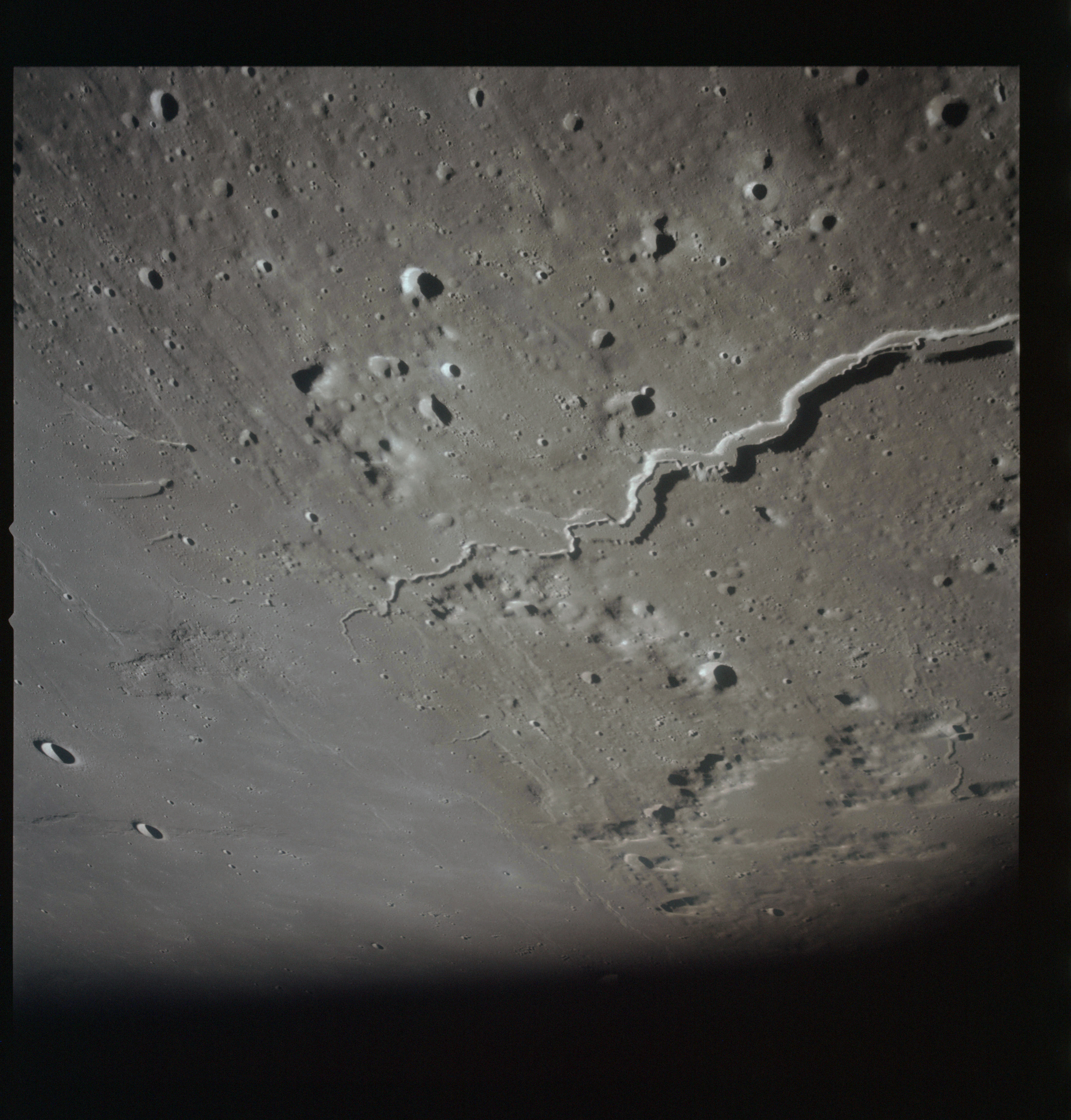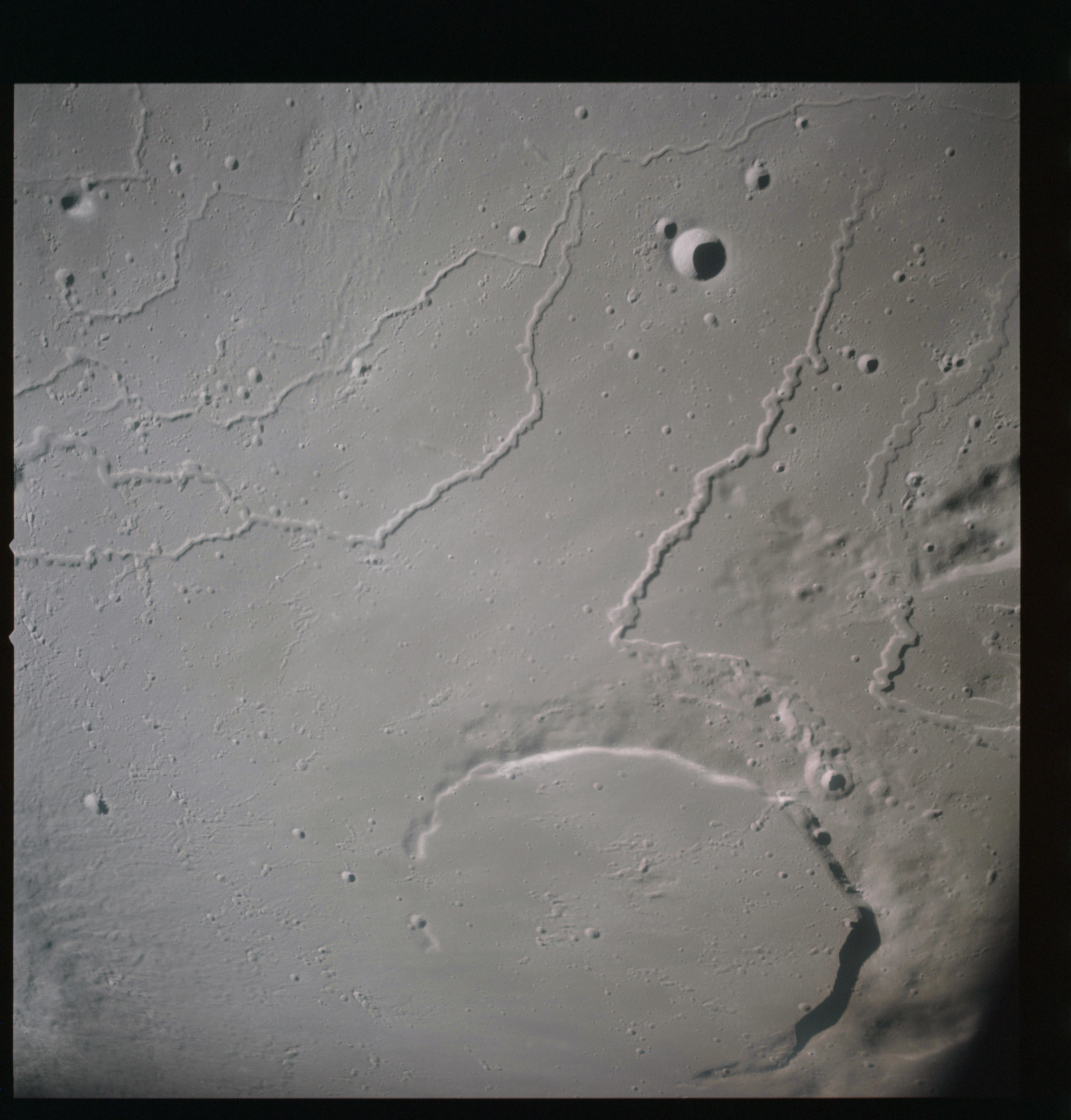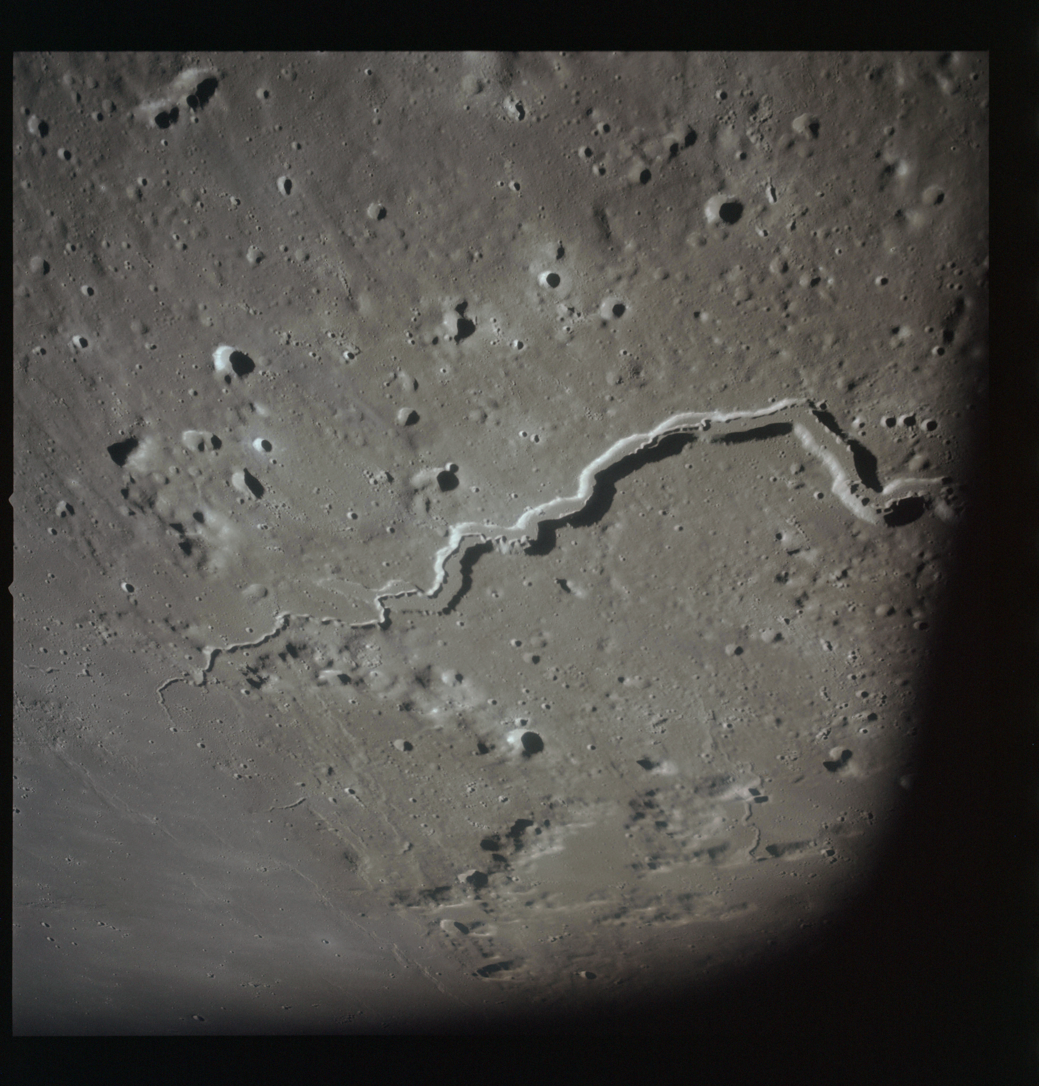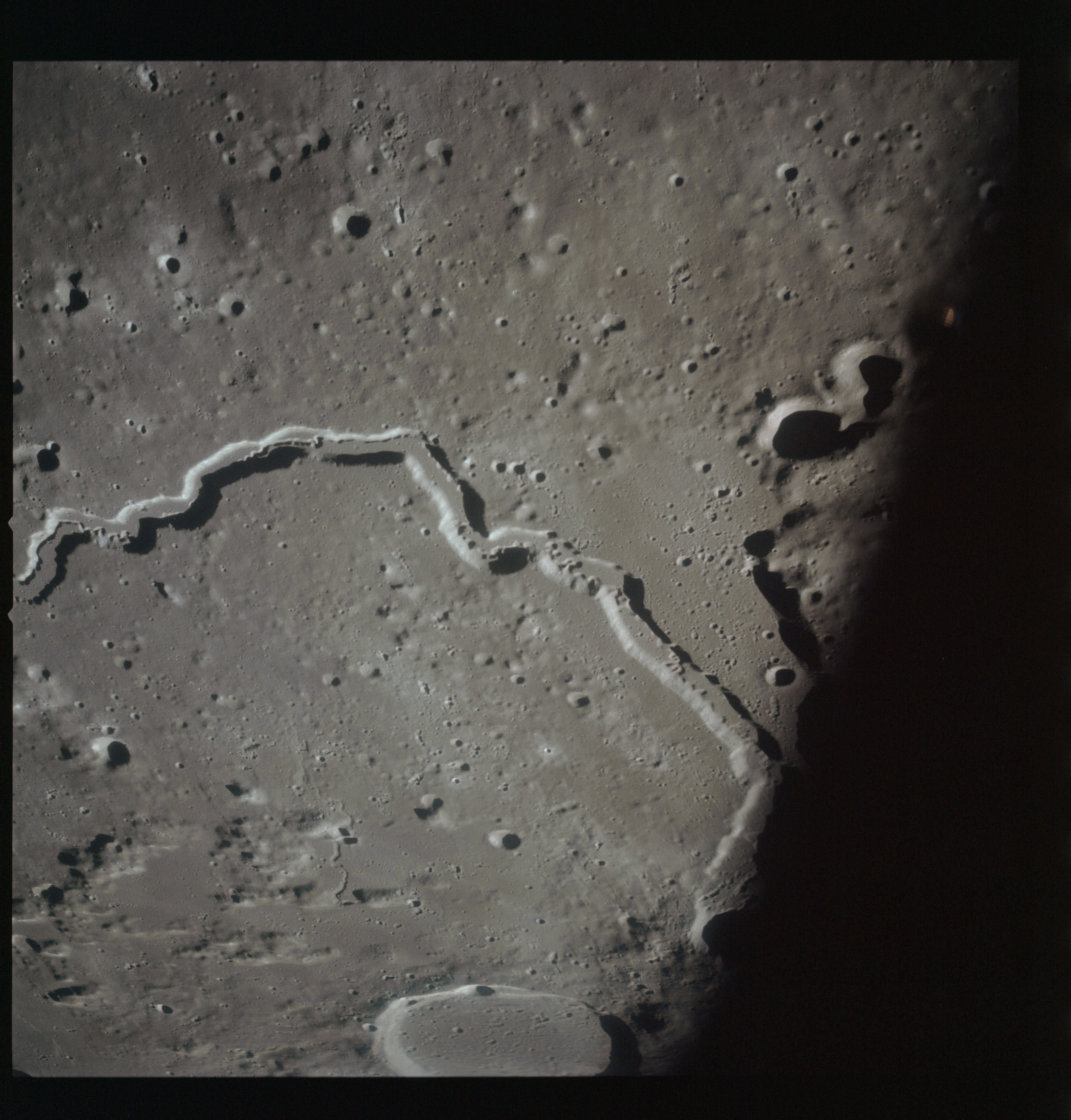 By AS15-92-12502, Vallis Schröteri has diverted to the west leaving the smaller rille break through its southern wall to carry on into Oceanus Procellarum.