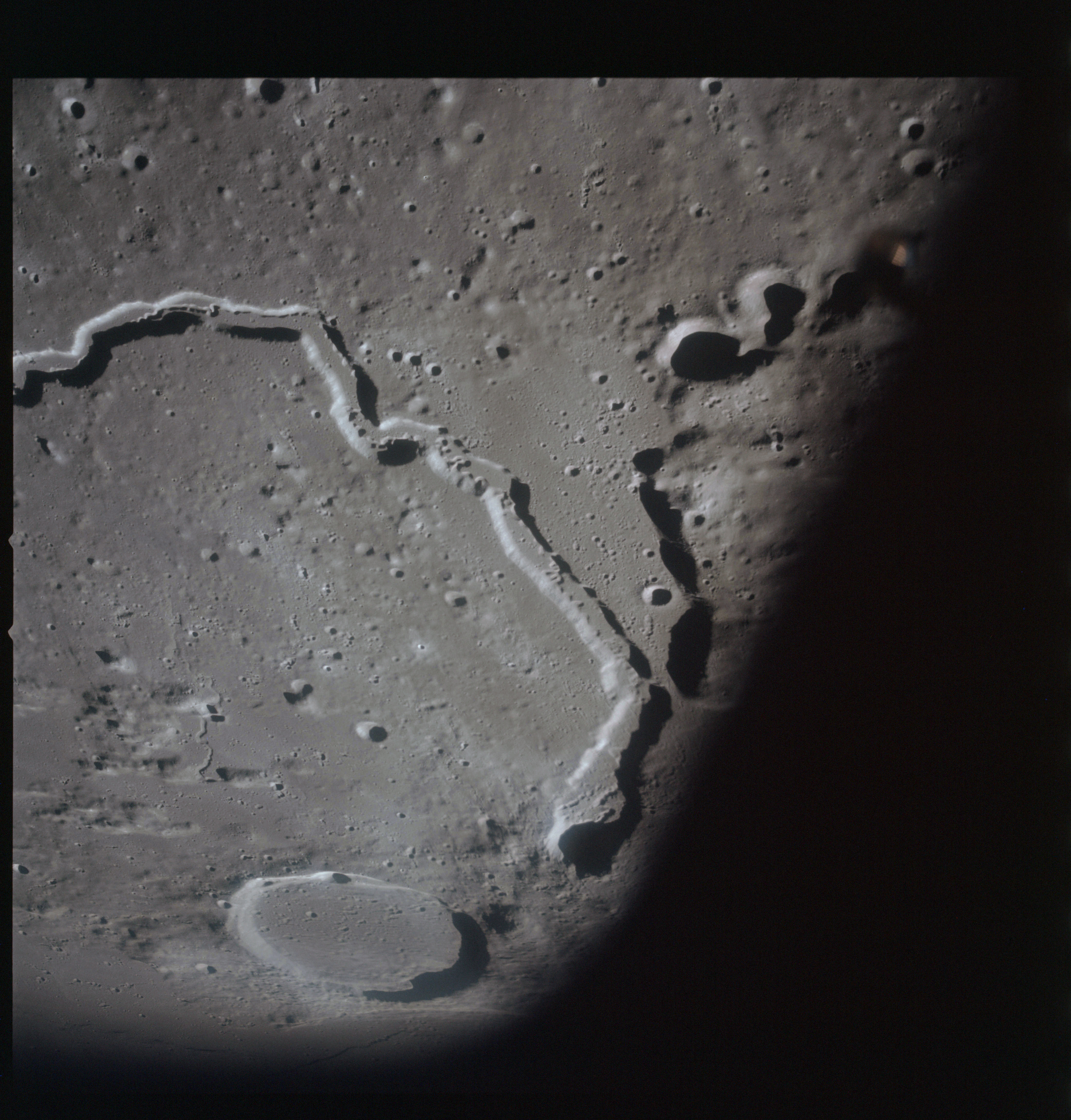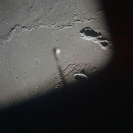AS15-93-12636 - The southwest end of Montes Agricola and Dorsum Burnet. The CSM EVA light is out of focus in the foreground - Image by NASA/Johnson Space Center.