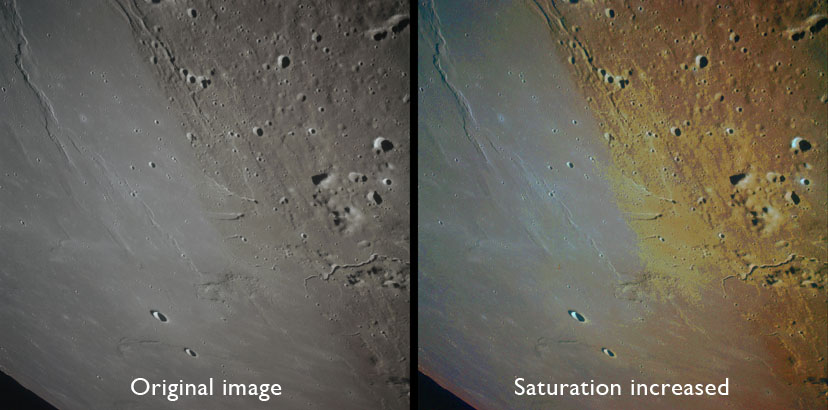 A comparison of the AS15-93-12630 with and without increased saturation showing the slightly warm colour of the Aristarchus Plateau - Source image by NASA/Johnson Space Center.