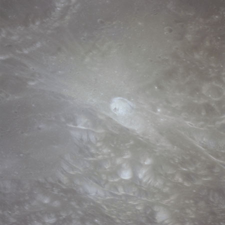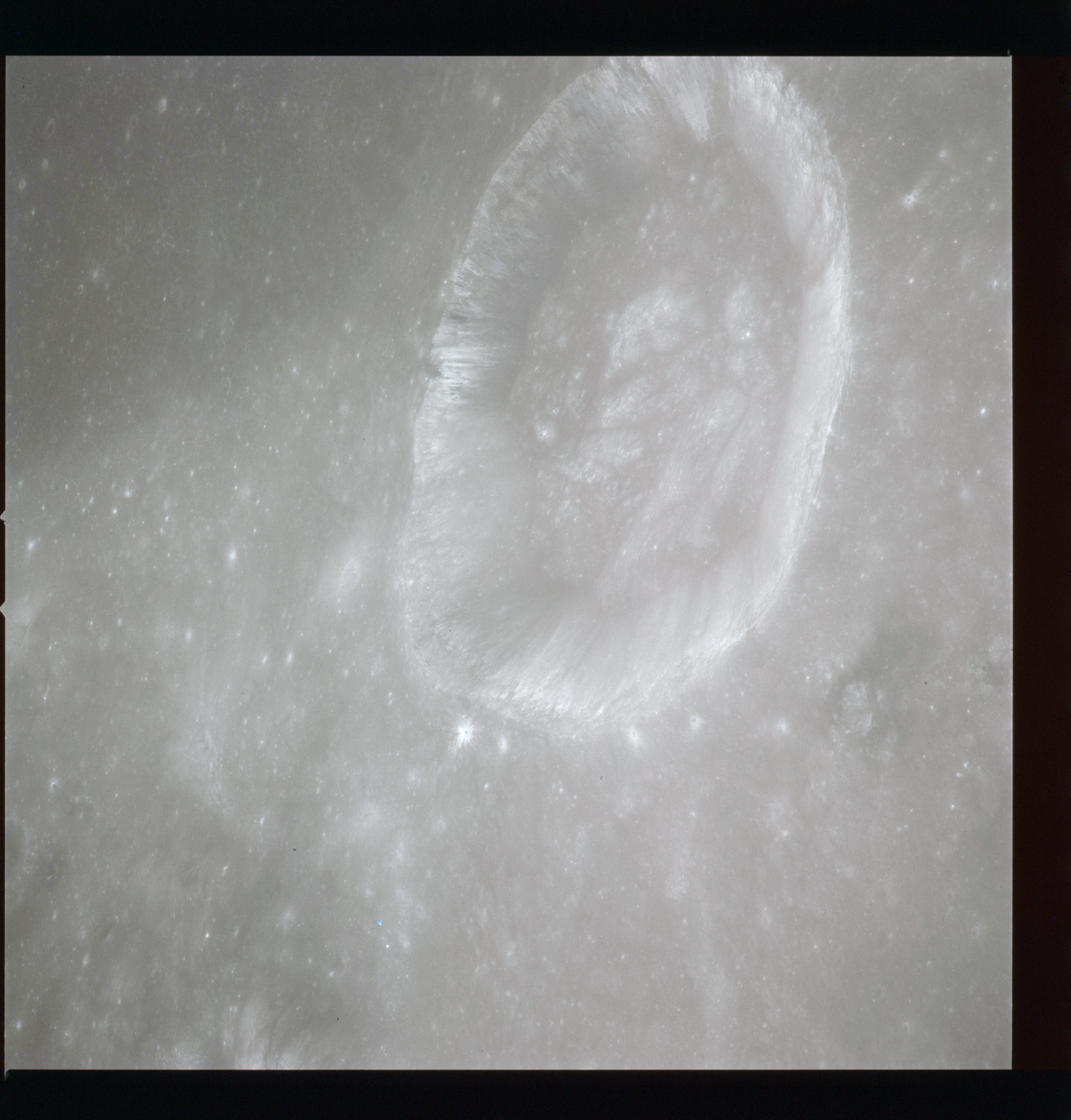 Worden, from 1971 Visual Observation Debrief: "Not the crater itself so much, but the crater was bright. That's an impression you get when you're coming up on it, because the only thing you see is the ejecta pattern. And that comes right straight at you out of the darkness as you're going over it. ... The inside of it is fairly bright too. But the thing that really catches your eye is this ejecta pattern that's out around it, with that big long tail that sticks out to the southwest. ... Cobra-Head looks like nothing but just a sheer cliff around there."