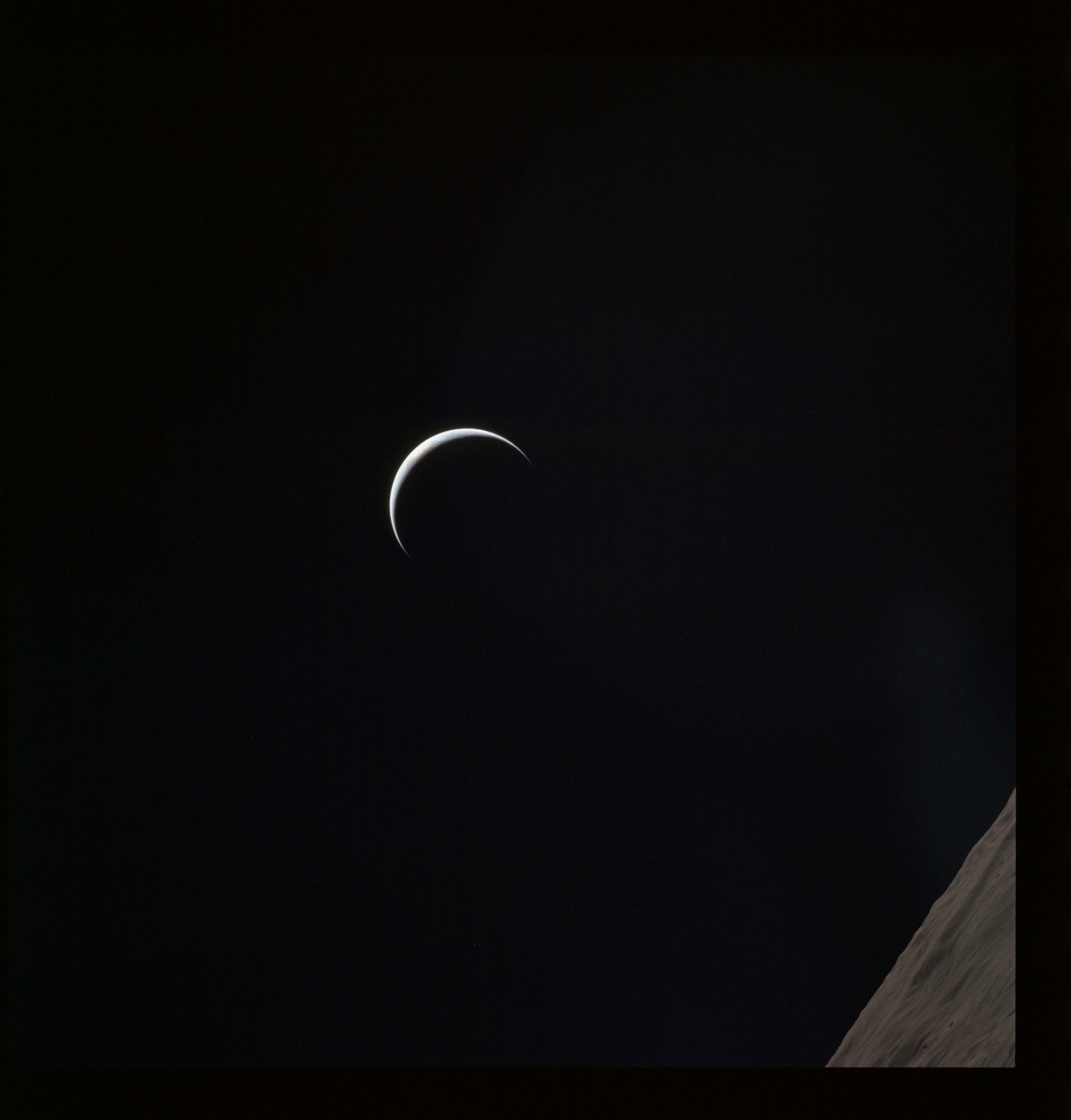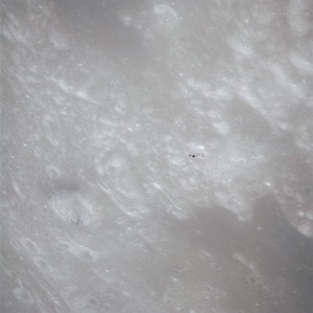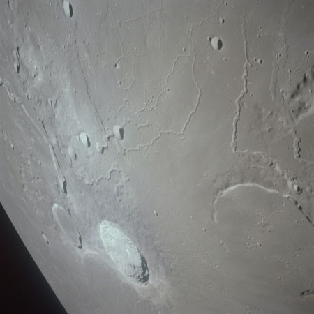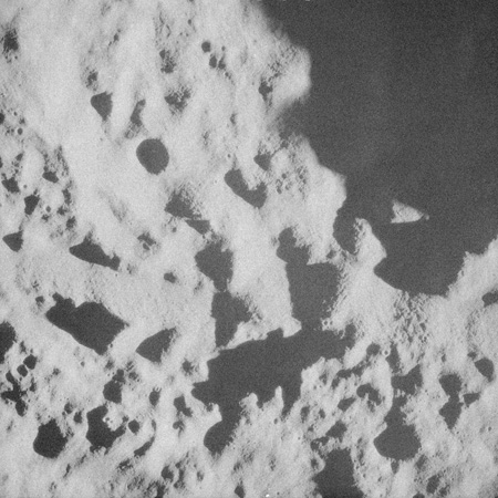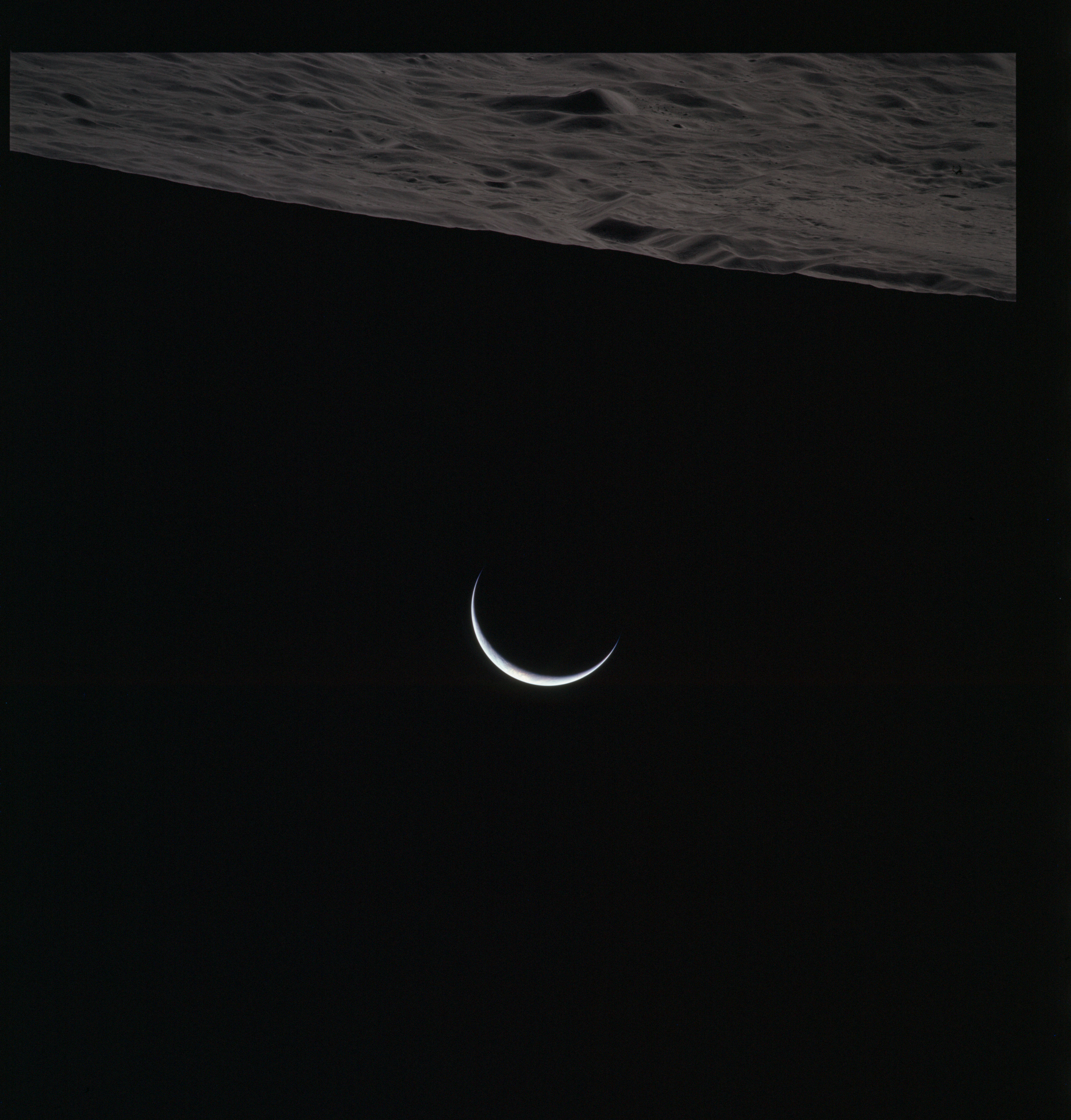 One of these is often composited with the above image of Curie that, in the opinion of this author (Woods), produces one of the most profound images of the Apollo program. Al used it for the cover of his book of poetry, 'Hello Earth, Greetings From Endeavour' and a similar composite also found its way into Michael Light's beautiful and lyrical collection of Apollo imagery, 'Full Moon'., Here, the previous two images have been composited.