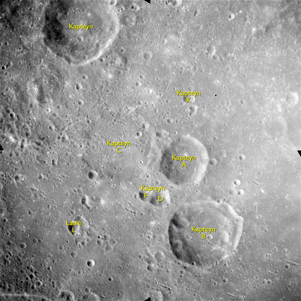 Crater Kapteyn E is also in this picture, a larger feature with a large, domed central peak at the upper left. Maclaurin D is semi-obscured at the lower left.