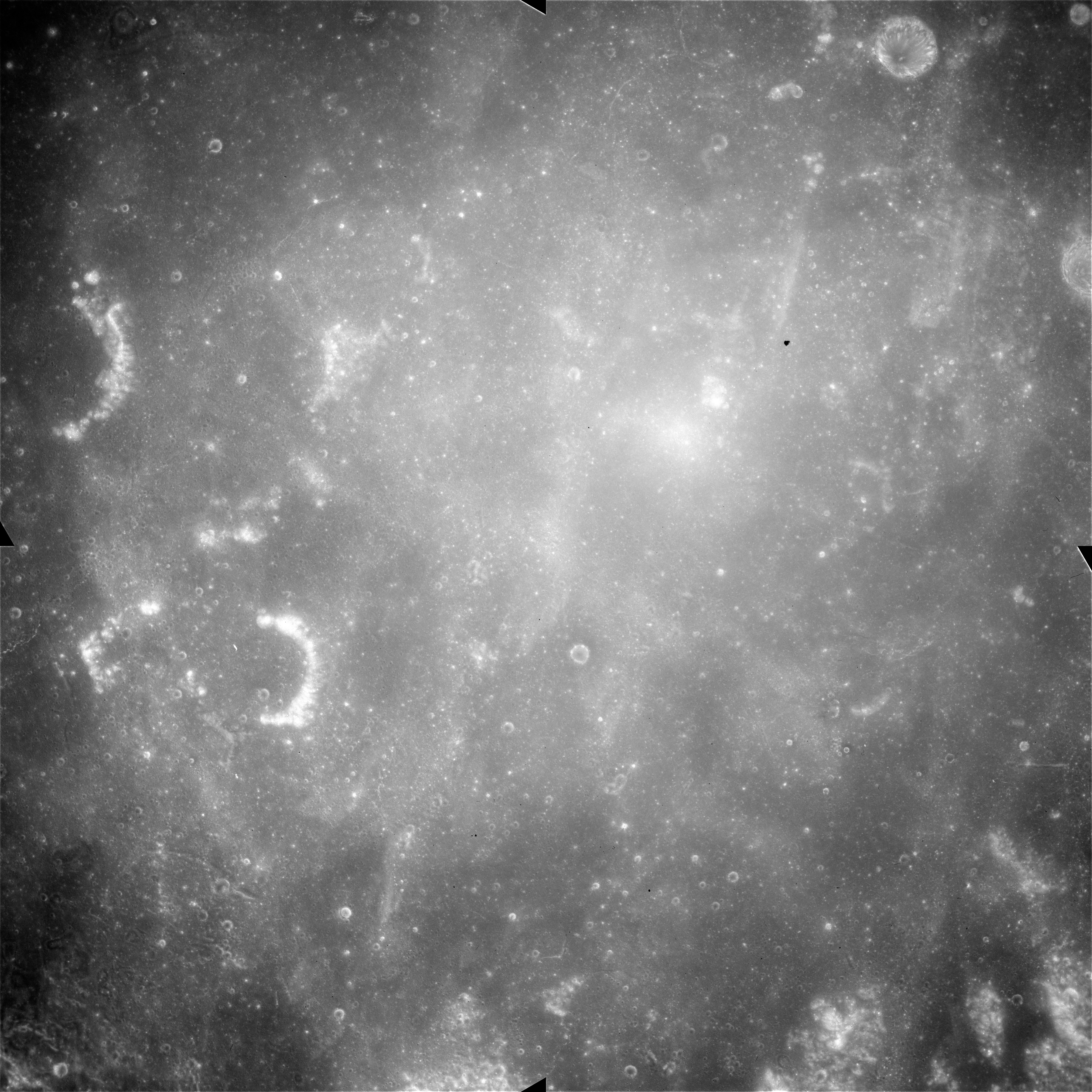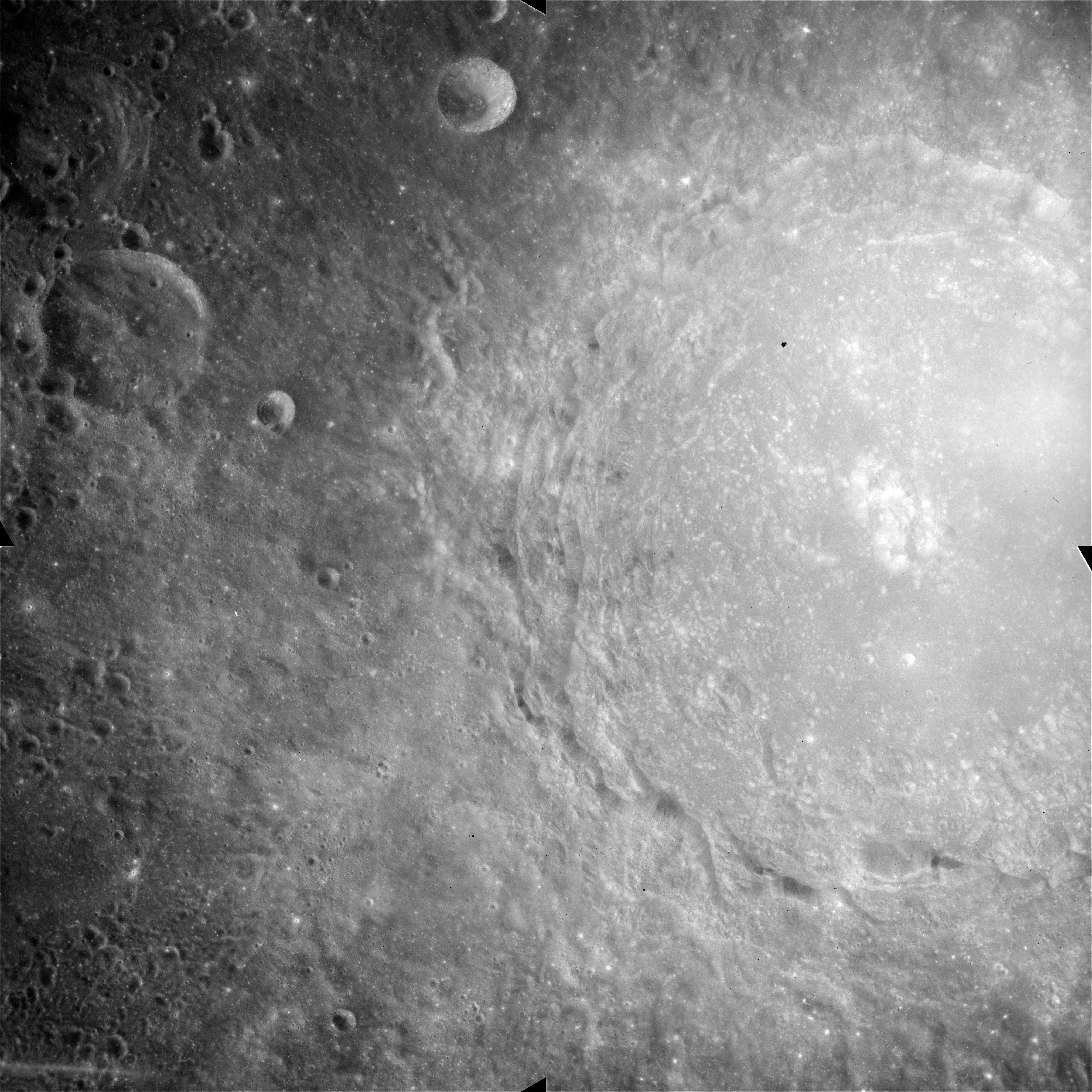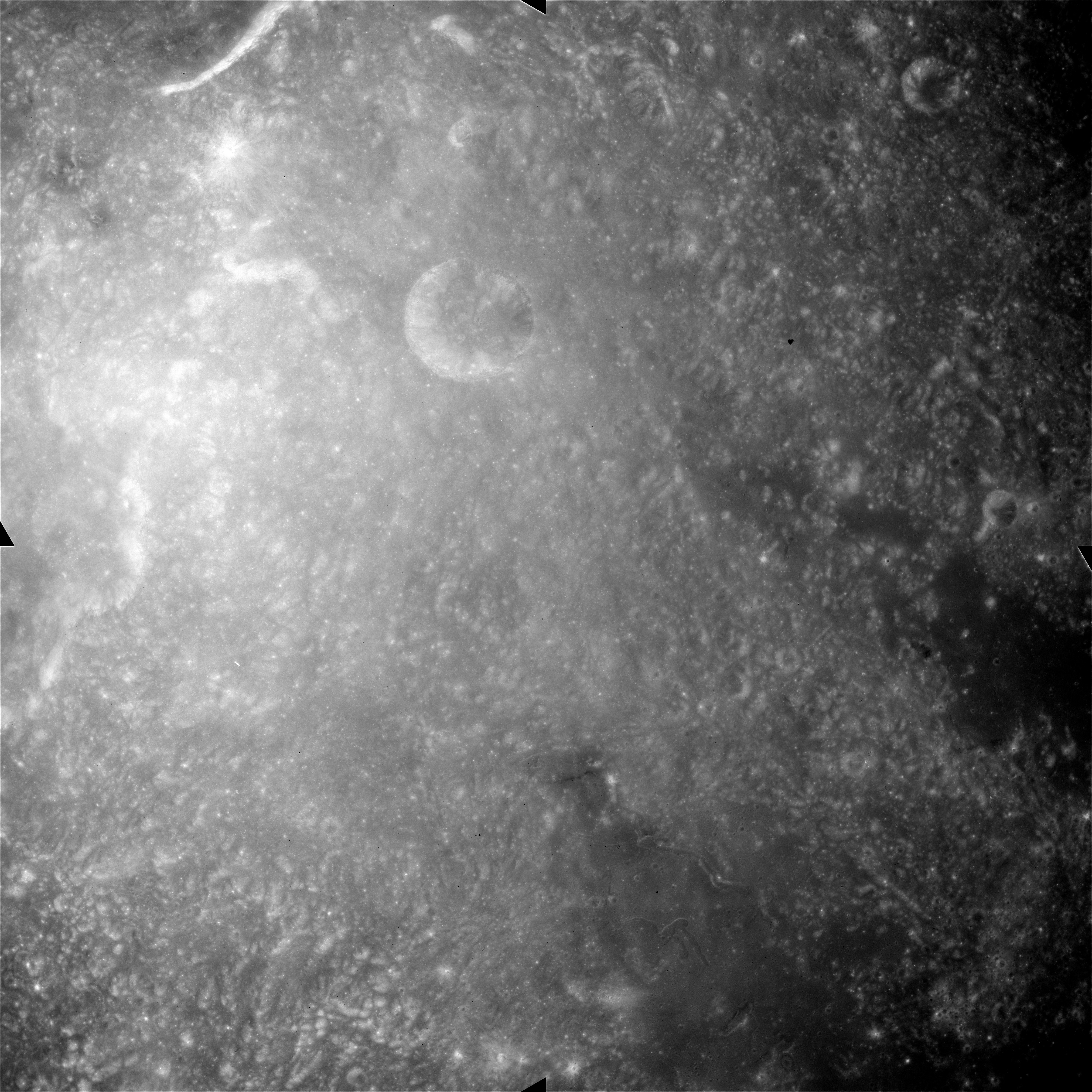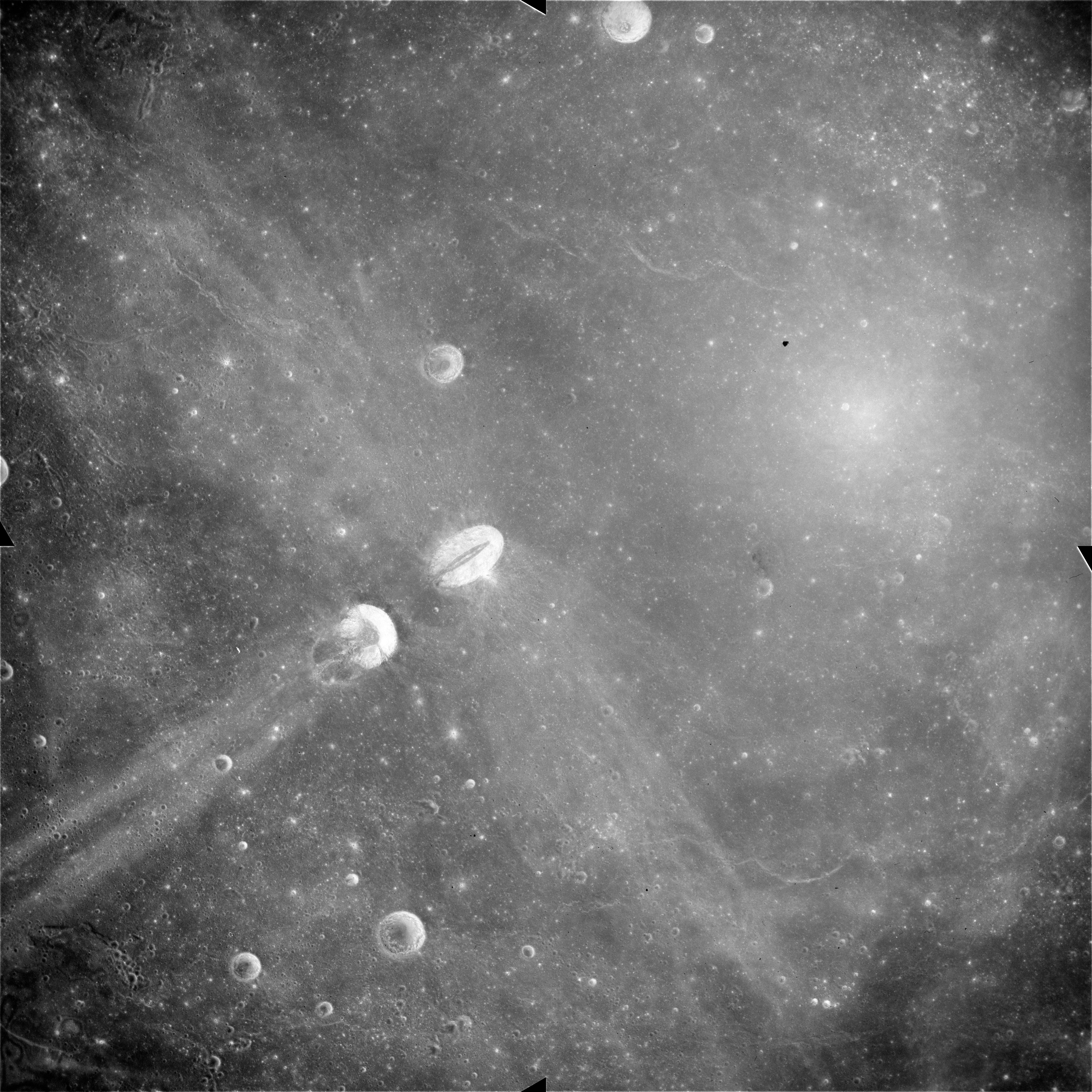 AS15-90-12319 and 12320 continue the wide-angle view northwest towards the Messier Twins; Messier and Messier A. The twin rays emanating westwards from this pair are well shown as is a fainter ray that crosses Messier perpendicular to its axis.