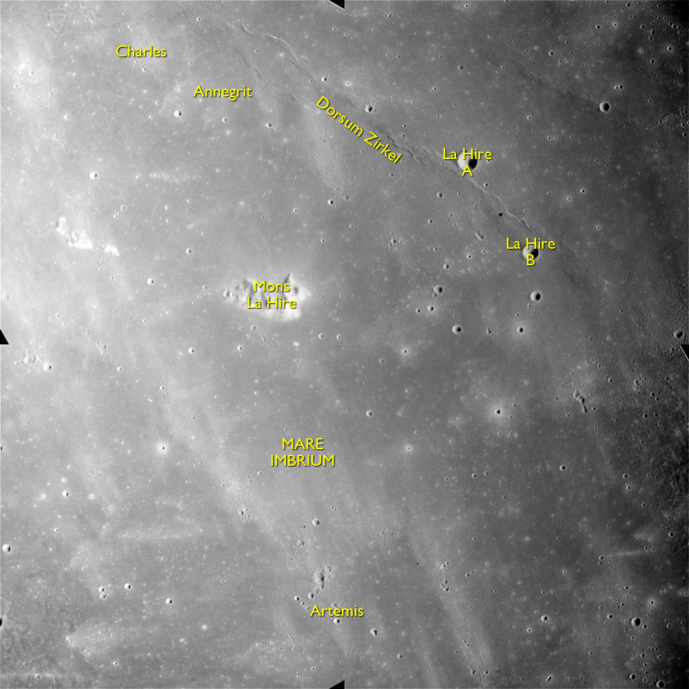 The most prominent crater in the foreground is Lindbergh, a 13-kilometre bowl formerly known as Messier G but now named after one of a major figure in American aviation, Charles A. Lindbergh, 1902-1974, who was the first person to fly solo across the Atlantic Ocean taking 33½ hours on 20-21 May 1927.