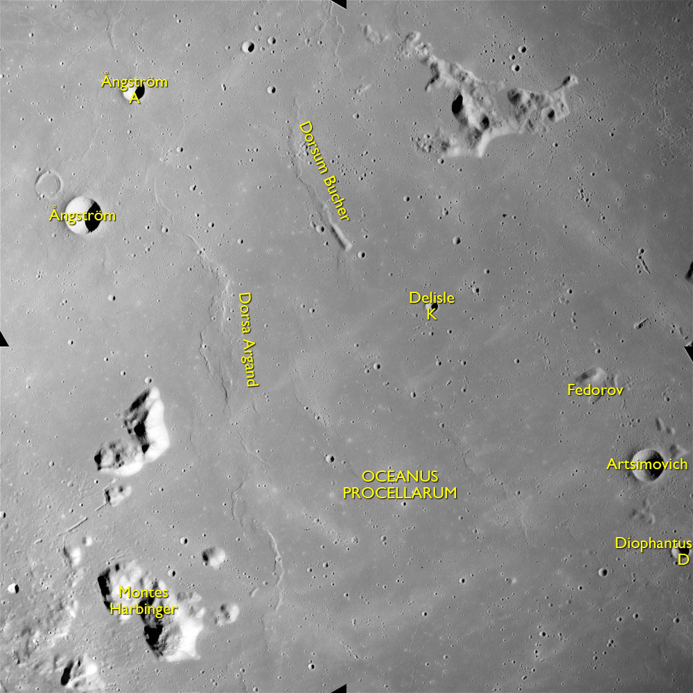 At about the time that Endeavour passes Langrenus and is heading towards Mare Fecunditatis, two photos are taken the colour magazine O and medium telephoto lens. These are frames AS15-97-13279 and 13280, oblique views across to the northwestern horizon. The wrinkle ridge which curves in the foreground towards four craters is Dorsum Geikie named after Sir Archibald Geikie, 1835-1924, a geologist from Scotland. The furthest and largest of the four craters is Anville, formerly Taruntius G, an 11-km crater named after Jean Baptiste d'Anville, 1697-1782, a French cartographer, and the other three are, from left to right, Taruntius K, P and H.