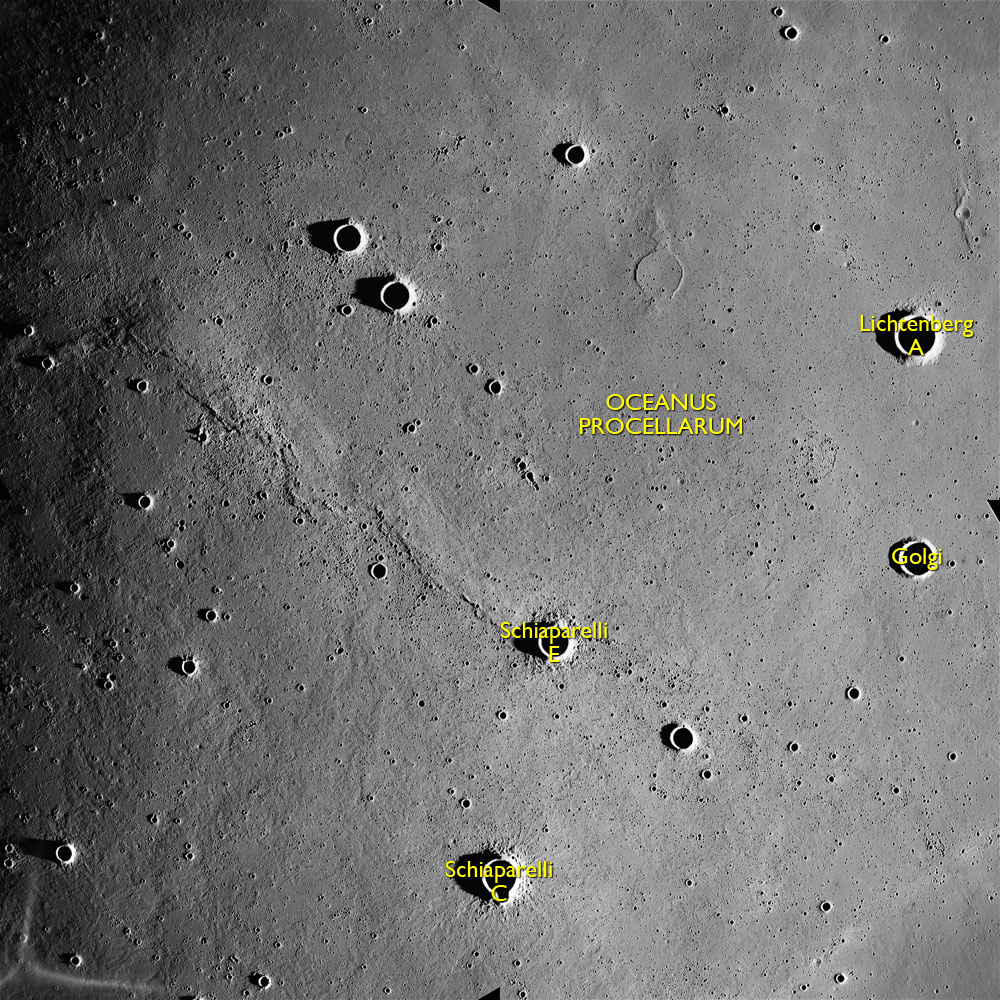 AS15-M-2490 - Metric Camera image of Oceanus Procellarum including craters Schiaparelli C, E, Lichtenberg A and Golgi. Image taken at about 215:18. (250 megapixel version), (labelled version) - Image by NASA/ASU.