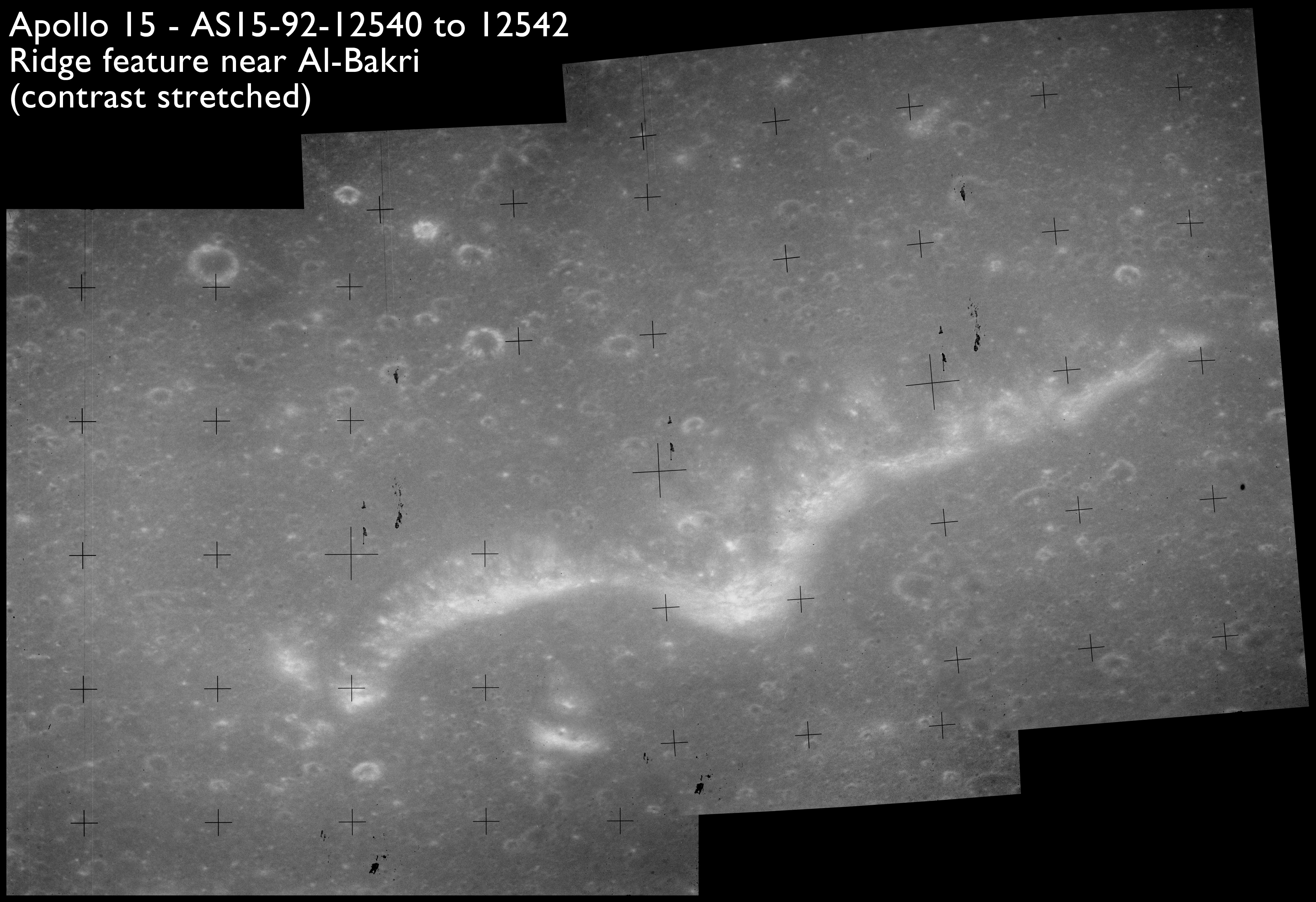 The next set of frames, AS15-93-12724 to 12728, follow a wrinkle ridge northwards across Oceanus Procellarum to where it becomes a string of collapsed pits, presumeably betraying a lava tube.