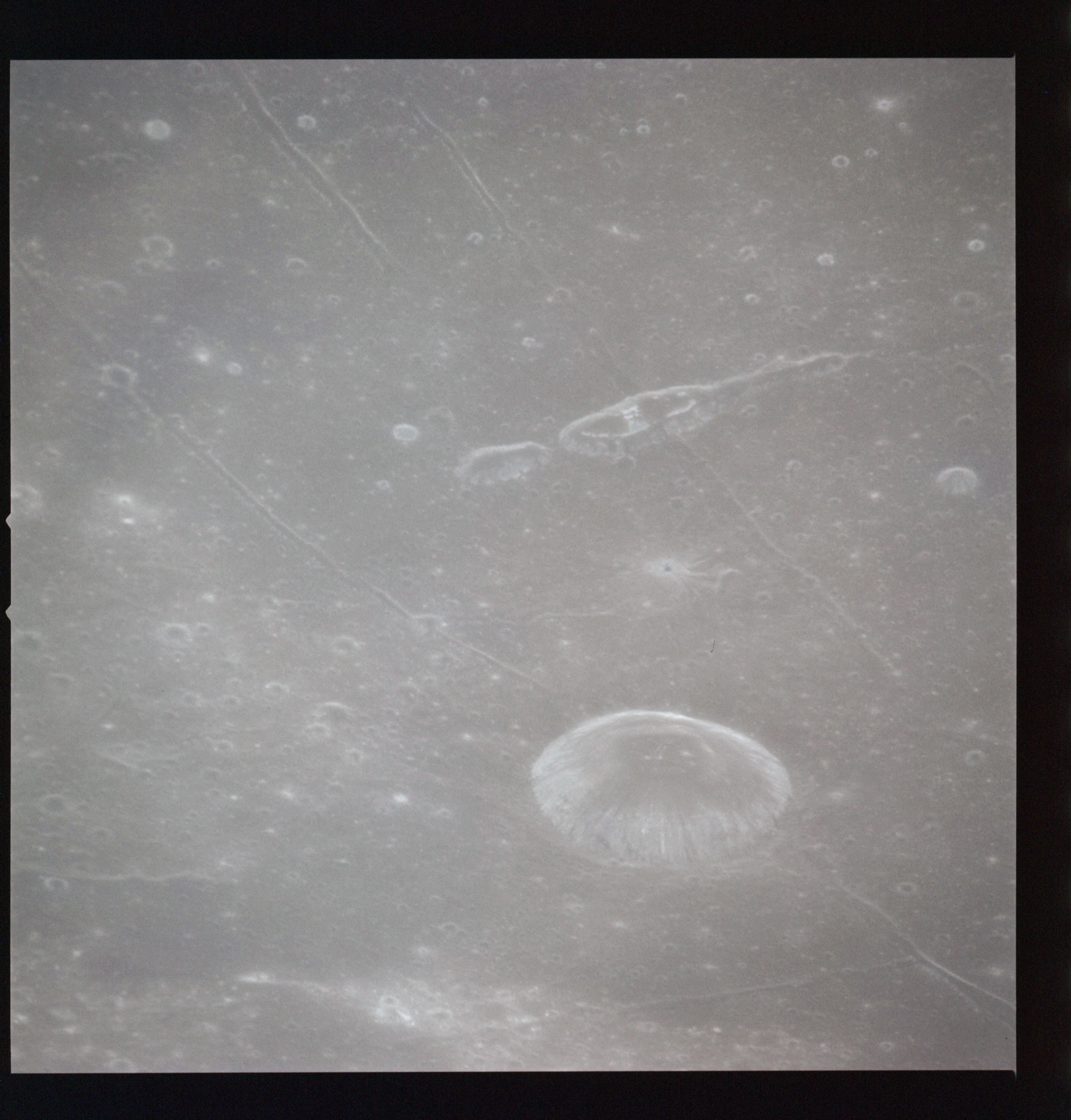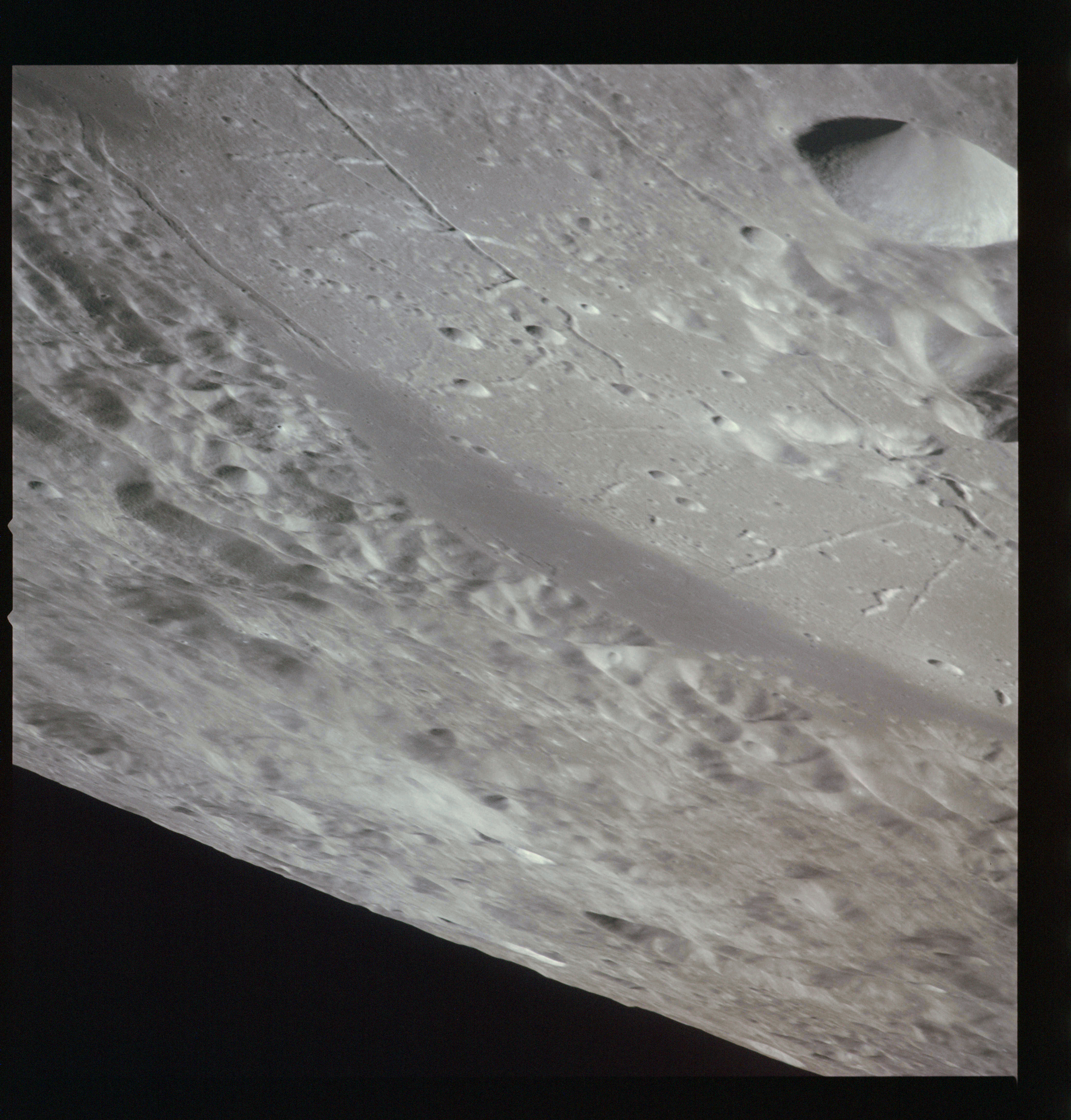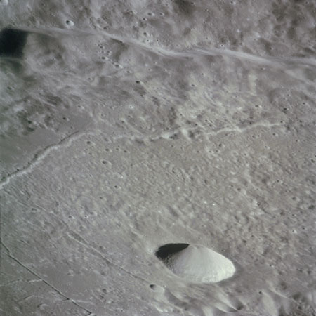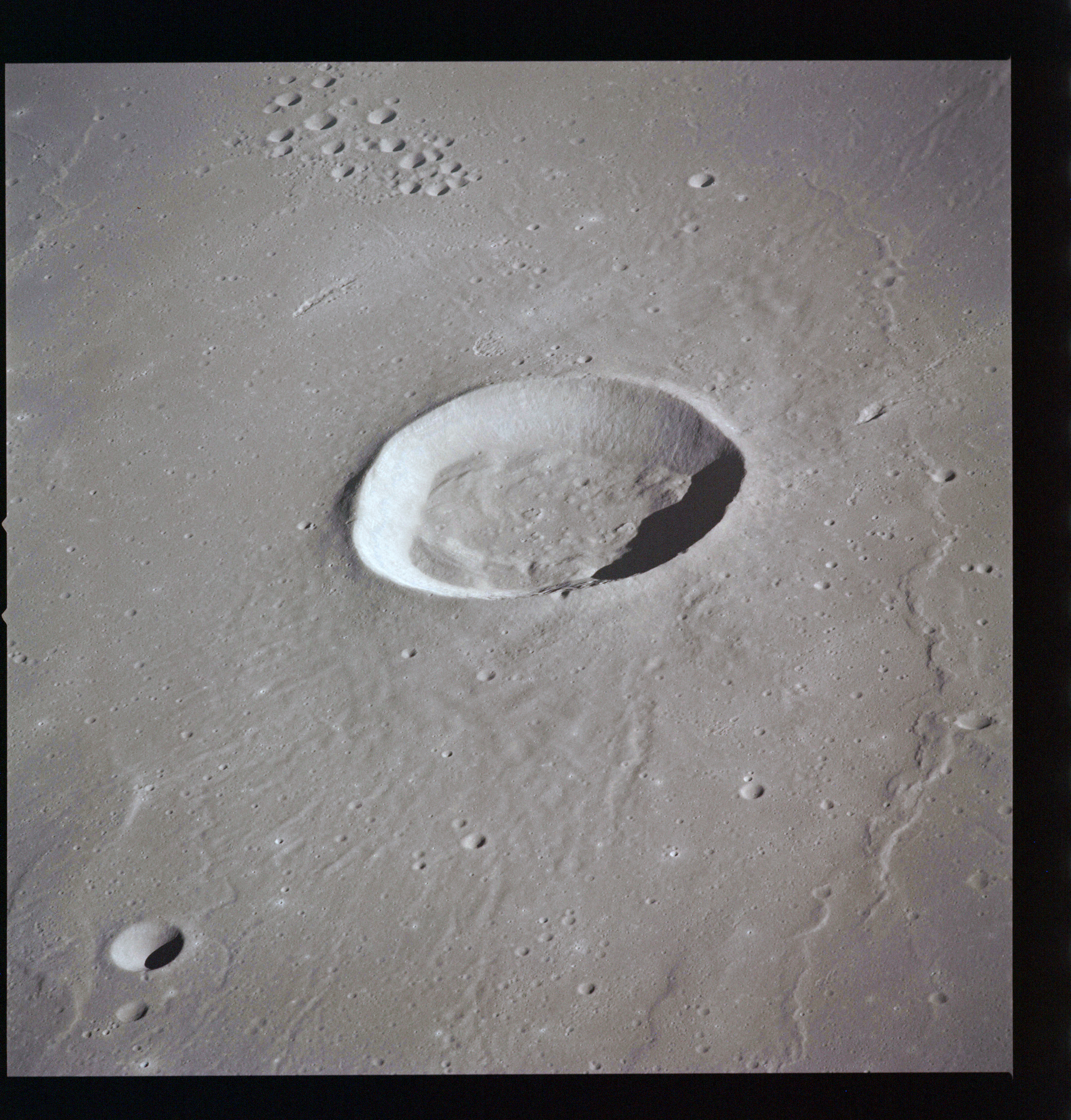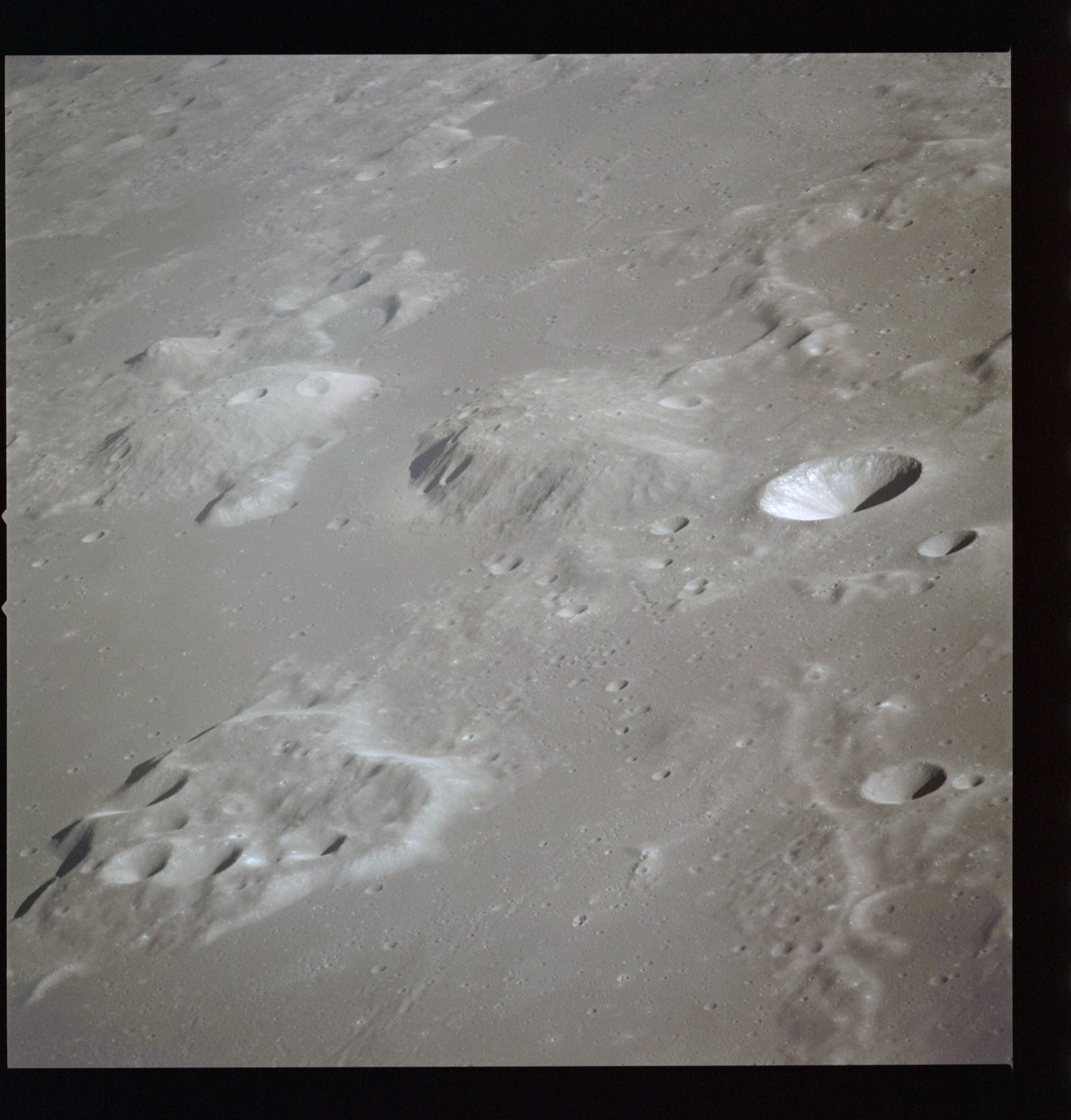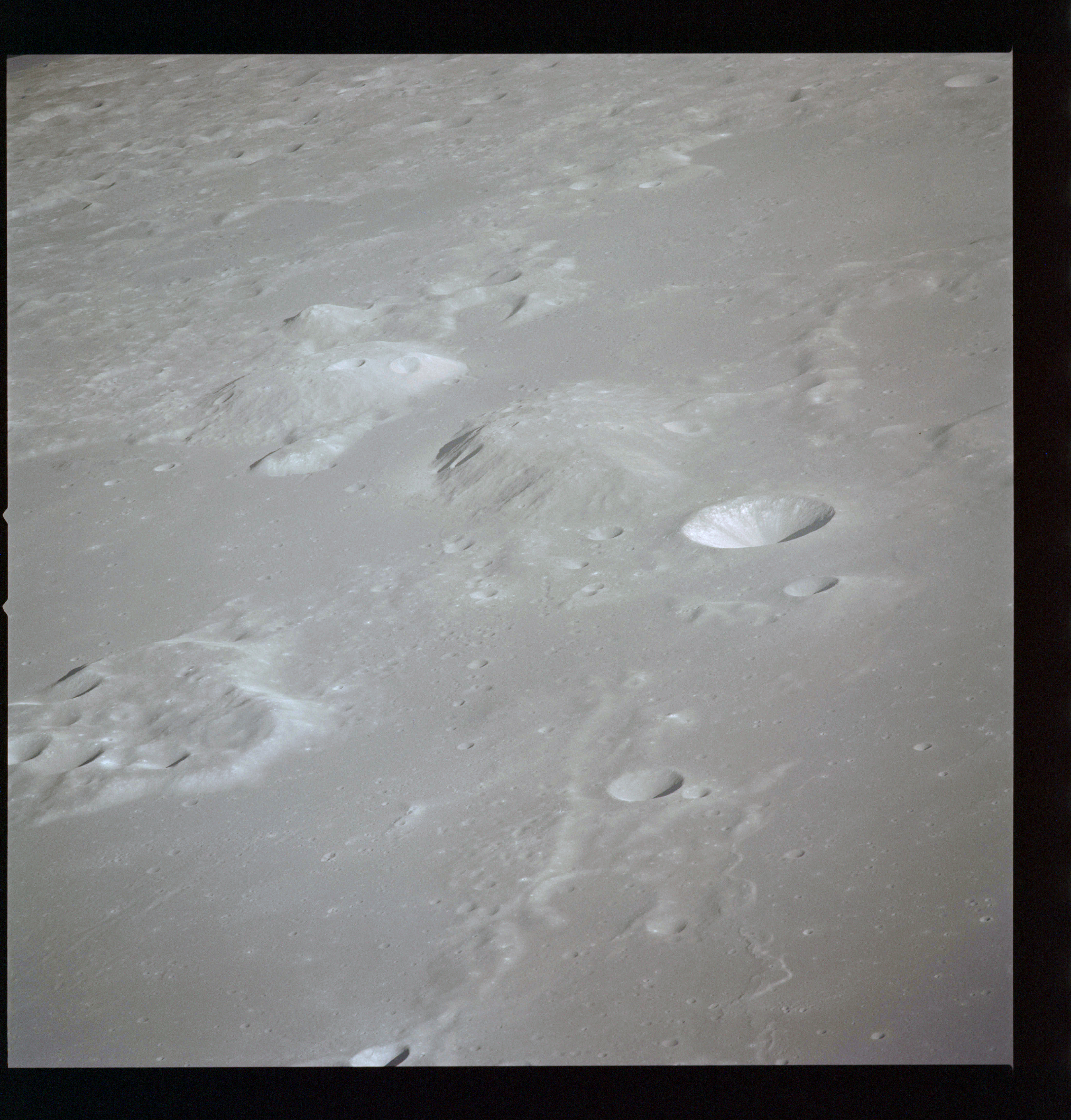 The 16-kilometre crater after which so many of these features are named is nicely framed in AS15-93-12719. Franz von Paula Gruithuisen, 1774-1852, was a German astronomer who pioneered lunar study in two opposing ways. He was the first to postulate an impact theory to explain the lunar craters, an idea now very widely accepted. However, through his active imagination, he announced the discovery of buildings and cities on the Moon, writing a book on the subject. Centuries later, there are still people who claim to detect non-human intelligent artifacts through close study of the imagery from manned and unmanned photography of the lunar surface, a concept that is very widely rejected. To the northwest of Gruithuisen is a large, dense cluster of small craters. These are likely to be secondary craters formed by the impact of a loose clump of debris, themselves ejected from a large, distant impact.