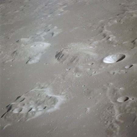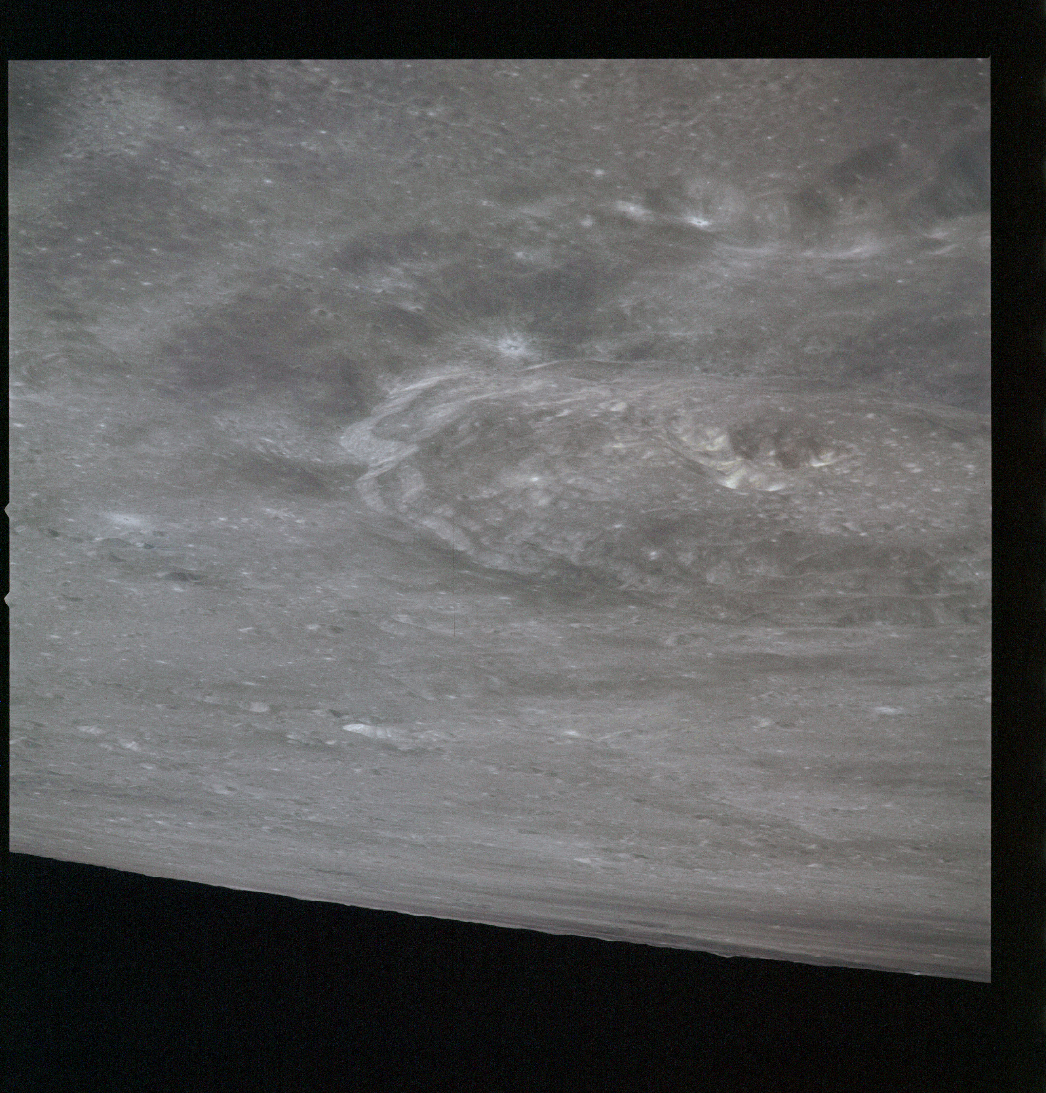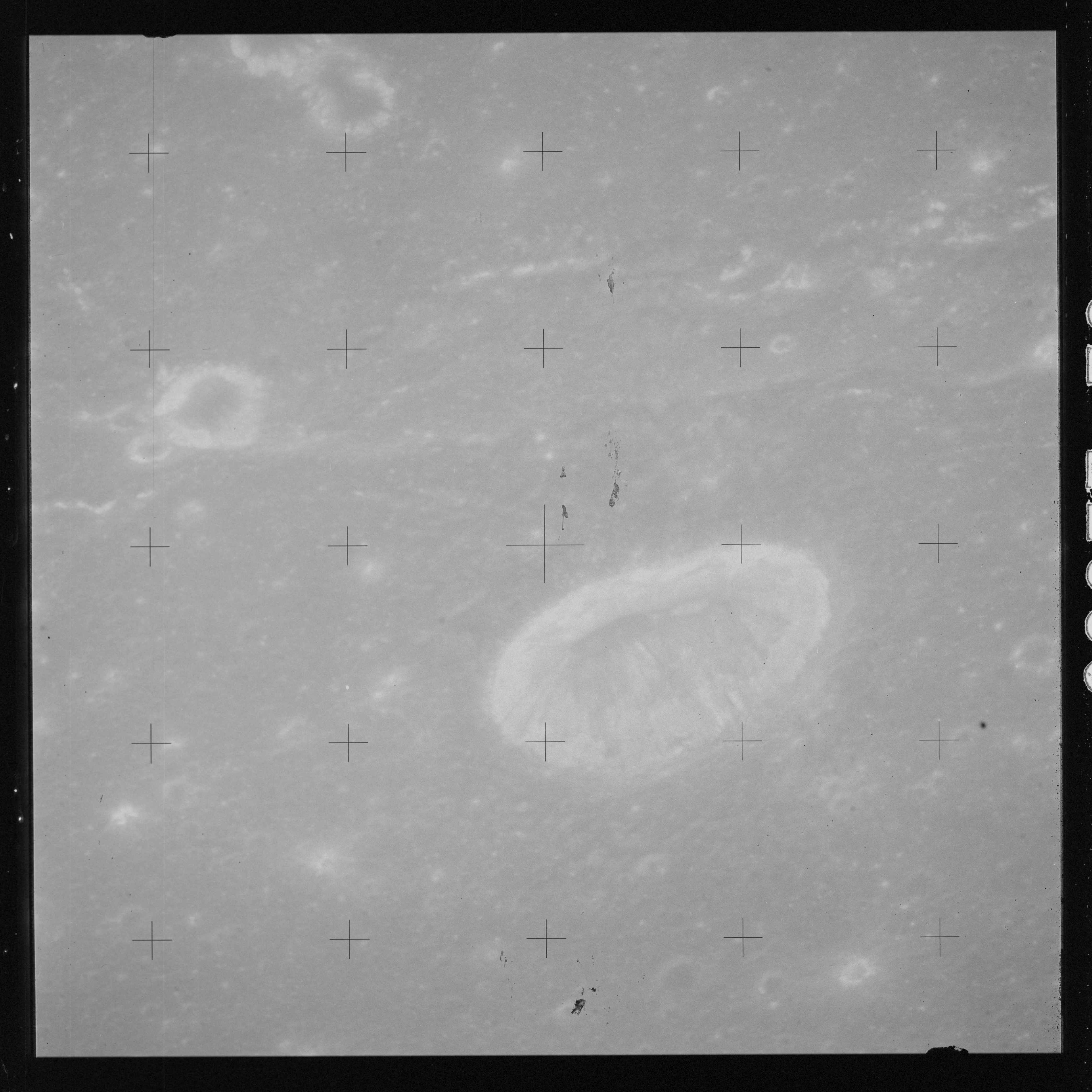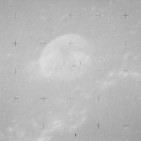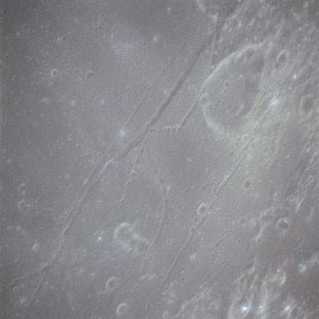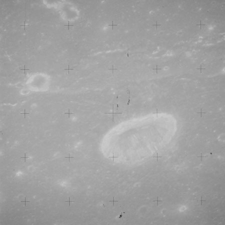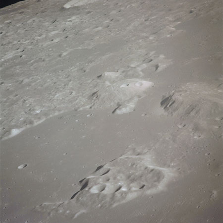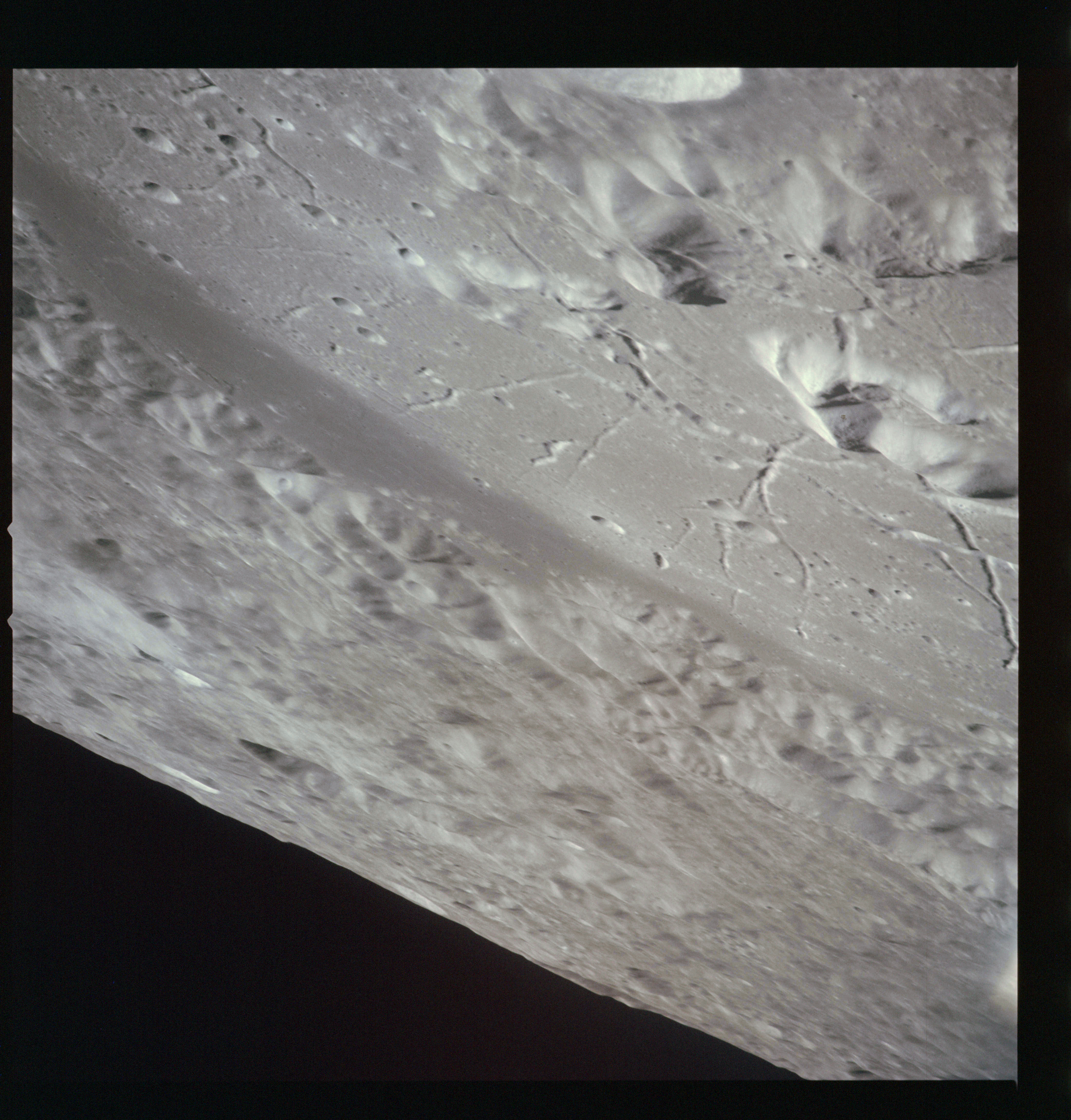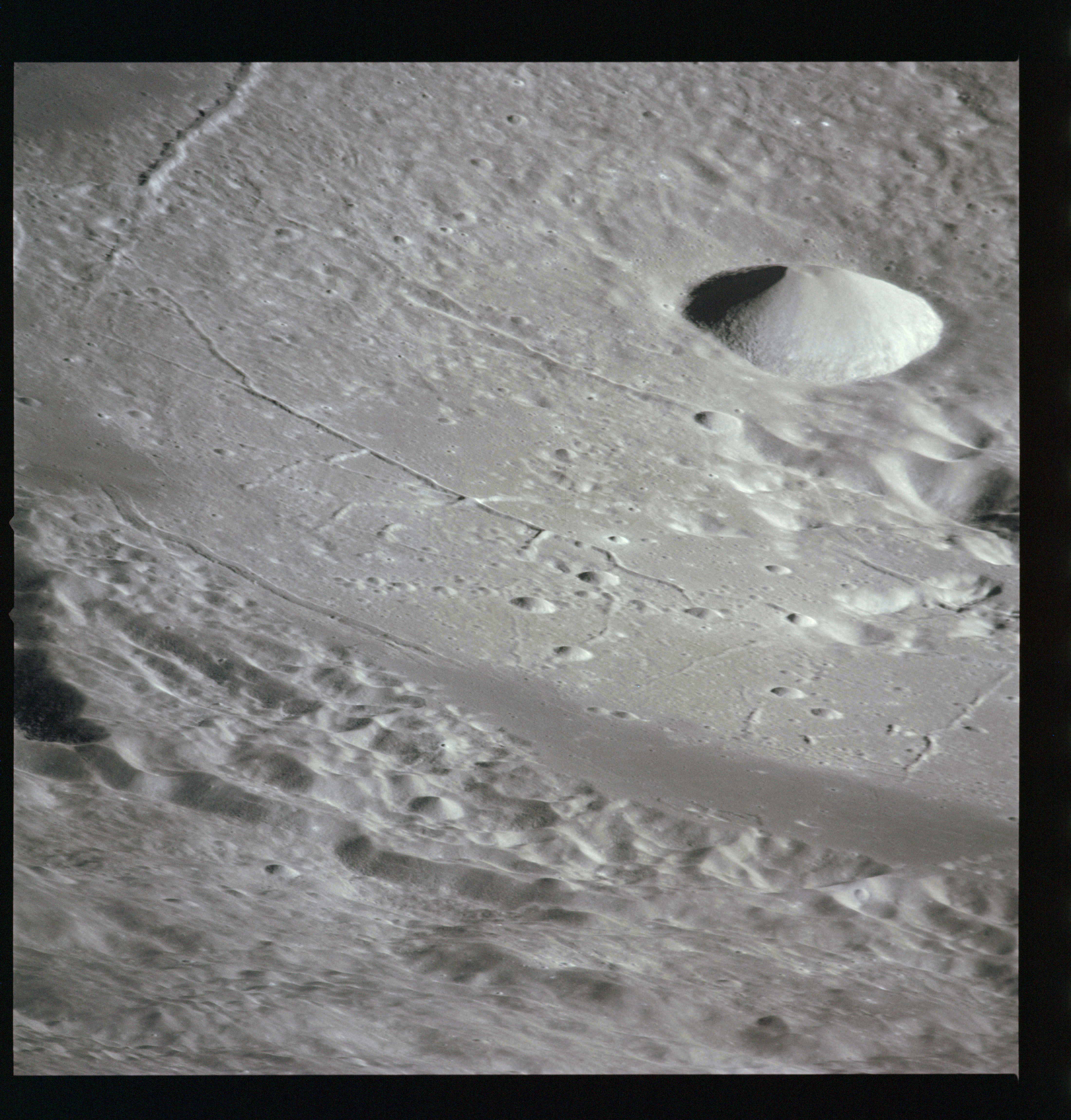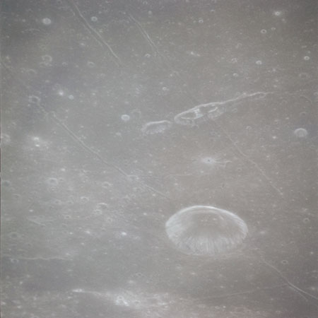 The 16-kilometre crater after which so many of these features are named is nicely framed in AS15-93-12719. Franz von Paula Gruithuisen, 1774-1852, was a German astronomer who pioneered lunar study in two opposing ways. He was the first to postulate an impact theory to explain the lunar craters, an idea now very widely accepted. However, through his active imagination, he announced the discovery of buildings and cities on the Moon, writing a book on the subject. Centuries later, there are still people who claim to detect non-human intelligent artifacts through close study of the imagery from manned and unmanned photography of the lunar surface, a concept that is very widely rejected. To the northwest of Gruithuisen is a large, dense cluster of small craters. These are likely to be secondary craters formed by the impact of a loose clump of debris, themselves ejected from a large, distant impact.