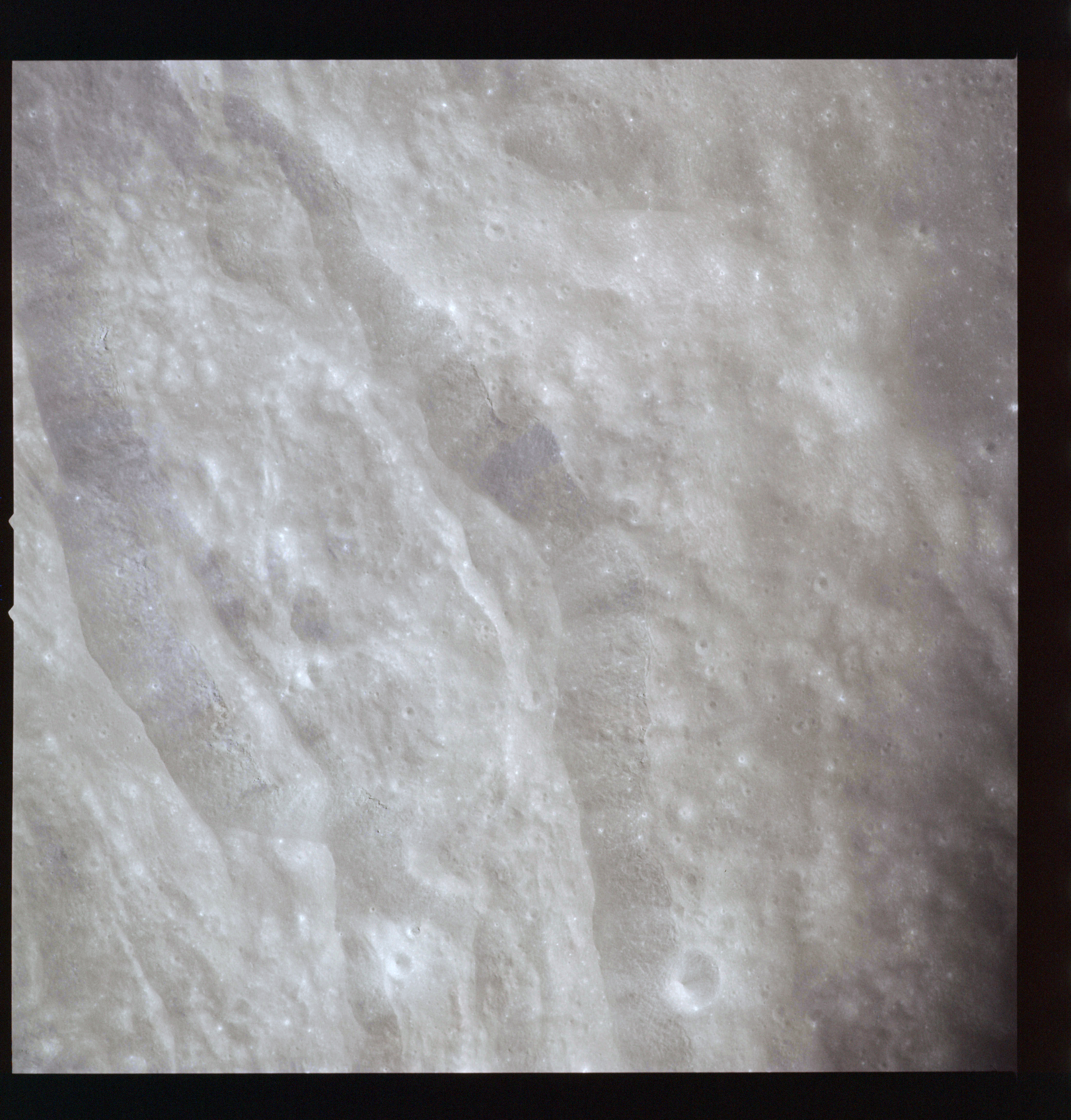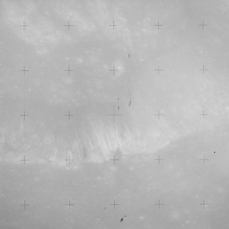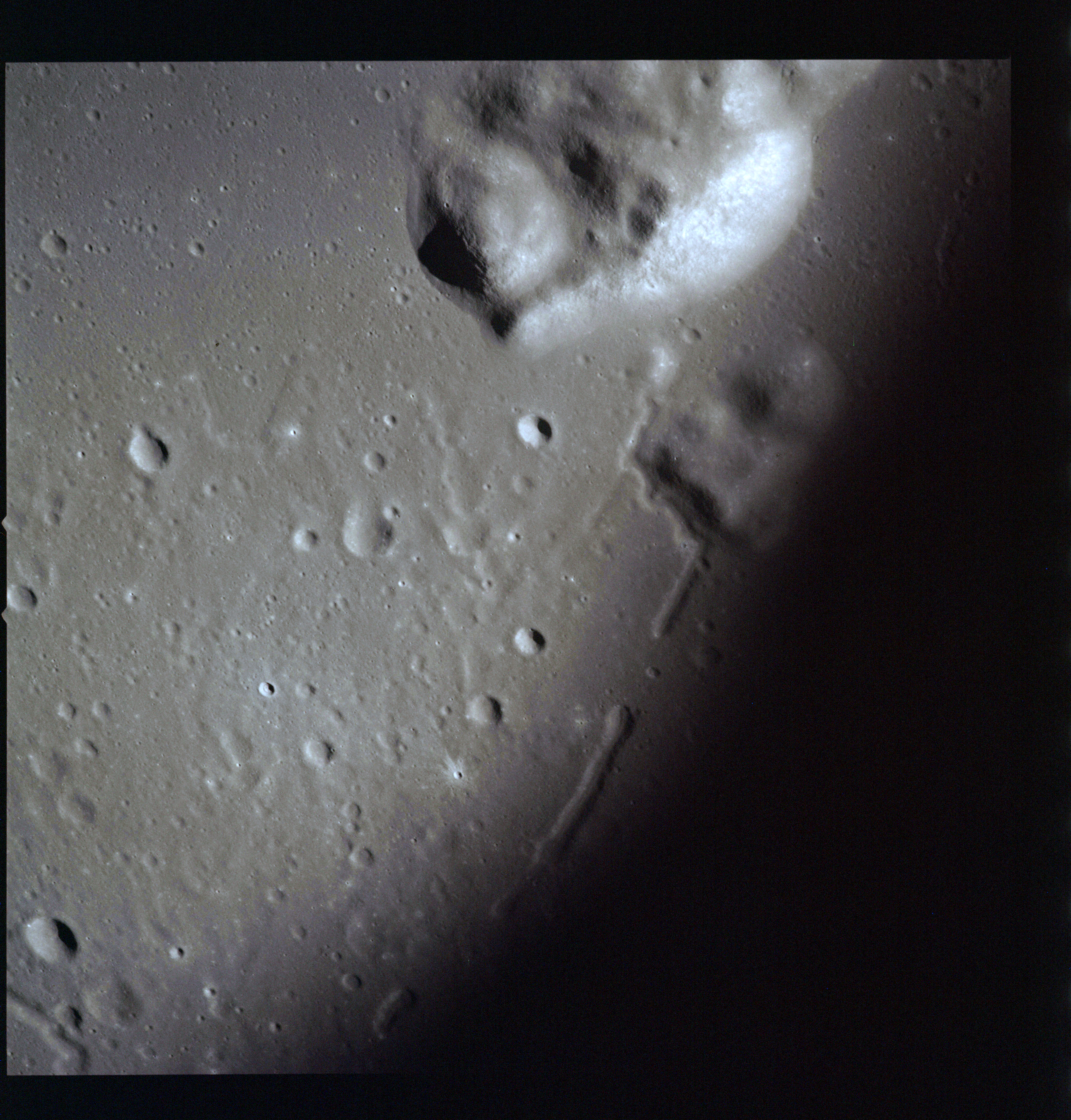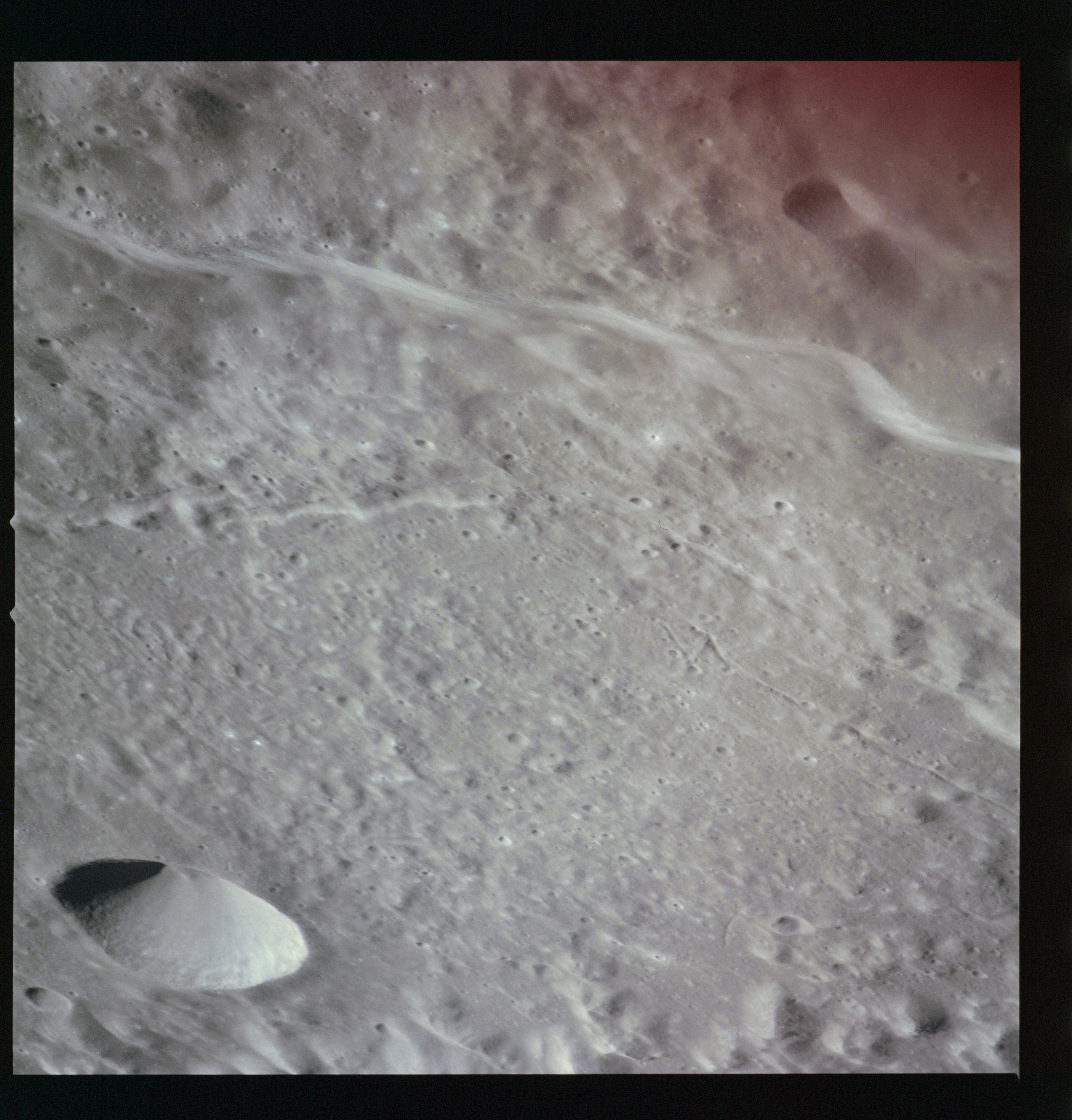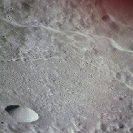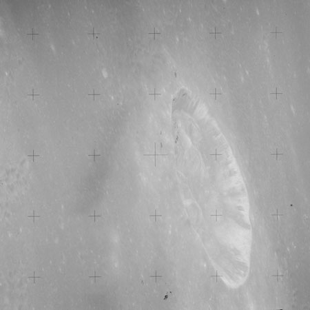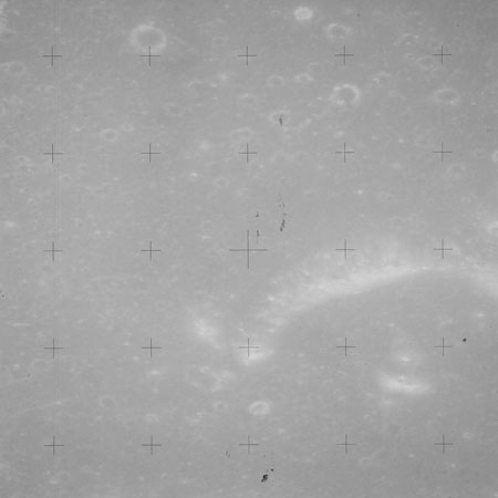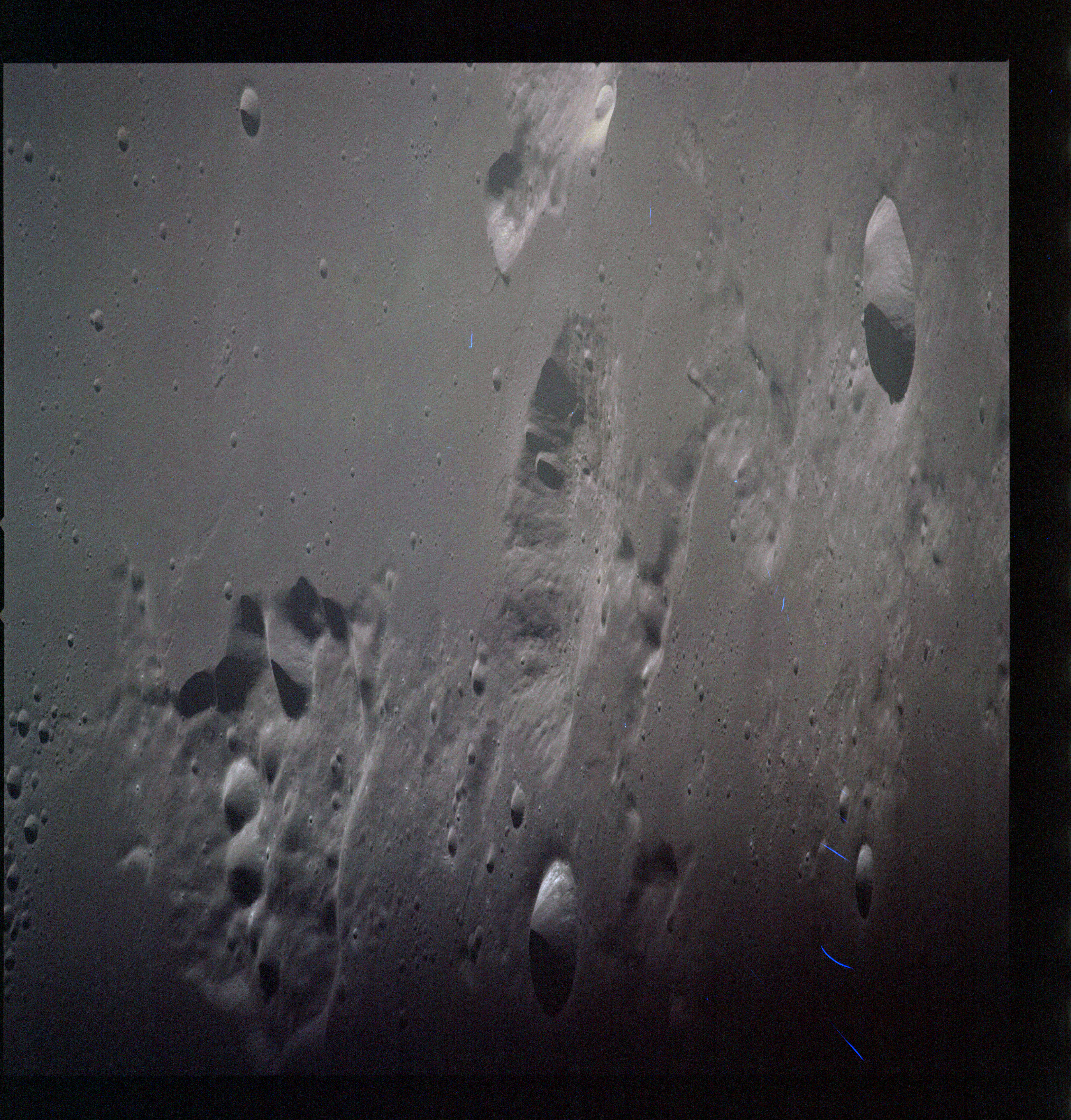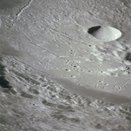The 16-kilometre crater after which so many of these features are named is nicely framed in AS15-93-12719. Franz von Paula Gruithuisen, 1774-1852, was a German astronomer who pioneered lunar study in two opposing ways. He was the first to postulate an impact theory to explain the lunar craters, an idea now very widely accepted. However, through his active imagination, he announced the discovery of buildings and cities on the Moon, writing a book on the subject. Centuries later, there are still people who claim to detect non-human intelligent artifacts through close study of the imagery from manned and unmanned photography of the lunar surface, a concept that is very widely rejected. To the northwest of Gruithuisen is a large, dense cluster of small craters. These are likely to be secondary craters formed by the impact of a loose clump of debris, themselves ejected from a large, distant impact.