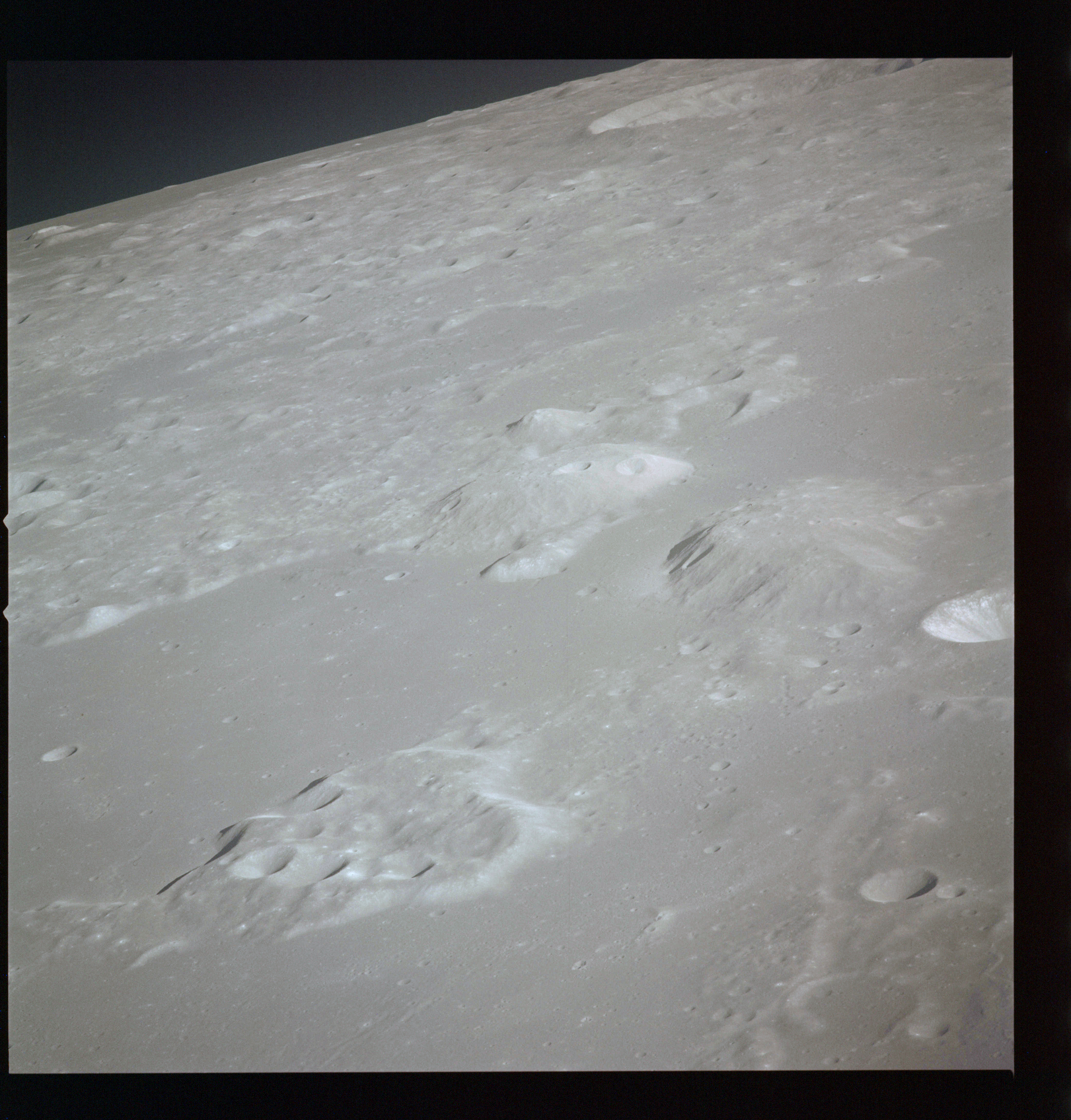 The Gruithuisen domes are well shown in AS15-93-12717 with Gruithuisen B to the right. The 900-metre craterlet atop Mons Gruithuisen Gamma is easily apparent. Mons Gruithuisen Zeta is at bottom left and is not dome-like in profile. It rises only about half of the height of the other two mountains.