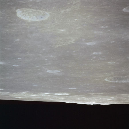 This is Apollo Control at 217 hours, 34 minutes. Endeavour's gone behind the Moon on the 71st revolution and we've had Loss Of Signal. And a Lunar Surface Science briefing is beginning now in the main MSC auditorium.