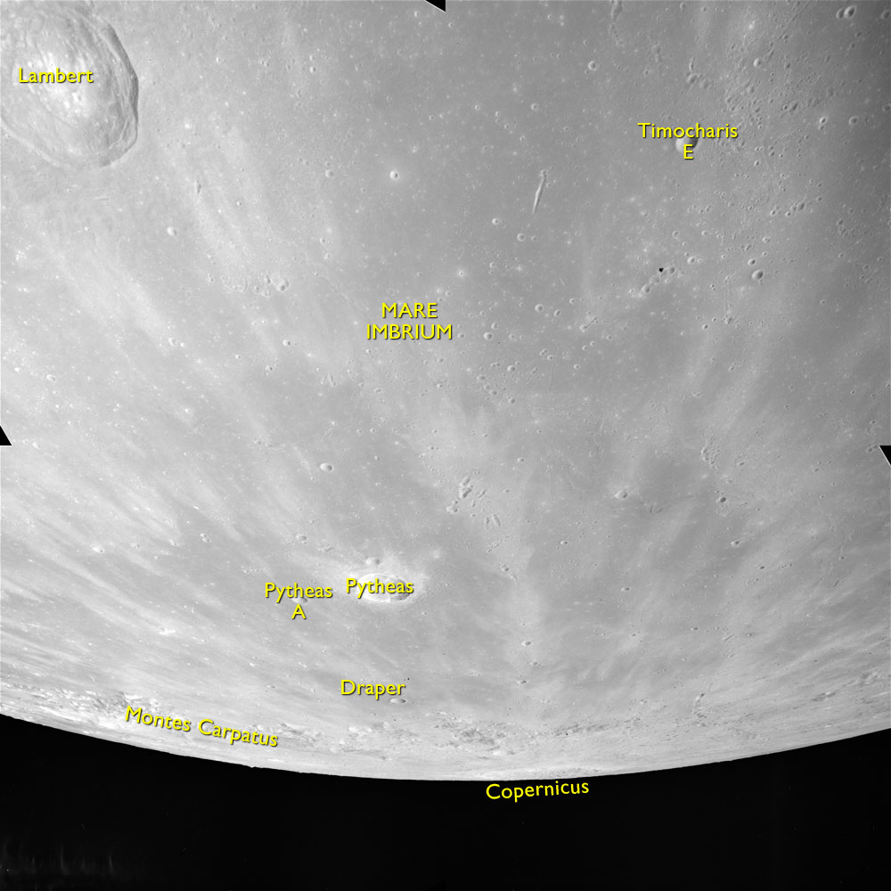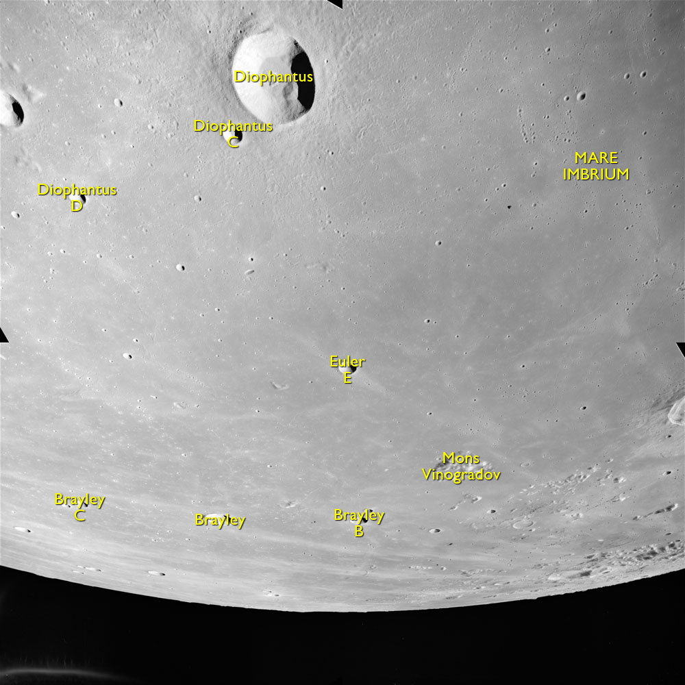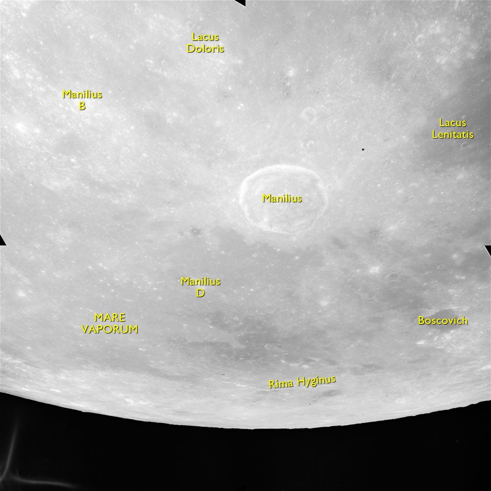 This light-toned terrain ends further south near the crater Gruithuisen, where the basalts of Mare Imbrium and Oceanus Procellarum meet. This area has some unusual features that will be the subject of much of the remaining photography.