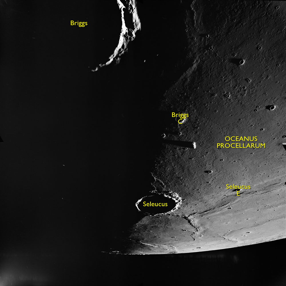 AS15-M-2622 - South oblique Metric Camera image of Oceanus Procellarum and the sunrise terminator including crater Seleucus and the sunlit eastern rim of crater Briggs. Image taken at about 217:17. (250 megapixel version), (labelled version) - Image by NASA/ASU.
