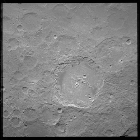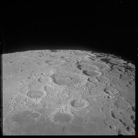 Although frame AS15-95-12980 is partially obscured, it manages to view some of the landscape near the Moon's south pole. Of particular note is Vallis Schrödinger, an enormous gash, 310 kilometres long, that cuts clean across Sikorsky crater on its way to a giant crater off the edge of the frame, also named after the Austrian physicist, Erwin Schrödinger, 1887-1961. Many of the craters towards the right of this frame have floors filled with mare-type material and are considered part of Mare Australe (Southern Sea), especially Lyot, named after a French astronomer, Bernard Lyot, 1897-1952.
