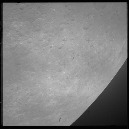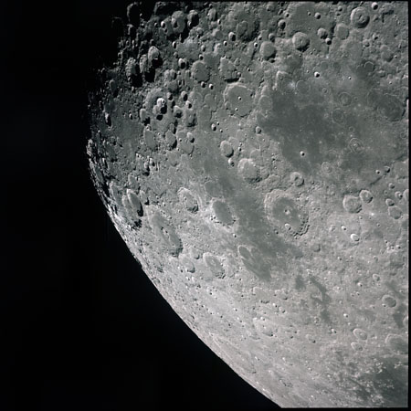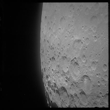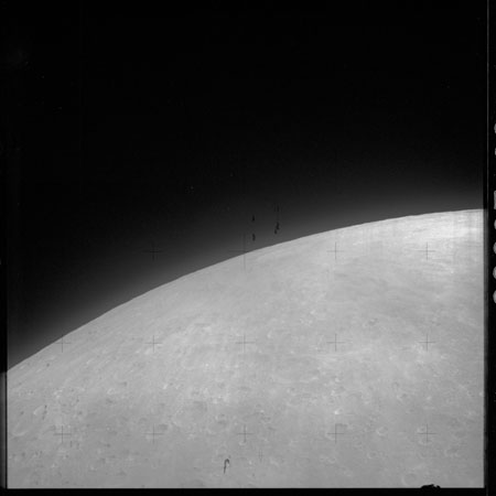 By this time, Endeavour is about 2,300 nautical miles (4,300 km) from the Moon. The occasional photography that the crew have been carrying out since TEI continues with four images taken on colour magazine Q using a 250mm lens.