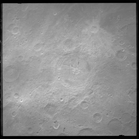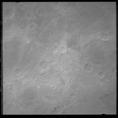 As they reach an approximate altitude of 3,600 nautical miles (6,700 km), their vantage point now permits them to see Tycho for the first time in the mission, as shown in AS15-95-12997.