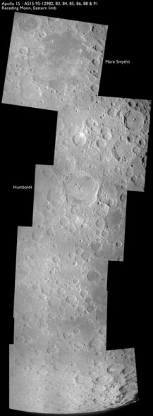 Composition of images AS15-95-12982 to 12986, 12988 and 12991 showing the easter limb area including Mare Smythii, crater Humboldt and the view towards the south - Source images by NASA/Johnson Space Center.
