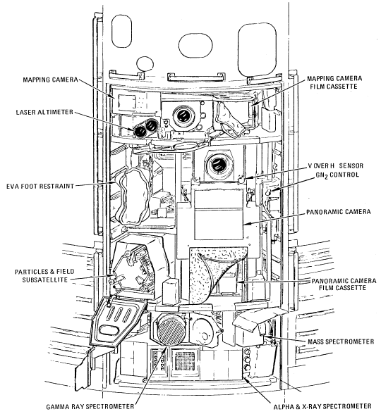 This illustration, taken from the J-mission Apollo News Reference, shows the layout of the SIM bay. The V over H sensor is to the lower right of the Panoramic Camera's lens. Though difficult to see on this picture, its plume shield is like a lens hood projecting forward. During the EVA, Al will engage his feet in the foot restraint to the left. Facing right, he will have access to the majority of the bay, particularly the film cassettes which he must retrieve.