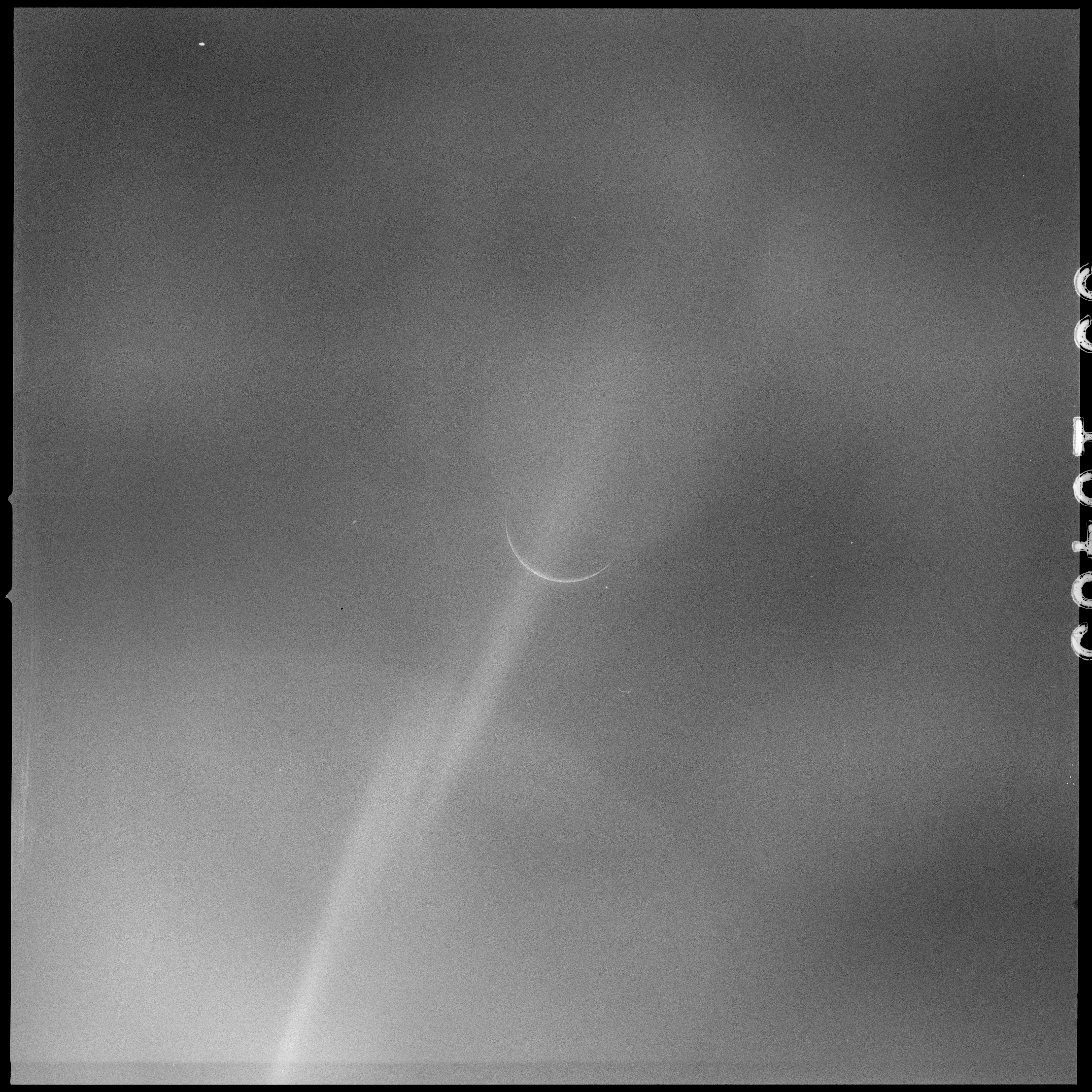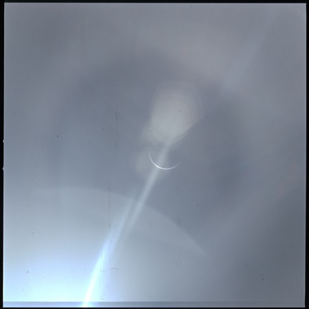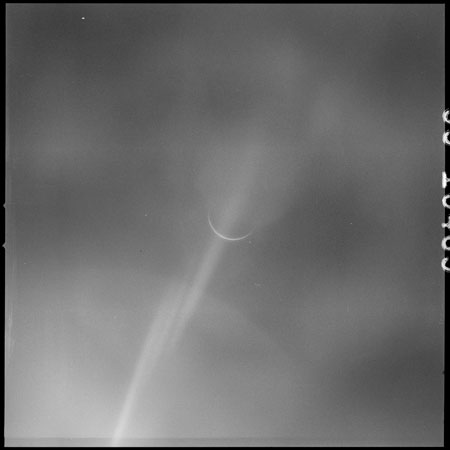 Eight images, AS15-99-13483 to 13490 are planned in this sequence; two each through four filters. In the pair taken through filter 2, the crescent Earth is virtually invisible. Other images in the sequence do show Earth better but a streak of flare, probably caused by the Sun reflecting off wipe marks on the window, runs across the images. With Earth presenting such a thin crescent, the Sun is very near the camera's field of view and causes a lot of light spill. An additional colour frame on magazine Q is taken for comparison. By measurement of the size of Earth's image on the film, the spacecraft's distance is calculated to be about 112,000 nautical miles (207,500 km).