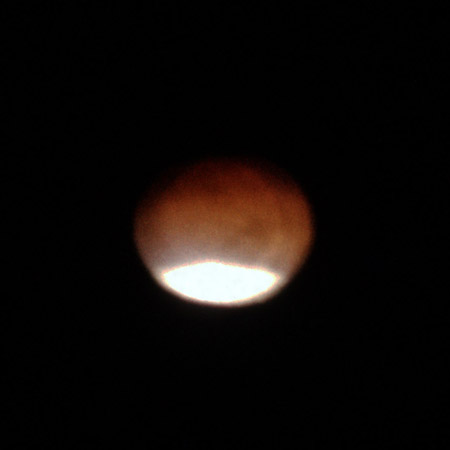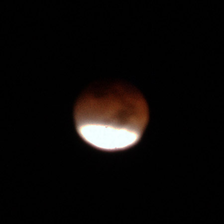 Once the Moon has completely entered the umbra, it is no longer lit directly by the Sun. However, if Dave and Jim were to be standing at Hadley Base at this time (and thankfully, they aren't) they could look up at the Earth/Sun position and see a truly awe-inspiring sight of 40,000 kilometres of sunset/sunrise all around Earth forming a ring of gold in the sky. During this moment, and depending on atmospheric conditions on Earth, this golden ring is often seen to turn the eclipsed Moon a dark, copper brown colour.