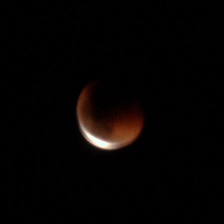 One interesting point to note in these photographs is the apparent shape of the shadow as it crosses the Moon. As seen from Earth, the effect of the Moon's spherical shape on the shadow can be ignored because it is being viewed from the same vantage point as the source of the shadow. Indeed, the apparent curvature of Earth's shadow is a very simple proof that Earth is round. Endeavour, however, is providing a new vantage point for this event, well off to the side of the Earth/Moon line. The spherical shape of the Moon alters the apparent line of Earth's shadow such that at the start of the eclipse, the curve of Earth is more than cancelled out. In two hours time, when the exiting Moon is photographed again, the shape of the Moon will reinforce the curve of Earth and produce a very strong crescent effect. Note also that the shaded part of the Moon has a reddish hue.