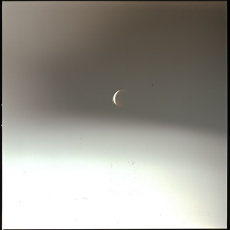 271:03:40 Scott: Houston, the Moon is an orange ball, now - a dull orange ball with a sort of a gray area in the center on - on one side opposing the side that's slowly coming into illumination at the present time, and you'll probably get more and more of the lunar surface exposed to sunlight as we go along here. The picture you have is really pretty good for what we see, because there's very little illumination on the Moon. And only when we get the cockpit lights down reasonably low and get our face up in the window can we see the definition. So it's really not a bad picture.