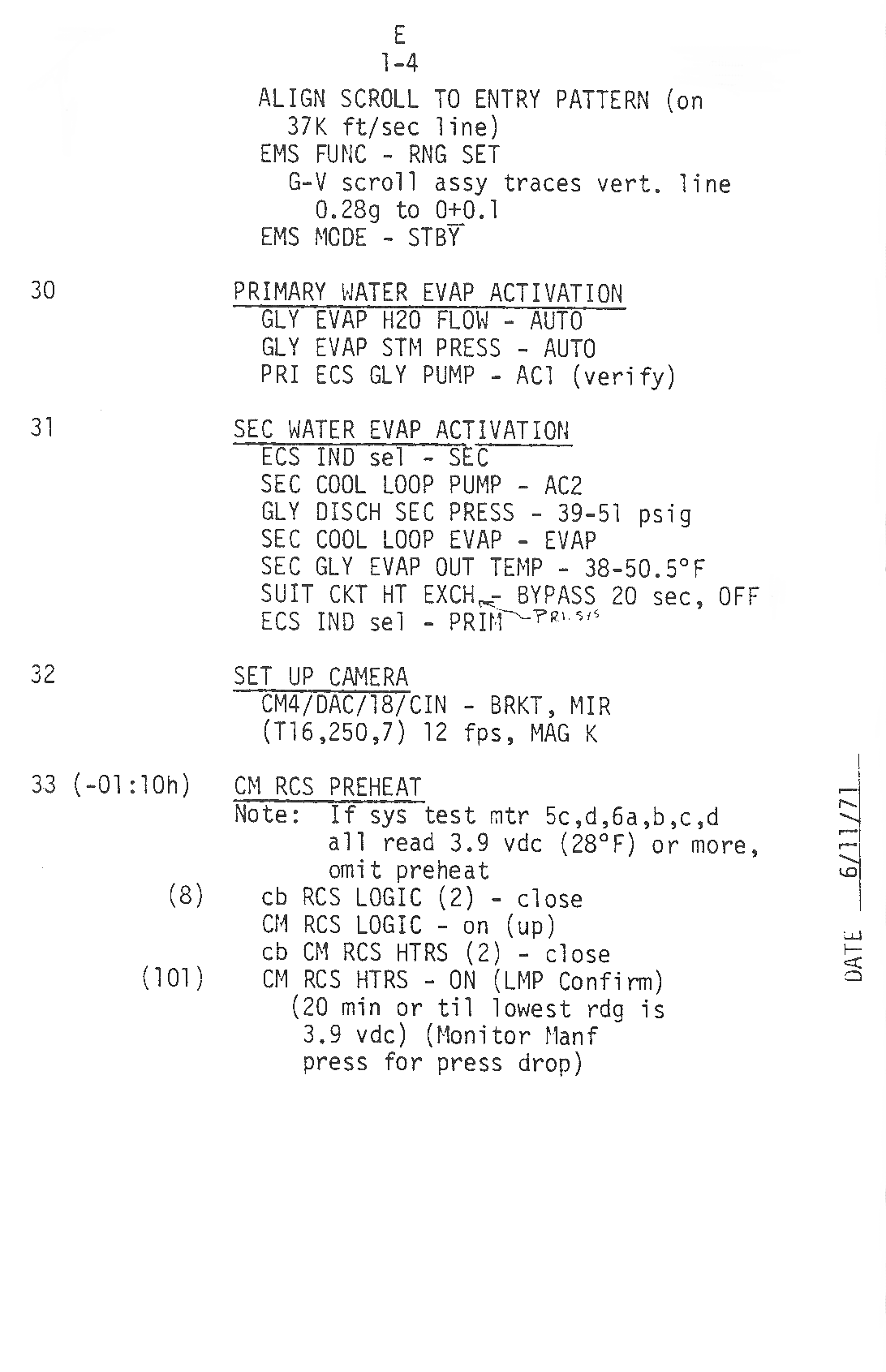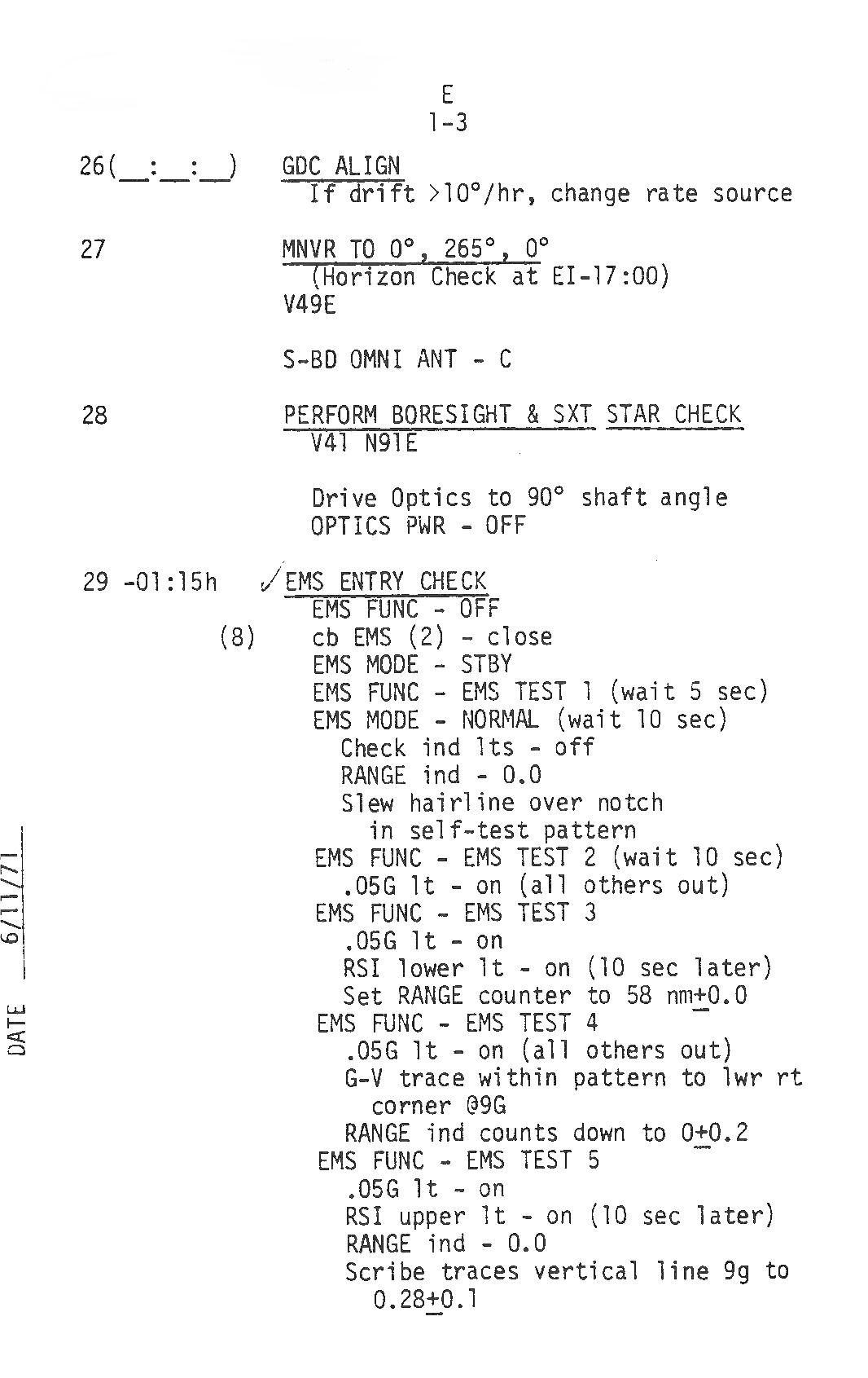 289:34:06 Parker: Okay. And next, on the second line under the Noun 68, there's a comment that says "negative [if plus: EMS]." And there's a certain amount of happiness with that statement down here. They say that you can have a positive H dot in P67 nominally and, therefore, the statement on the cue card that this is a fail indication is not a good idea. I understand [Apollo 15 backup CMP] Vance [Brand] discuss[ed] this with Al beforehand.