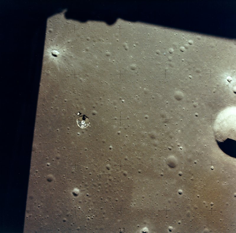 Half of a stereo pair taken just west of the landing site. Crater Conon is at the bottom of the frame, Rima Hadley and Hadley C crater are near the centre and north of the Fresnel Rilles, the fading rays from the large crater Autolycus are visible on the surface of Mare Imbrium. The crater itself is just off to the left of the image.AS15-9816P.jpg (815k)