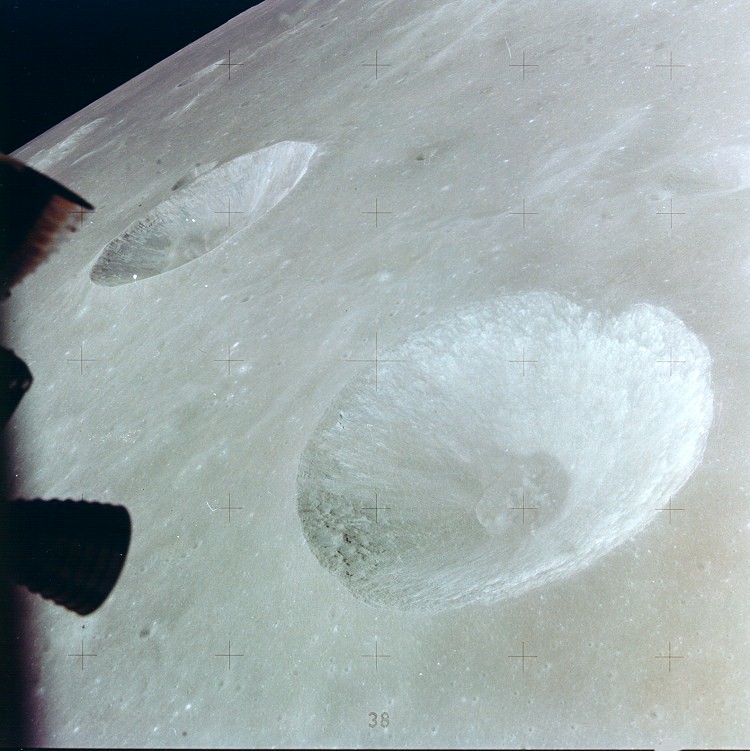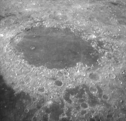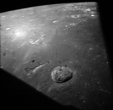 Dawes Crater (diameter 18 km) between the Seas of Serenity and Tranquillity.AS15-9811P.jpg (784k)