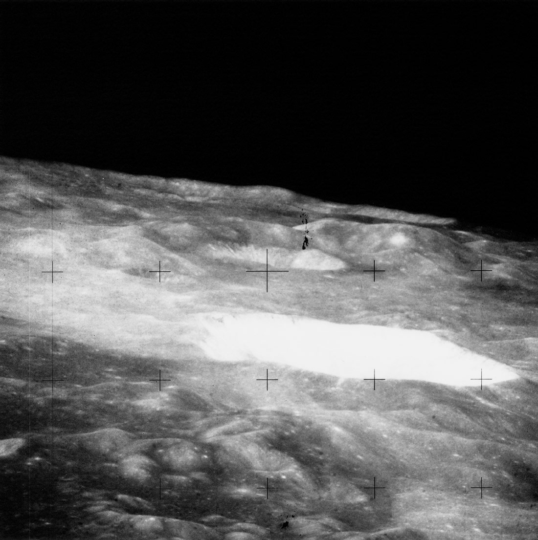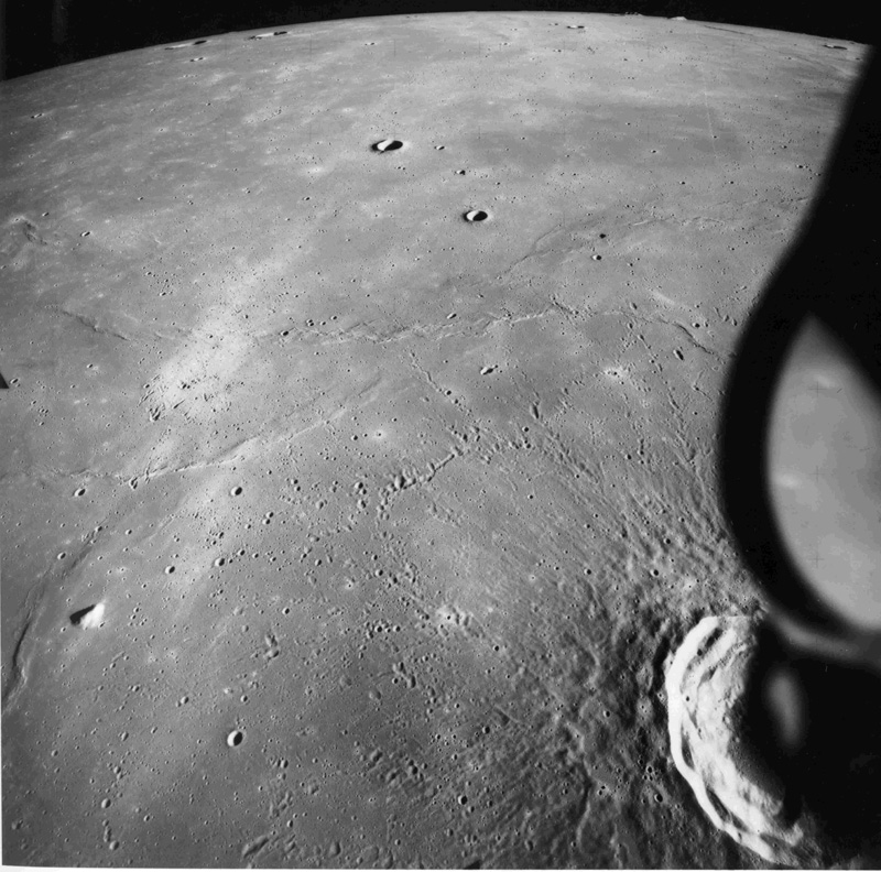 Palus Putredinus with one of the peaks of the Apennine Front to the south. Rima Bradley, a graben-type rille, is near the centre of the frame.AS15-9800P.jpg (1.29 MB)