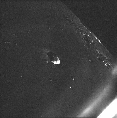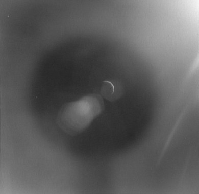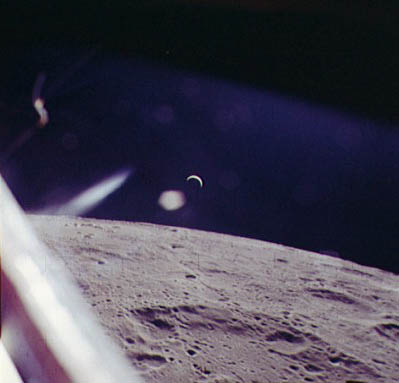 Earth, barely discernible. The proximity of the Sun to the camera's field of view is apparent in this frame with the Earth barely visible as a faint crescent in the central iris reflection.AS15-99-13482.jpg (16k)