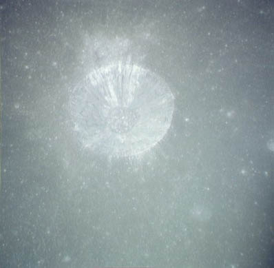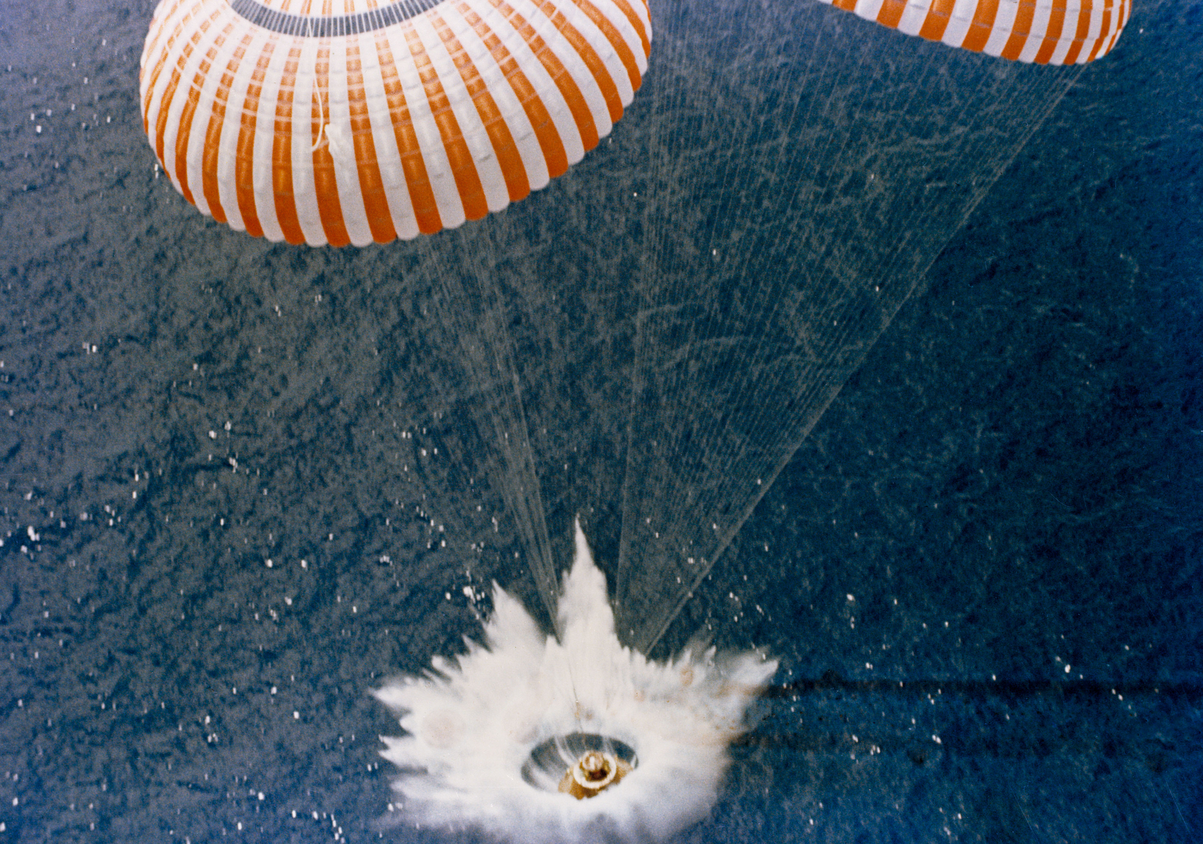 This picture freezes the dramatic instant of splashdown at 20:45 GMT on August 7, 1971, and reveals the Command Module pounding a textbook-perfect impact crater into the water of the Pacific Ocean. Liquid crater ejecta flies radially from the impact site. The Command Module landed more heavily than usual owing to the failure of one of its parachutes to open (32 feet per second; normally 28 fps under three inflated canopies).AP15-71-H-1242.jpg (91k)